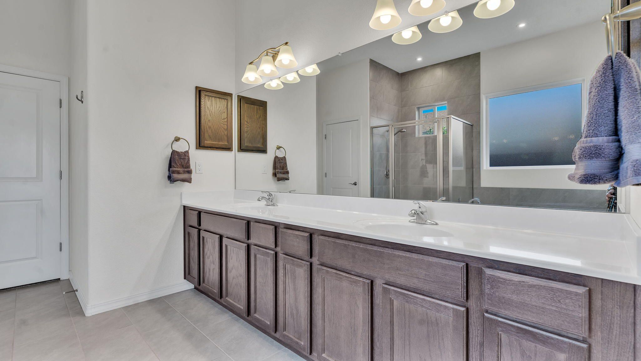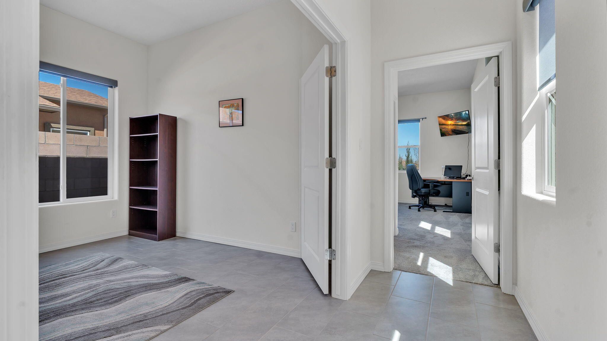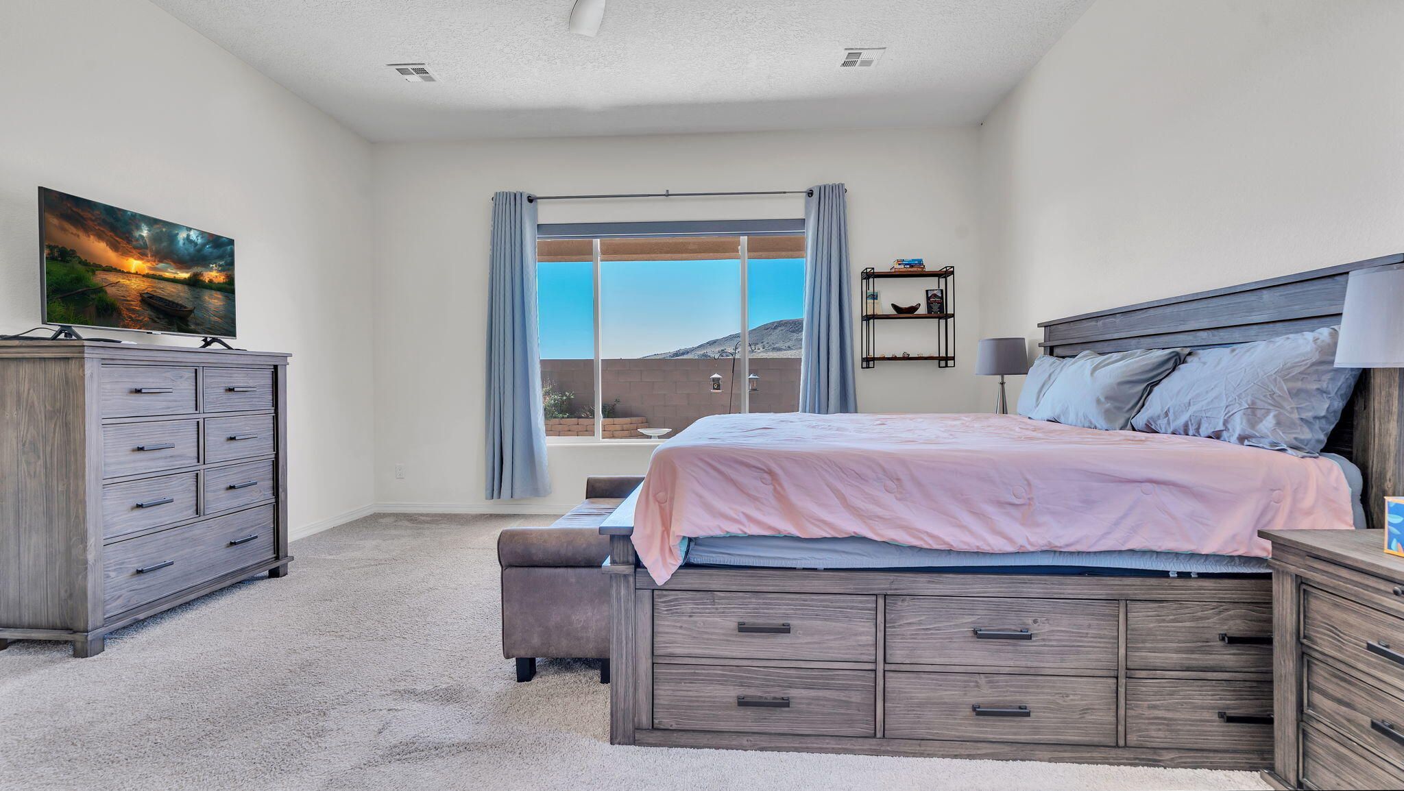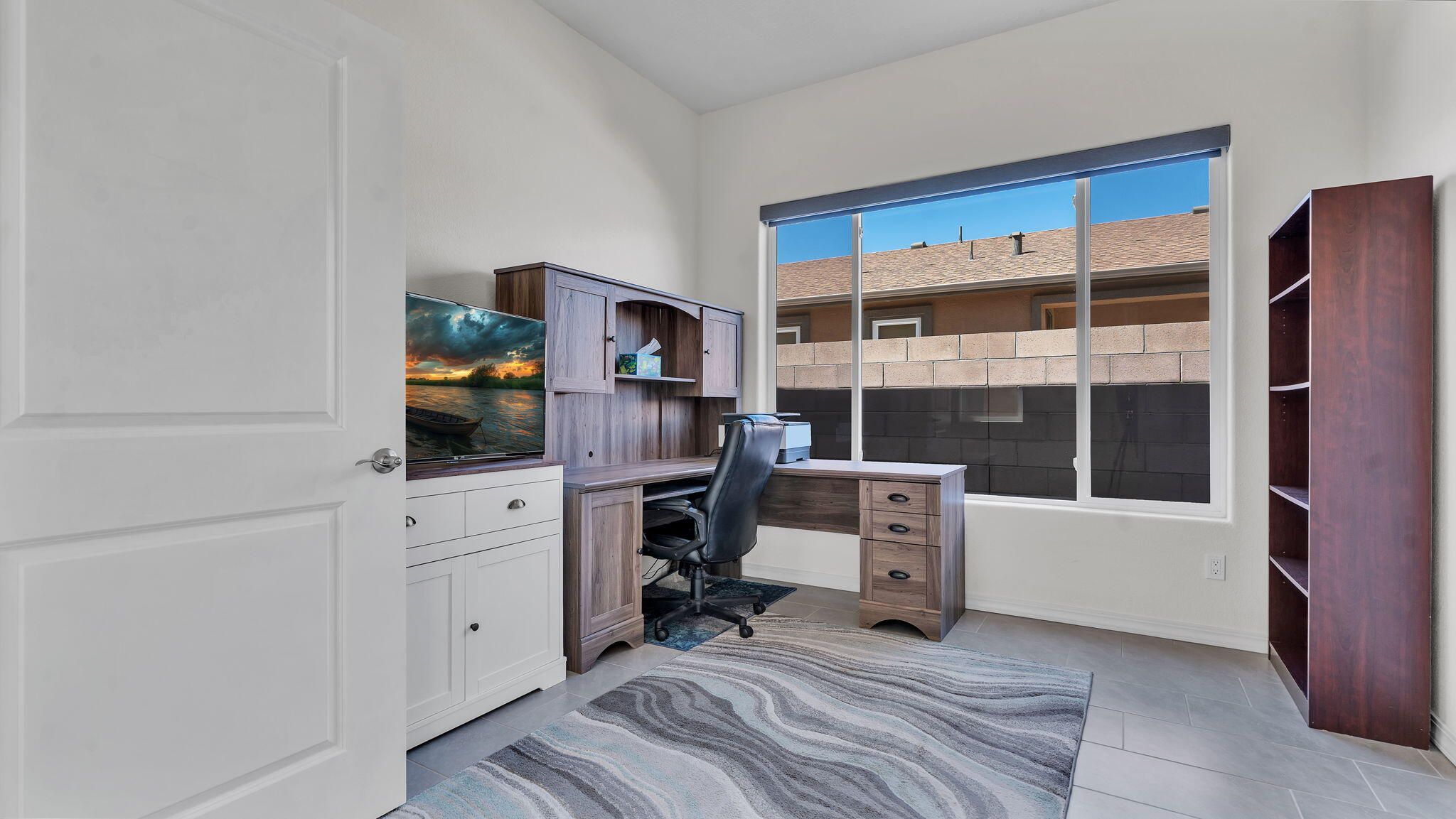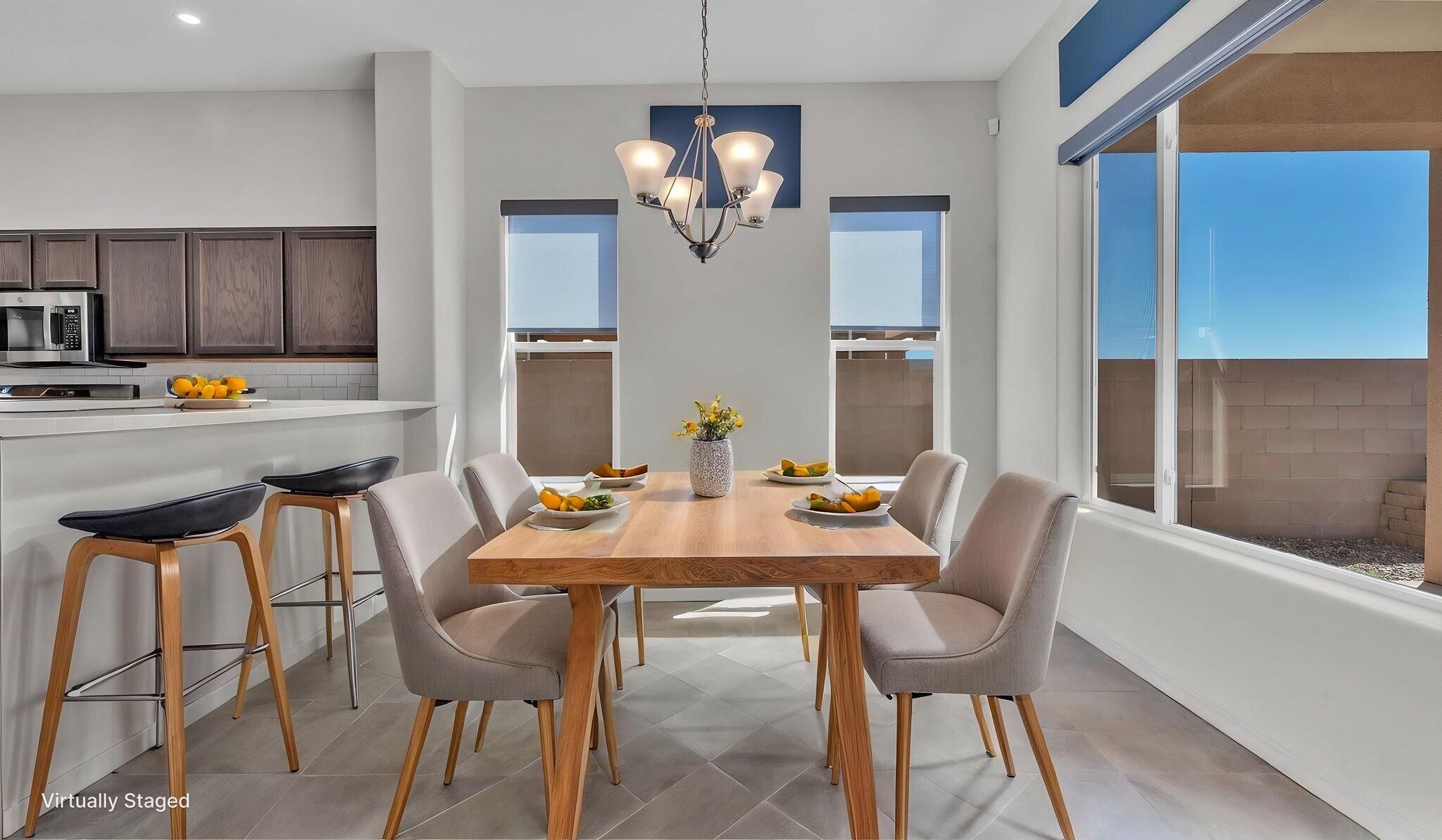 Experience refined, low-maintenance living in this pristine home featuring unobstructed views of El Cerro de Los Lunas. Avoid the upkeep of older properties with this 5 year old move in ready retreat, where over $20,000 in premium Graber blinds and professional landscaping are already in place. The open concept interior is designed for both style and privacy. A chef's kitchen, complete with quartz countertops, a spacious island, and stainless appliances flows seamlessly into the light filled living area. The thoughtful layout ensures maximum independence, as both the owner's suite and the second bedroom feature dedicated ensuite bathrooms, creating private sanctuaries for residents and guests alike. Outdoor living is a highlight, including an easy care backyard for effortless maintenance