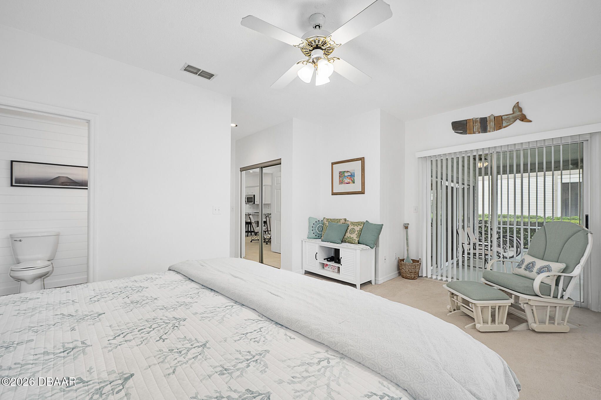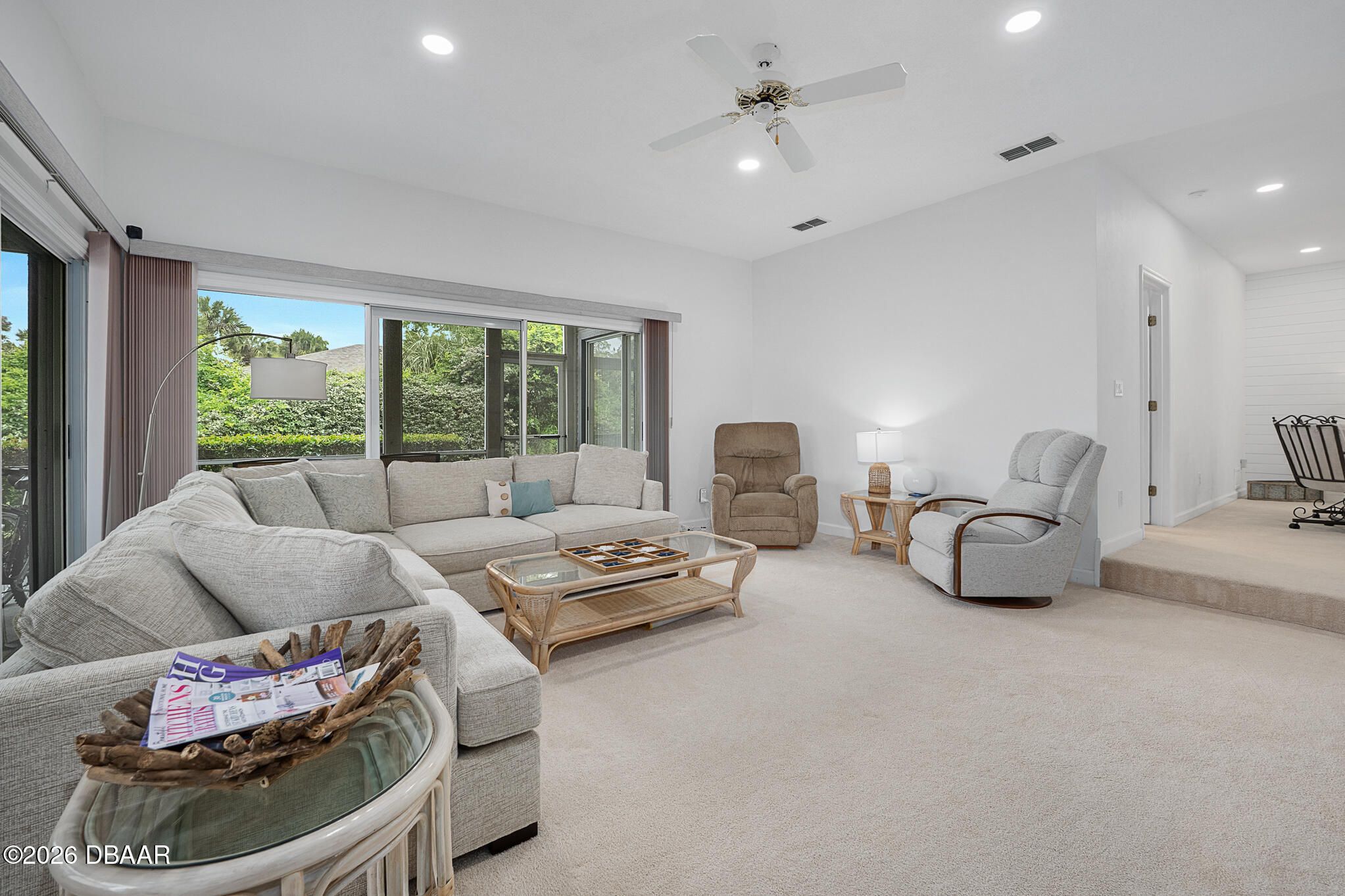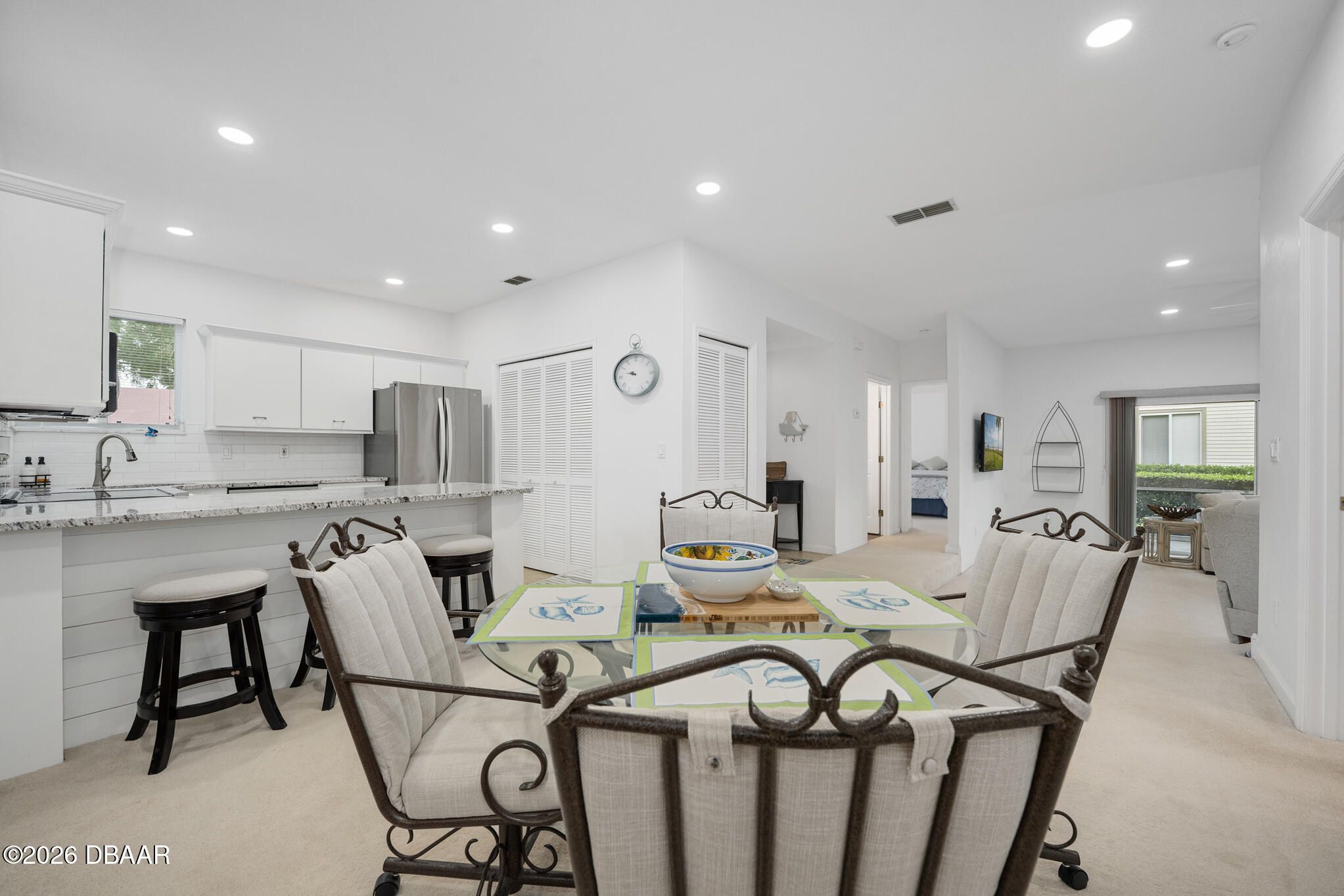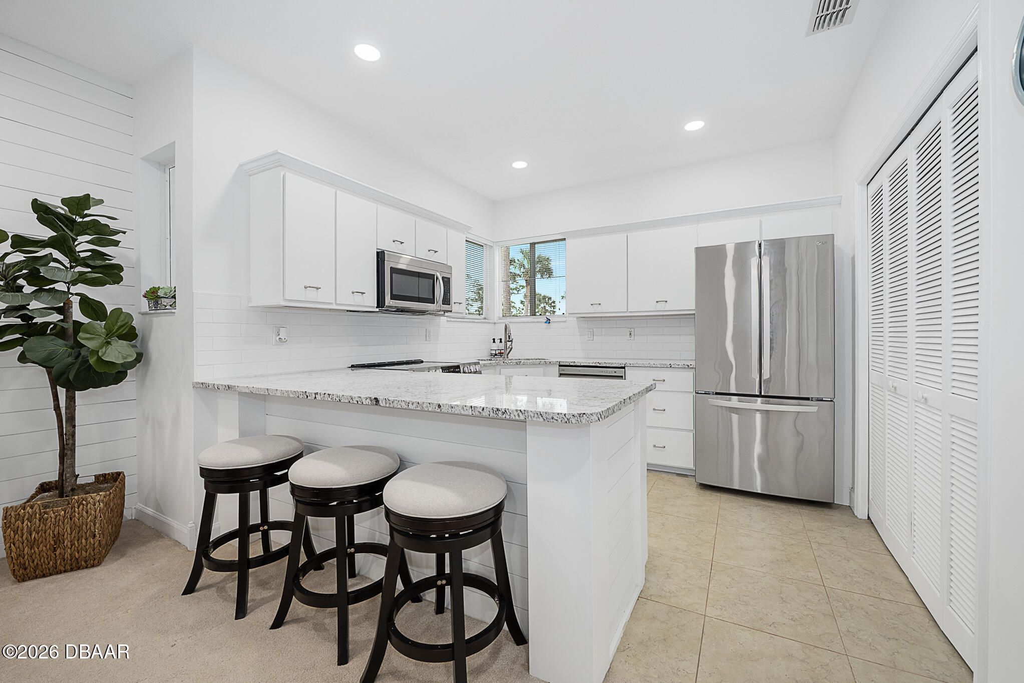 Welcome to this beautifully updated condo offering the perfect blend of style, comfort, and maintenance-free living. This move-in ready home has been thoughtfully upgraded throughout, making it ideal for full-time residents or seasonal buyers. The updated kitchen features granite countertops, refinished cabinetry, and sleek stainless steel appliances including a range, microwave, dishwasher, and refrigerator. A classic subway tile backsplash, oversized sink, and new LED recessed lighting complete this bright and functional space. Both bathrooms have been tastefully renovated with updated fixtures, reglazed tub and shower areas, new toilets, and stylish vanity lighting. The primary suite includes a double sink vanity and durable luxury vinyl plank flooring, while shiplap and barn board wall accents add warmth and character throughout the home. Additional improvements include new LED recessed lighting in the living and dining areas, new ceiling fans in the living room and bedrooms, and a new hot water heater installed in April 2026. The interior has been fully painted within the last two years, and new window blinds and sliding door vertical blinds have been installed in both bedrooms. Enjoy true maintenance-free living in a desirable Ormond Beach location, just minutes from beaches, golf, dining, and shopping.Plantation Bay Golf & Country Club offers a lifestyle centered around leisure, recreation, and comfort. Members enjoy access to 45 holes of championship golf, along with 10 Har-tru tennis courts and 10 pickleball courts, plus two newly updated bocce courts. The wellness center provides a full-service spa, a gym, group exercise studio, two swimming pools, and a relaxing cabana bar. The new Founders Club enhances the experience with dining, social events, and gathering spaces. All amenities are available through optional club membership.