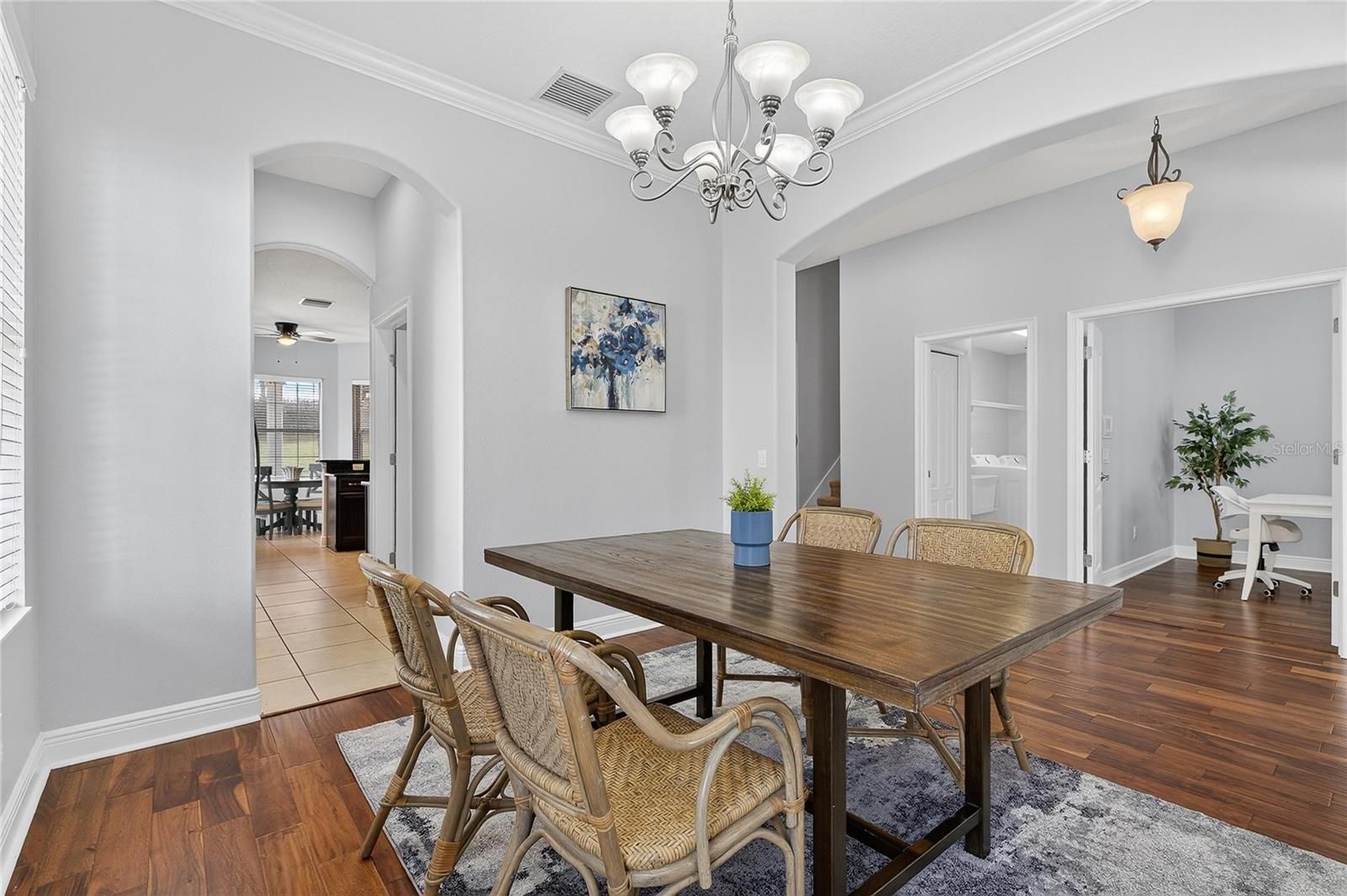 - Ceiling Fan(s), Crown Molding, High Ceilings, Open Floorplan, Main Level Primary, Solid Surface Counters, Solid-Wood Cabinets, Thermostat, Walk-In Closet(s)