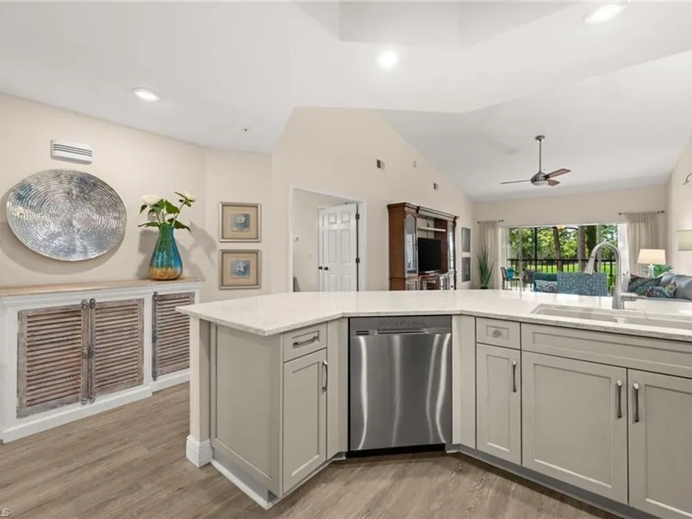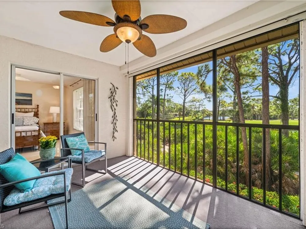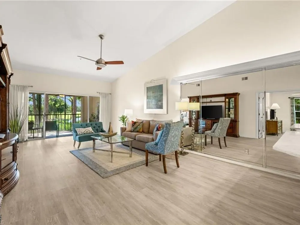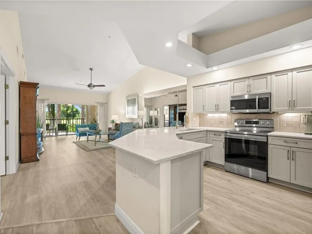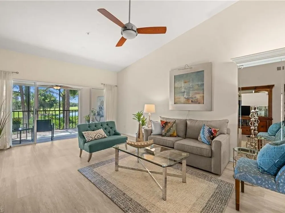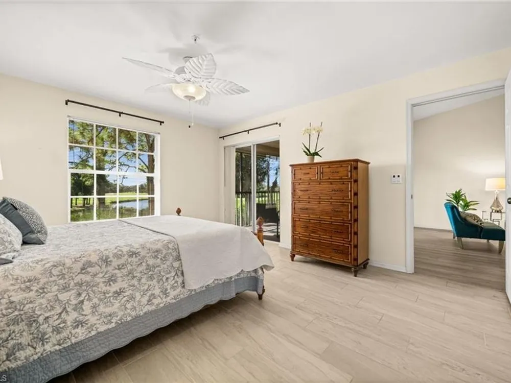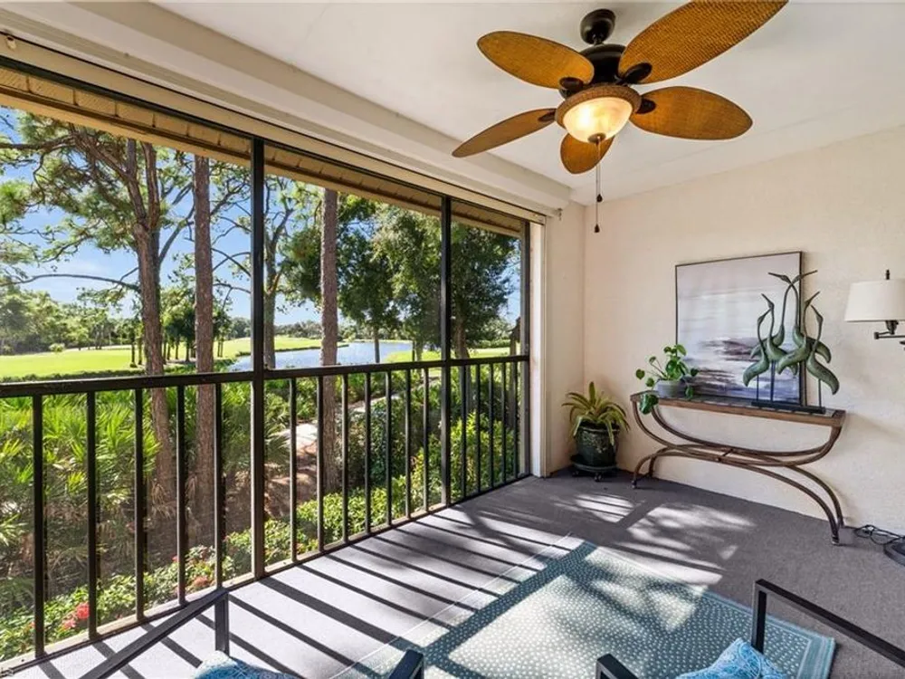 Welcome to 4101 Sawgrass Point Drive #201, a luxuriously renovated end-unit residence with third bedroom plus flexible breakfast room/office, and breathtaking lake and golf views. Passing through the sun-kissed courtyard and parting the front door, one is immediately welcomed by soaring vaulted ceilings and a degree of natural lighting only a second-floor end-unit could provide. The central open kitchen unifies and elevates surrounding living spaces, featuring quartz countertops, crisp shaker cabinetry, and stainless steel appliances. Warm-toned wood-look flooring stretches wall-to-wall, a market favorite, while primary suite showcases freshly updated shower and quartz countertops, and guest suite has a new vanity of its own. This versatile floor plan includes both a flexible breakfast room and separate third bedroom/bonus room that can be reconfigured to suit one’s needs, spaces that we’ve seen used as extra bedrooms, studios, dining rooms, bunk rooms, offices, and home gyms. Perhaps most noteworthy of all is the view: tucked among the treetops, unparallelled panoramic views spanning two signature holes of golf, multiple bodies of water, and a whole host of wildlife and native entertainment. This is one of the single most mesmerizing views of any condo we’ve had the privilege of visiting in Pelican Landing, and the photos do not do it justice—must see in person. No special flood zone; no history of flooding; electric roll-down hurricane protection on lanai for peace of mind. In addition to Sawgrass Point's resort style pool and spa, Pelican Landing residents enjoy world-class amenities, including a 34-acre private island beach club, gulf access sailing, kayaking, and boat ramp, 12 Har-Tru tennis courts, pickleball, bocce, and a fitness center. This home is conveniently located within walking or biking distance to the community center, grocery store, pharmacy, and numerous casual and fine dining options. Additionally, optional memberships are available at The Nest Golf Club, featuring 36 holes of championship golf and a newly renovated clubhouse. Waitlists due to high demand at The Nest may apply. Schedule your private showing today!