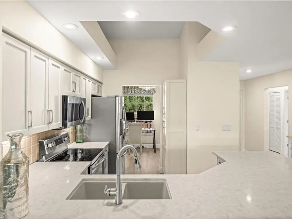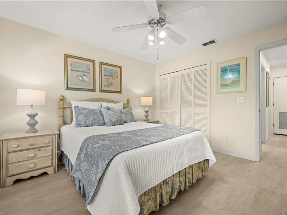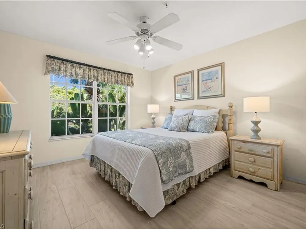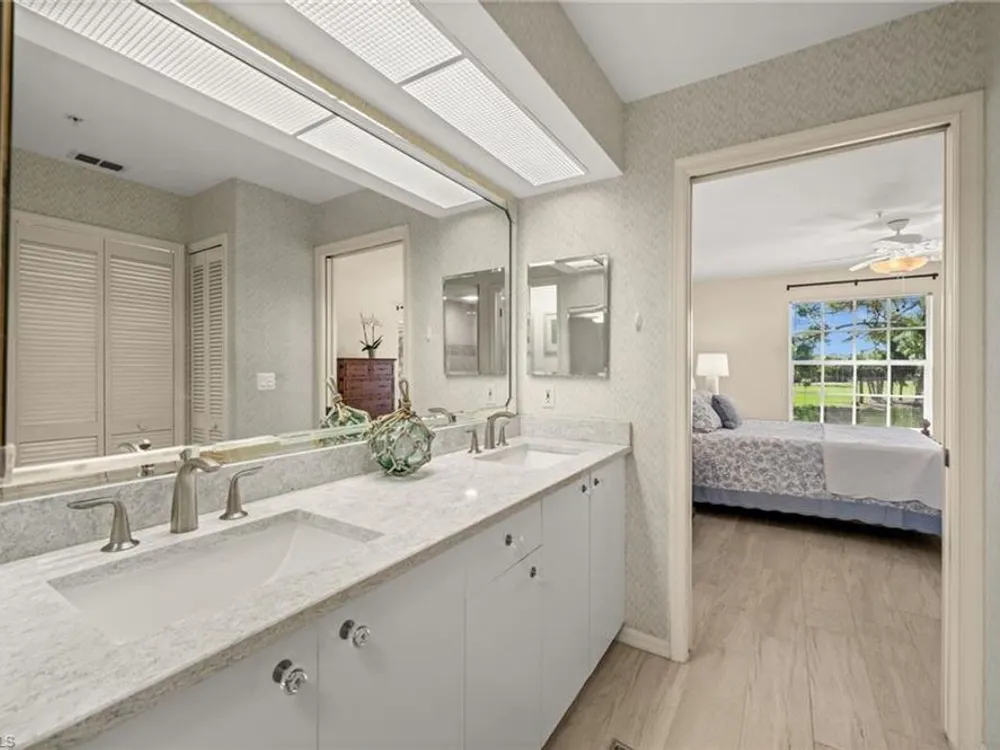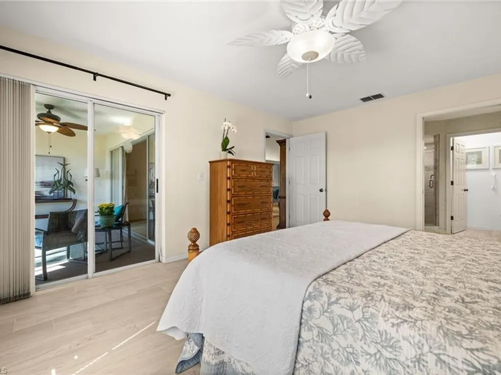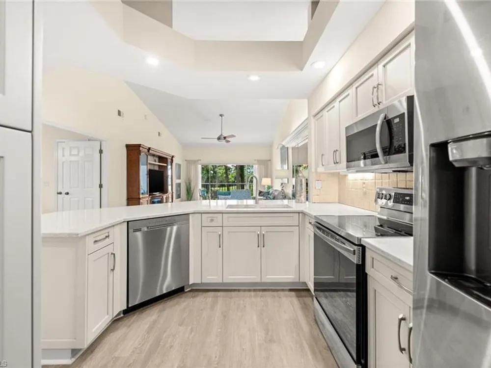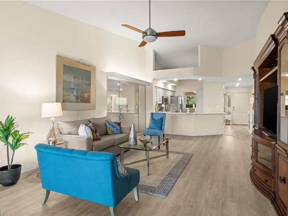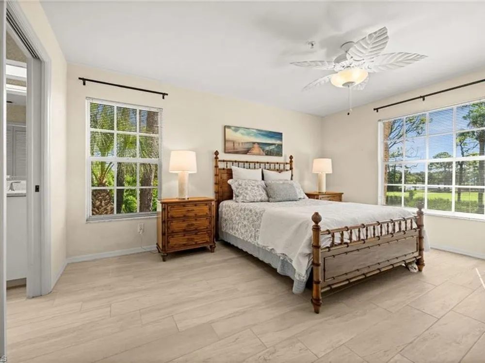Welcome to 4101 Sawgrass Point Drive #201, a luxuriously renovated end-unit residence with third bedroom plus flexible breakfast room/office, and breathtaking lake and golf views. Passing through the sun-kissed courtyard and parting the front door, one is immediately welcomed by soaring vaulted ceilings and a degree of natural lighting only a second-floor end-unit could provide. The central open kitchen unifies and elevates surrounding living spaces, featuring quartz countertops, crisp shaker cabinetry, and stainless steel appliances. Warm-toned wood-look flooring stretches wall-to-wall, a market favorite, while primary suite showcases freshly updated shower and quartz countertops, and guest suite has a new vanity of its own. This versatile floor plan includes both a flexible breakfast room and separate third bedroom/bonus room that can be reconfigured to suit one’s needs, spaces that we’ve seen used as extra bedrooms, studios, dining rooms, bunk rooms, offices, and home gyms. Perhaps most noteworthy of all is the view: tucked among the treetops, unparallelled panoramic views spanning two signature holes of golf, multiple bodies of water, and a whole host of wildlife and native entertainment. This is one of the single most mesmerizing views of any condo we’ve had the privilege of visiting in Pelican Landing, and the photos do not do it justice—must see in person. No special flood zone; no history of flooding; electric roll-down hurricane protection on lanai for peace of mind. In addition to Sawgrass Point's resort style pool and spa, Pelican Landing residents enjoy world-class amenities, including a 34-acre private island beach club, gulf access sailing, kayaking, and boat ramp, 12 Har-Tru tennis courts, pickleball, bocce, and a fitness center. This home is conveniently located within walking or biking distance to the community center, grocery store, pharmacy, and numerous casual and fine dining options. Additionally, optional memberships are available at The Nest Golf Club, featuring 36 holes of championship golf and a newly renovated clubhouse. Waitlists due to high demand at The Nest may apply. Schedule your private showing today!