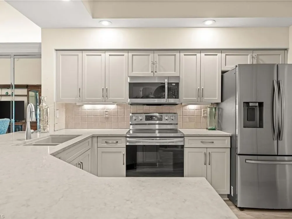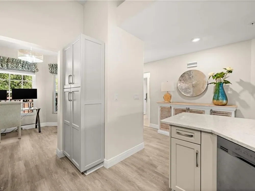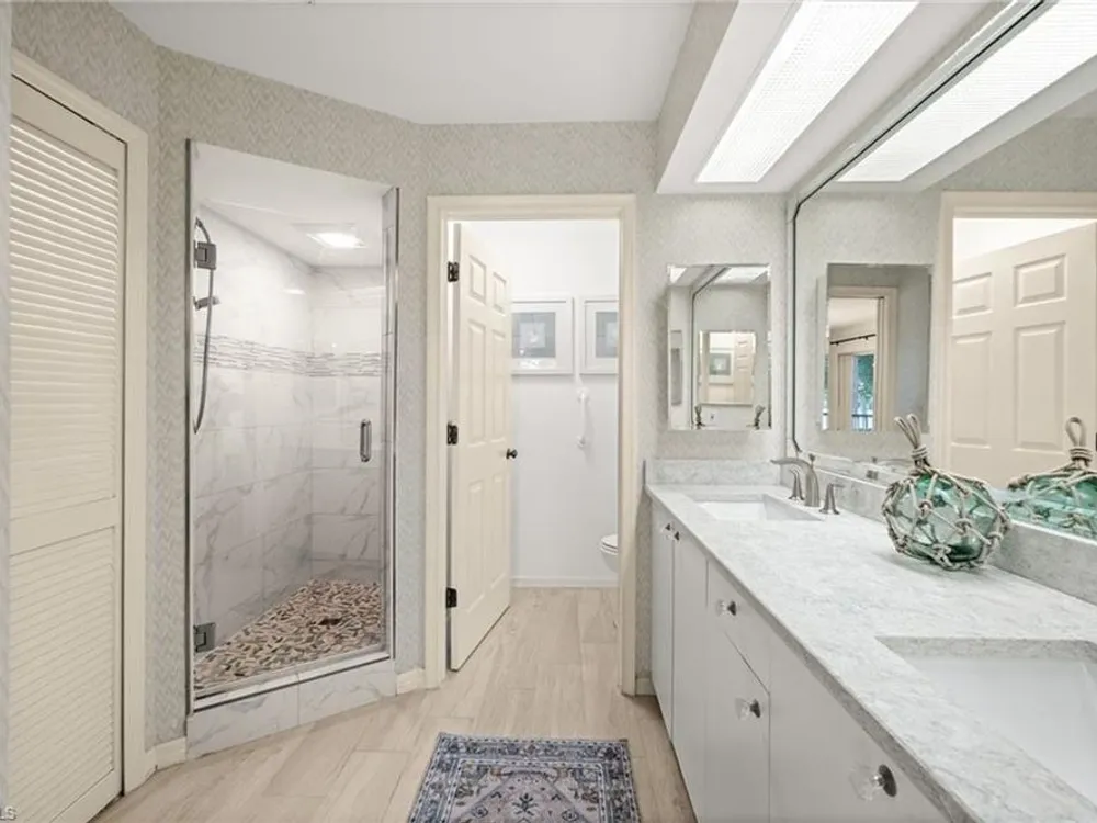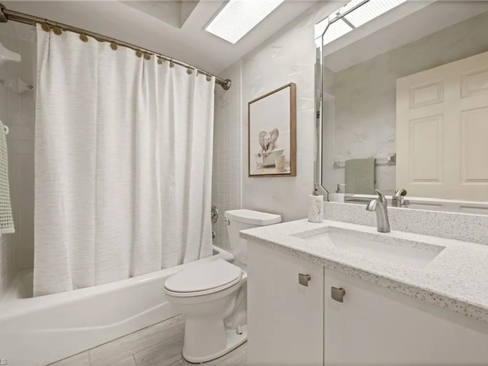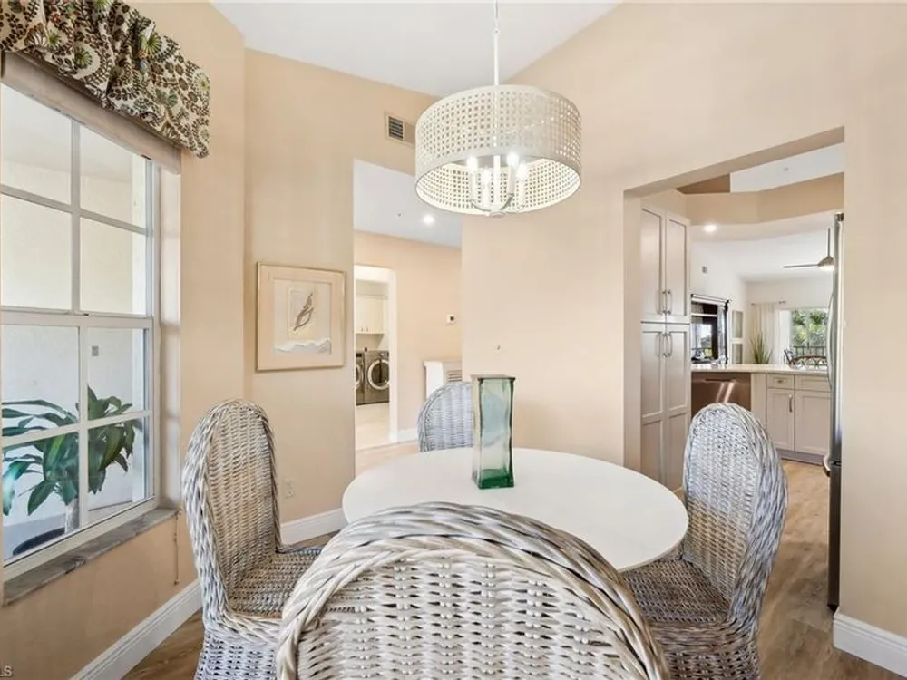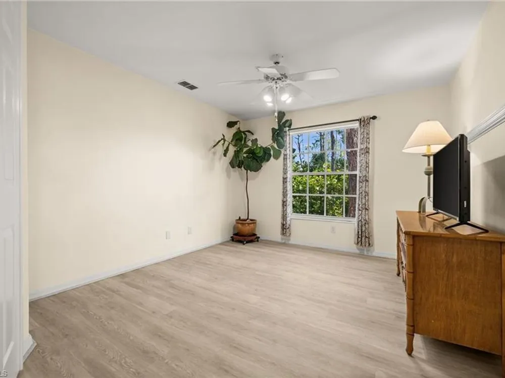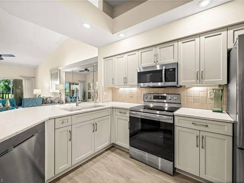 Welcome to 4101 Sawgrass Point Drive #201, a luxuriously renovated end-unit residence with third bedroom plus flexible breakfast room/office, and breathtaking lake and golf views. Passing through the sun-kissed courtyard and parting the front door, one is immediately welcomed by soaring vaulted ceilings and a degree of natural lighting only a second-floor end-unit could provide. The central open kitchen unifies and elevates surrounding living spaces, featuring quartz countertops, crisp shaker cabinetry, and stainless steel appliances. Warm-toned wood-look flooring stretches wall-to-wall, a market favorite, while primary suite showcases freshly updated shower and quartz countertops, and guest suite has a new vanity of its own. This versatile floor plan includes both a flexible breakfast room and separate third bedroom/bonus room that can be reconfigured to suit one’s needs, spaces that we’ve seen used as extra bedrooms, studios, dining rooms, bunk rooms, offices, and home gyms. Perhaps most noteworthy of all is the view: tucked among the treetops, unparallelled panoramic views spanning two signature holes of golf, multiple bodies of water, and a whole host of wildlife and native entertainment. This is one of the single most mesmerizing views of any condo we’ve had the privilege of visiting in Pelican Landing, and the photos do not do it justice—must see in person. No special flood zone; no history of flooding; electric roll-down hurricane protection on lanai for peace of mind. In addition to Sawgrass Point's resort style pool and spa, Pelican Landing residents enjoy world-class amenities, including a 34-acre private island beach club, gulf access sailing, kayaking, and boat ramp, 12 Har-Tru tennis courts, pickleball, bocce, and a fitness center. This home is conveniently located within walking or biking distance to the community center, grocery store, pharmacy, and numerous casual and fine dining options. Additionally, optional memberships are available at The Nest Golf Club, featuring 36 holes of championship golf and a newly renovated clubhouse. Waitlists due to high demand at The Nest may apply. Schedule your private showing today!