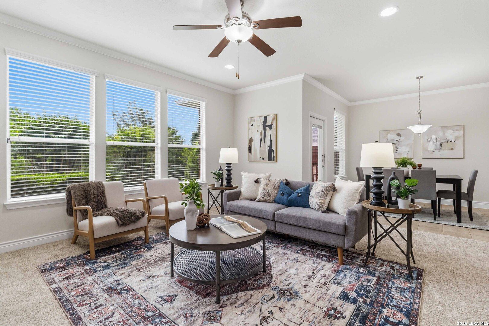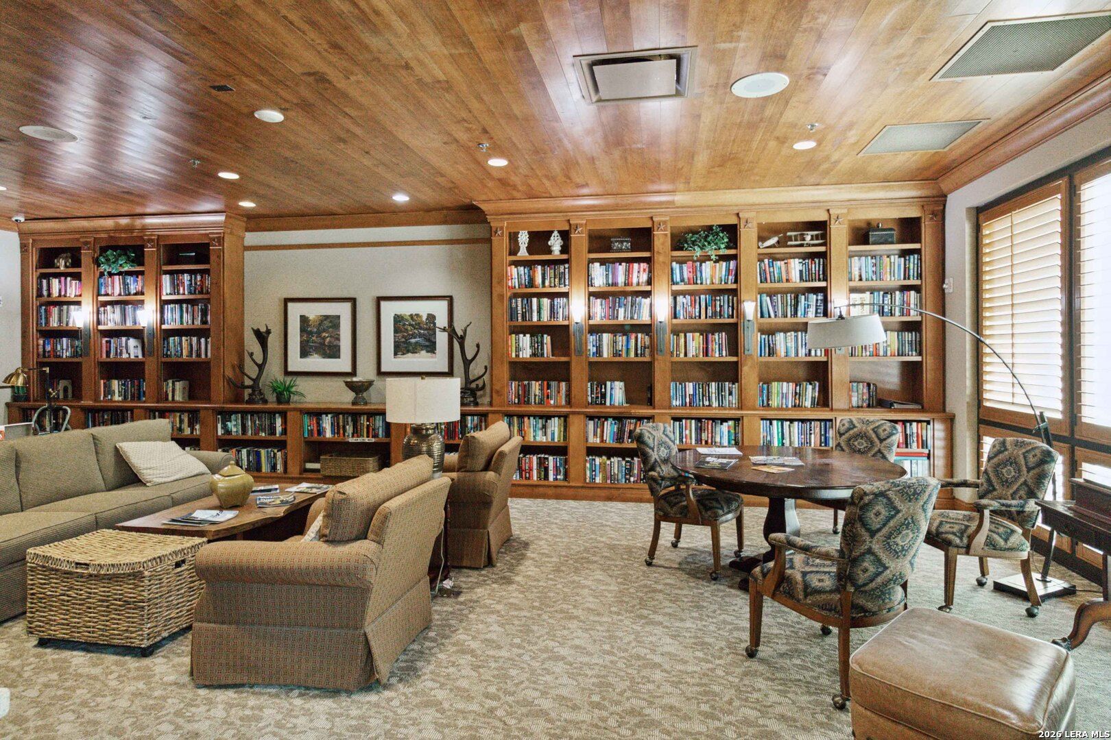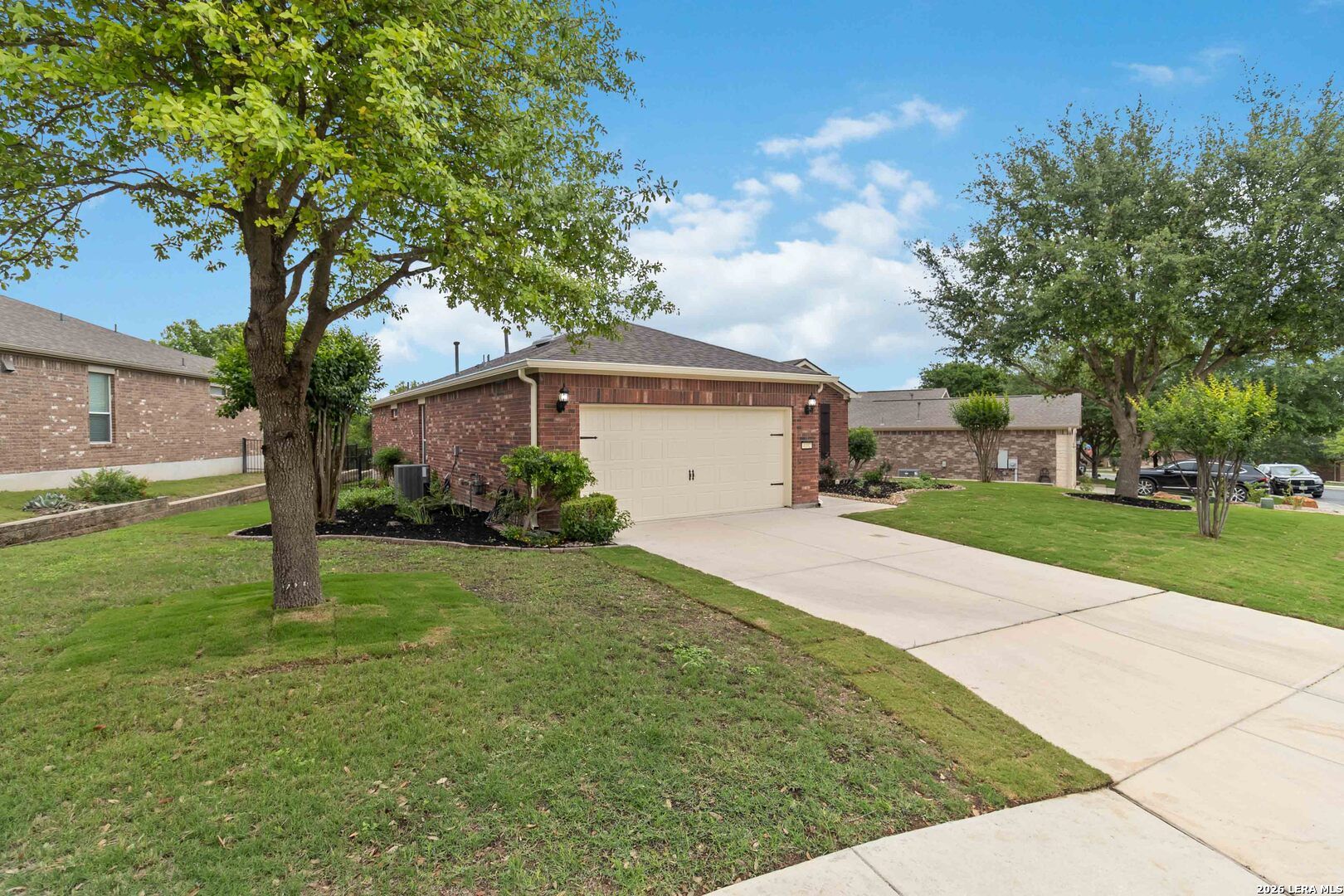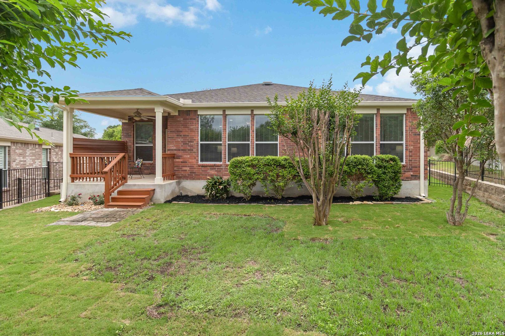 Impeccably cared for and move-in ready, 4102 Warm Winds offers the perfect blend of comfort, flexibility, and Hill Country charm in the premier 55+ Del Webb Hill Country Retreat community. This thoughtfully designed single-story home features 2 bedrooms, 2 full baths, and a dedicated study with French doors, ideal for a home office or optional third bedroom. The interior showcases fresh paint throughout, even in the garage, along with brand new carpet, making it truly turnkey. The kitchen is designed for both everyday living and entertaining, complete with 42-inch cabinets, granite countertops, a corner lazy Susan for maximum storage, gas cooking, and a stainless steel refrigerator that conveys. A new garbage disposal and kitchen faucet add to the home's thoughtful updates. The laundry room has been smartly designed with upper and lower cabinets, a sink, and generous countertop space, along with a huge storage closet. Natural light pours into the home, enhanced by a glass storm door and a wall of windows that frame peaceful views of mature crape myrtle and Texas mountain laurel trees. Enjoy the calming sights and sounds of nature from your living space or while relaxing under the shaded covered patio-an ideal setting for morning coffee or evening unwinding. The spacious primary suite is a true retreat, featuring a tray ceiling with fan and an en suite bath with dual vanities, a garden tub, separate walk-in shower, and a generously sized walk-in closet. Both bathrooms include convenient linen storage. Additional highlights include decorative crown molding and a new composition shingle roof installed in November 2023, offering added peace of mind for years to come. Residents of Del Webb Hill Country Retreat enjoy resort-style amenities that are truly second to none, including two outdoor pools, an indoor pool, fitness center, indoor walking track, tennis and pickleball courts, a stunning clubhouse with library, and miles of scenic walking trails. Plus, enjoy the charm of frequent deer sightings throughout this serene and beautifully maintained community. Whether you're enjoying peaceful mornings on the covered patio, staying active with world-class community amenities, or simply taking in the beauty of nature all around you, this home offers the lifestyle you've been waiting for.
