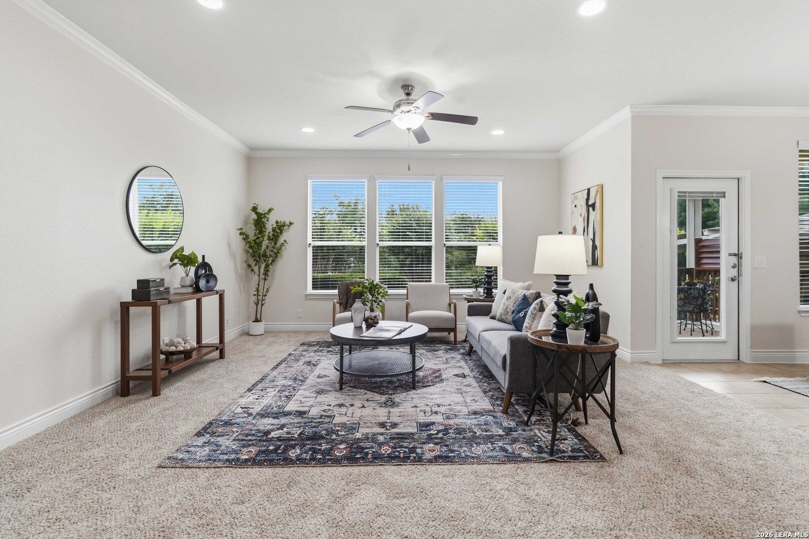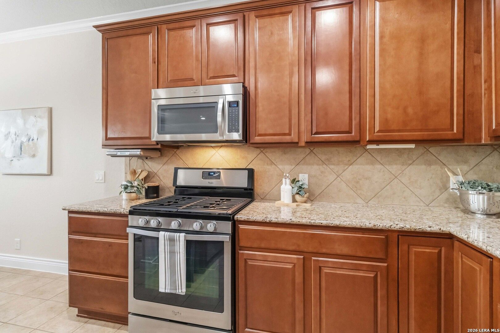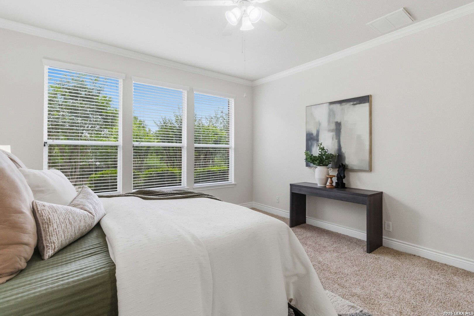 Impeccably cared for and move-in ready, 4102 Warm Winds offers the perfect blend of comfort, flexibility, and Hill Country charm in the premier 55+ Del Webb Hill Country Retreat community. This thoughtfully designed single-story home features 2 bedrooms, 2 full baths, and a dedicated study with French doors, ideal for a home office or optional third bedroom. The interior showcases fresh paint throughout, even in the garage, along with brand new carpet, making it truly turnkey. The kitchen is designed for both everyday living and entertaining, complete with 42-inch cabinets, granite countertops, a corner lazy Susan for maximum storage, gas cooking, and a stainless steel refrigerator that conveys. A new garbage disposal and kitchen faucet add to the home's thoughtful updates. The laundry room has been smartly designed with upper and lower cabinets, a sink, and generous countertop space, along with a huge storage closet. Natural light pours into the home, enhanced by a glass storm door and a wall of windows that frame peaceful views of mature crape myrtle and Texas mountain laurel trees. Enjoy the calming sights and sounds of nature from your living space or while relaxing under the shaded covered patio-an ideal setting for morning coffee or evening unwinding. The spacious primary suite is a true retreat, featuring a tray ceiling with fan and an en suite bath with dual vanities, a garden tub, separate walk-in shower, and a generously sized walk-in closet. Both bathrooms include convenient linen storage. Additional highlights include decorative crown molding and a new composition shingle roof installed in November 2023, offering added peace of mind for years to come. Residents of Del Webb Hill Country Retreat enjoy resort-style amenities that are truly second to none, including two outdoor pools, an indoor pool, fitness center, indoor walking track, tennis and pickleball courts, a stunning clubhouse with library, and miles of scenic walking trails. Plus, enjoy the charm of frequent deer sightings throughout this serene and beautifully maintained community. Whether you're enjoying peaceful mornings on the covered patio, staying active with world-class community amenities, or simply taking in the beauty of nature all around you, this home offers the lifestyle you've been waiting for.