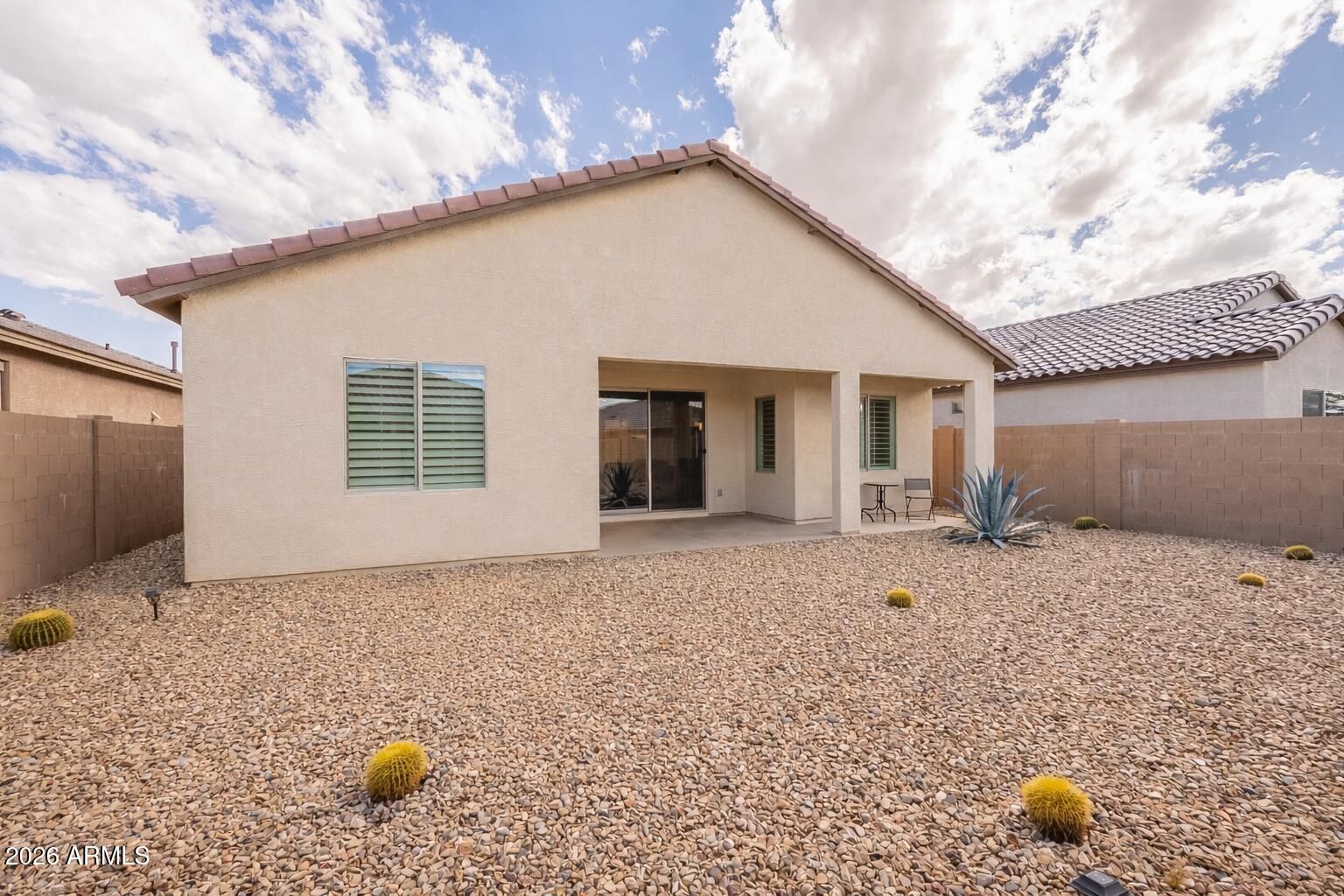 Imagine starting your mornings by enjoying the resort-style lifestyle of Robson Ranch and ending your day with a drink on the patio. This well-maintained Capri model offers 2 bedrooms, 2 bathrooms, a spacious den, and a 2-car garage with a bright, open layout designed for comfortable living and entertaining. Ceramic tile flooring highlights the main living areas, while plantation shutters add a polished touch throughout. The eat-in kitchen features roll-out shelves, island seating, and space for casual dining. An upgraded 8-foot sliding glass door opens to a covered patio and peaceful desert-landscaped backyard, perfect for enjoying Arizona mornings and evenings. Enjoy golf, pickleball, resort pools, fitness center, dining, clubs, and the vibrant Robson Ranch lifestyle.