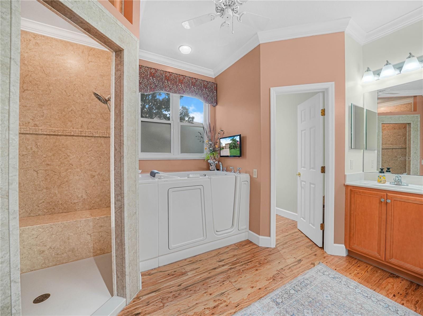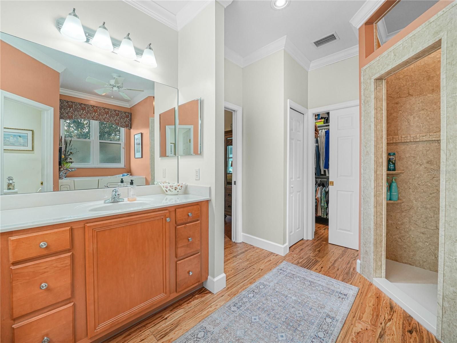 - Built-in Features, Ceiling Fan(s), Crown Molding, High Ceilings, Main Level Primary, Solid Surface Counters, Split Bedrooms, Stone Counters, Thermostat, Vaulted Ceiling(s), Walk-In Closet(s)