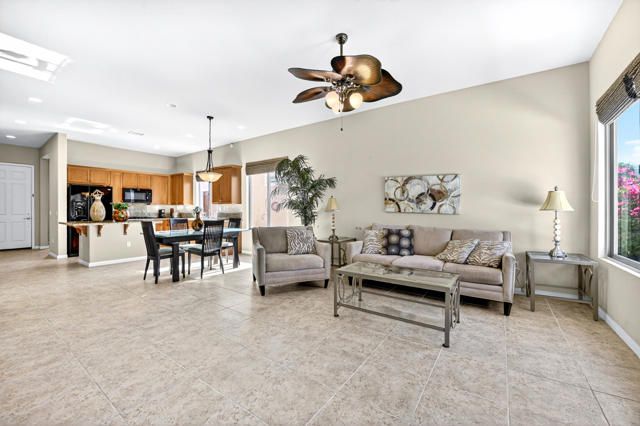 Stylish comfort in a prime location! Welcome to Sun City Shadow Hills, a premier 55+ active adult community. This popular Serrente floor plan is TURNKEY FURNISHED, offering 1,488 sf (EST.) of thoughtfully designed living space featuring 2 bedrooms, 2 bathrooms, and a versatile den--perfect for a home office, craft room, or guest space. A welcoming entry leads into the open-concept living area with elegant tile flooring, creating a seamless flow for entertaining and relaxation. The kitchen boasts granite slab countertops, black appliances, and ample cabinetry, combining functionality with a modern touch. Soft carpeting in the bedrooms adds warmth and comfort, creating a relaxing retreat. Enjoy indoor-outdoor living from your covered patio, perfect for morning coffee or evening gatherings. Additional highlights include a spacious primary suite with walk-in closet and dual vanity bath, a guest bedroom with nearby full bath, and an inviting den that enhances the home's flexible layout. With its comfortable floor plan, quality finishes, and desirable location, this home is ready to make your desert lifestyle complete! The garage is equipped with an energy-efficient AC mini split, ideal for year-round comfort--whether used for projects, storage, or a fitness space. Residents of Sun City Shadow Hills enjoy access to two golf courses, two clubhouses, fitness centers, pools, pickleball and tennis courts, and a variety of social clubs and activities--offering a vibrant and active desert lifestyle.