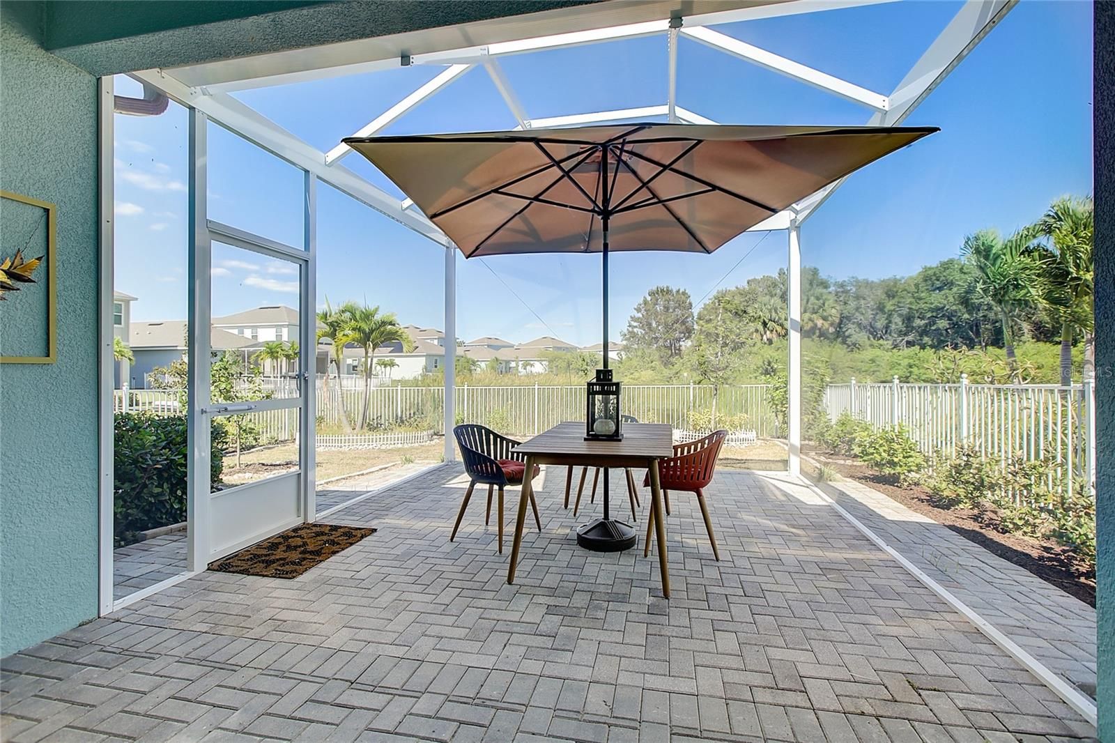 411 Sandsend Court is a 3-bedroom, 2-bath, 1,512 sq ft Mendoza floorplan built in 2021 by Park Square Homes in the gated waterfront community of MiraBay. This home sits on a private rear conservation lot with peaceful pond and wooded views, and is located a short distance from the MiraBay Clubhouse, 24-hour fitness center, café, lounge, heated pools, basketball courts, pickleball courts, tennis courts, parks, playgrounds, and the golf-cart friendly streets the community is known for. Inside, the home features a fully upgraded kitchen with 42” cabinets, quartz countertops, stainless steel appliances, gas cooktop with hood, built-in oven and microwave, and a large center island that opens to the main living area. tile flooring runs through the main living spaces, and the bedrooms feature upgraded wood-look vinyl for added comfort. The split bedroom layout gives privacy for guests, a home office, or multigenerational living. The primary suite includes a large walk-in closet and an ensuite bath with dual sinks and a walk-in shower. A sliding glass door leads to the expanded screened lanai overlooking the pond and conservation area. The lanai is brick-paved and already set up with gas and water connections, making it ready for a future outdoor kitchen or custom outdoor space. The fenced backyard adds privacy and flexibility for outdoor living. Additional upgrades include a tankless water heater, hurricane shutters, stylish window treatments, extra cabinetry in the laundry room, upgraded fixtures, custom cement edging, uplighting, a covered front porch, and a two-car garage with an extended paved driveway. The home has been well maintained inside and out. MiraBay is known for its resort-style living, offering two heated pools, a 24-hour fitness center, courts for basketball, pickleball, and tennis, multiple parks, playgrounds, and access to kayaks and paddleboards for exploring the community waterways. With a low HOA and a location close to beaches, shopping, dining, and everything Apollo Beach offers, this home provides easy, comfortable living.