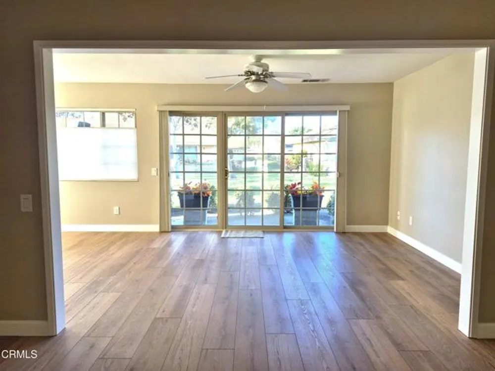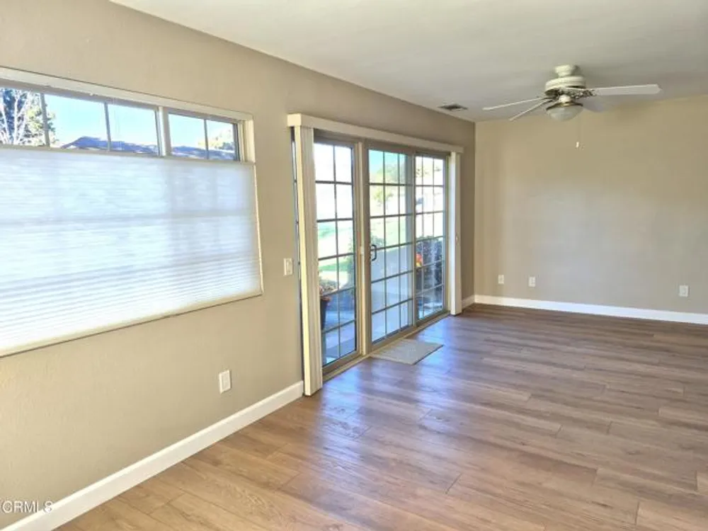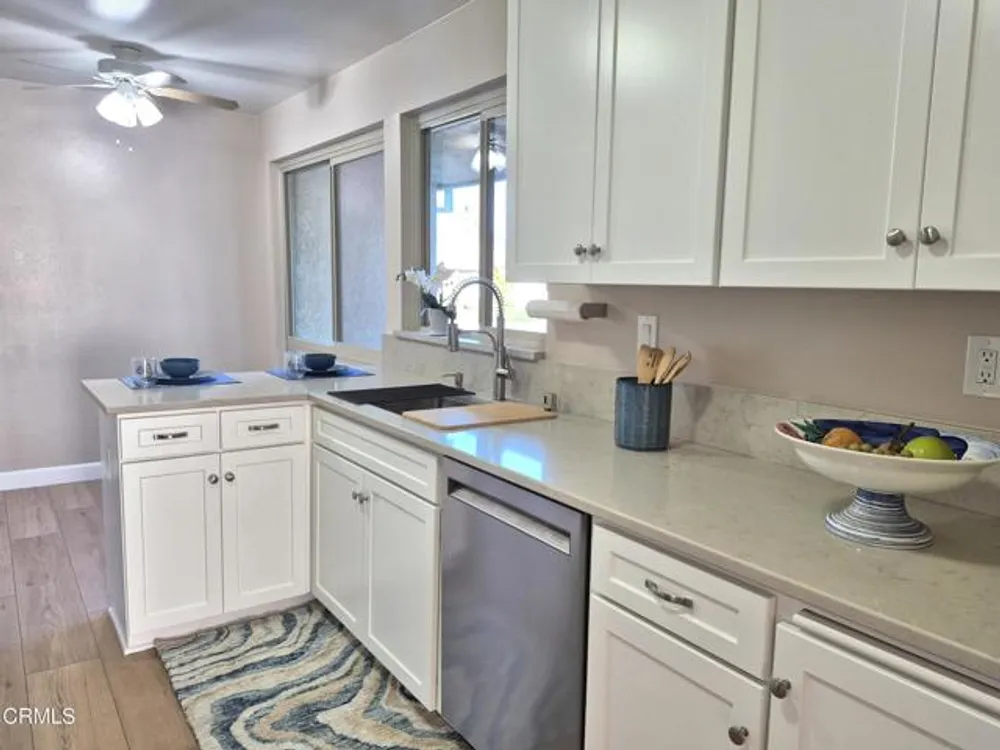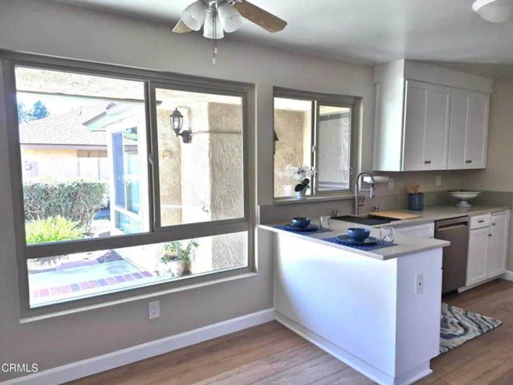 Welcome to this beautifully remodeled 2-bedroom, 2-bathroom, Coronado model in Camarillo's desirable 55+ Leisure Village! This spacious home features approximately 1,300 sq ft including a light & bright enclosed patio room with privacy screen door & greenbelt views, plus a private, outdoor patio area with relaxing mountain views. Inside, you'll love the open living room with vaulted ceiling with solar tube, fresh paint, dual-pane windows, ceiling fans, smooth ceilings and gorgeous vinyl plank flooring with updated baseboards throughout. The stunning kitchen features white shaker soft-close cabinets, quartz countertops, brand-new stainless-steel appliances (refrigerator included), pantry, and eat-in area. Both bathrooms have been tastefully remodeled with walk-in showers. Additional features include a 5-year-new Trane HVAC system, direct-access 1-car garage with washer & dryer, mirrored closet doors, and plenty of storage.Leisure Village offers a 24-hour guard-gated entrance, 18-hole par-3 golf course, pool, spa, fitness center, tennis and pickleball courts, woodshop, ceramics, billiards, clubs, activities, and more. HOA dues include water, sewer, trash, cable TV, internet, landscaping, exterior maintenance, and security patrol. This is the one you've been waiting for. Welcome Hom