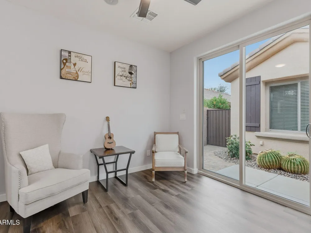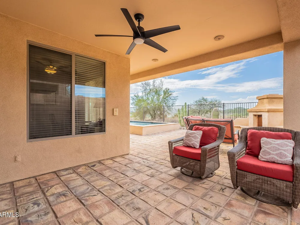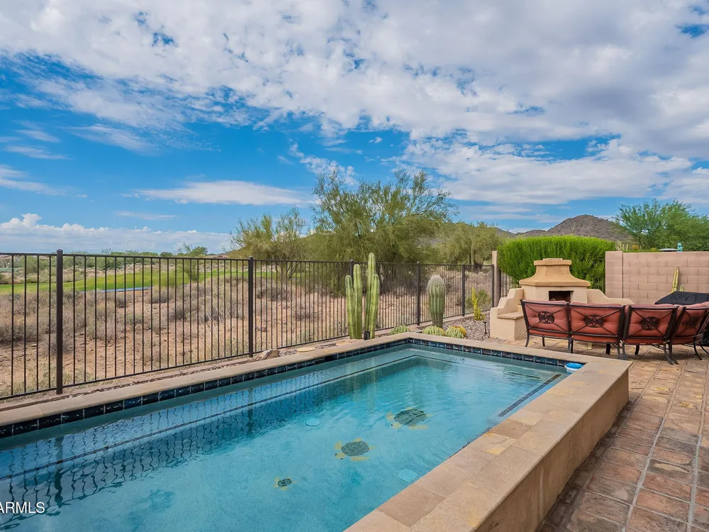 REMODELED GOLF COURSE HOME WITH CASITA AND POOL! Located in guard-gated Anthem Country Club, this beautifully remodeled single-level home combines fresh updates, security, and spectacular golf course and mountain views. DURANGO FLOOR PLAN offers 2 bed, 2 bath, and office with a Murphy bed, PLUS a 218 SQFT detached casita with 1 bed and 1 bath ideal for guests or a private workspace. RECENT UPGRADES include brand-new kitchen with NEW quartz countertops, backsplash, cabinetry, stainless appliances, gray tile flooring, carpet, baseboards, sliding glass door and updated bathrooms. BACKYARD OASIS features heated pool, covered patio with TV, gas fireplace, low maintenance desert landscaping. AMPLE STORAGE with extended length two-car garage. RESORT-STYLE COMMUNITY includes two championship golf courses, two clubhouses, restaurants, pro shop, fitness center, pools, hot tubs, tennis, pickleball, bocce ball, driving ranges, men's and women's golf leagues, plus year-round social events. Open to residents of all ages, the community provides a welcoming atmosphere, 24-hour guard-gated security, beautifully maintained surroundings, spectacular mountain and golf course views, making it one of Arizona's most sought-after neighborhoods.