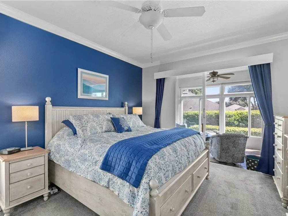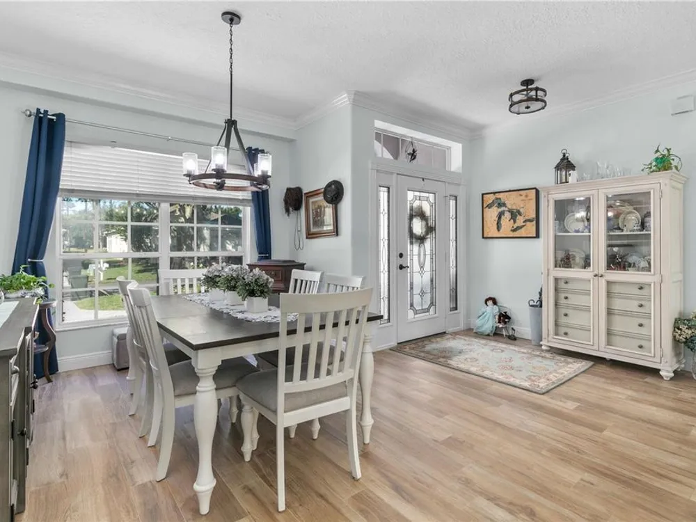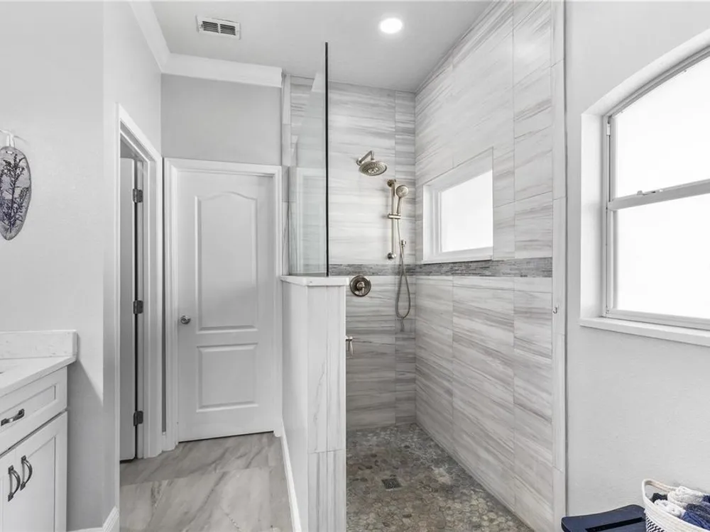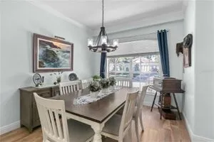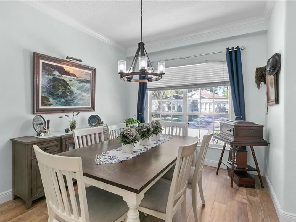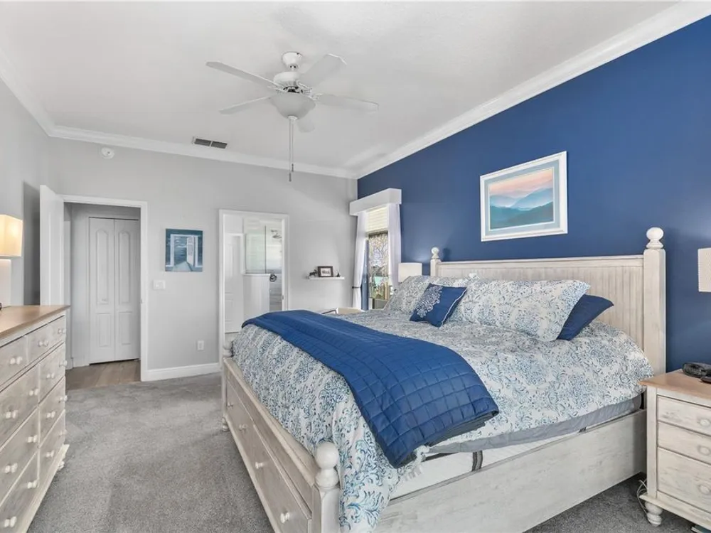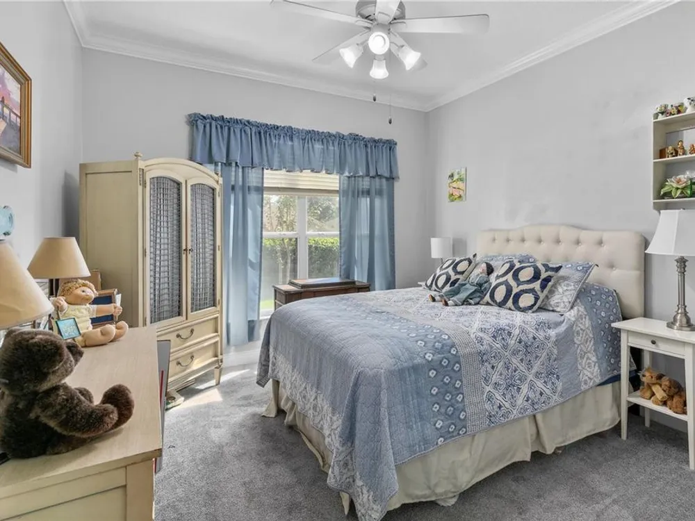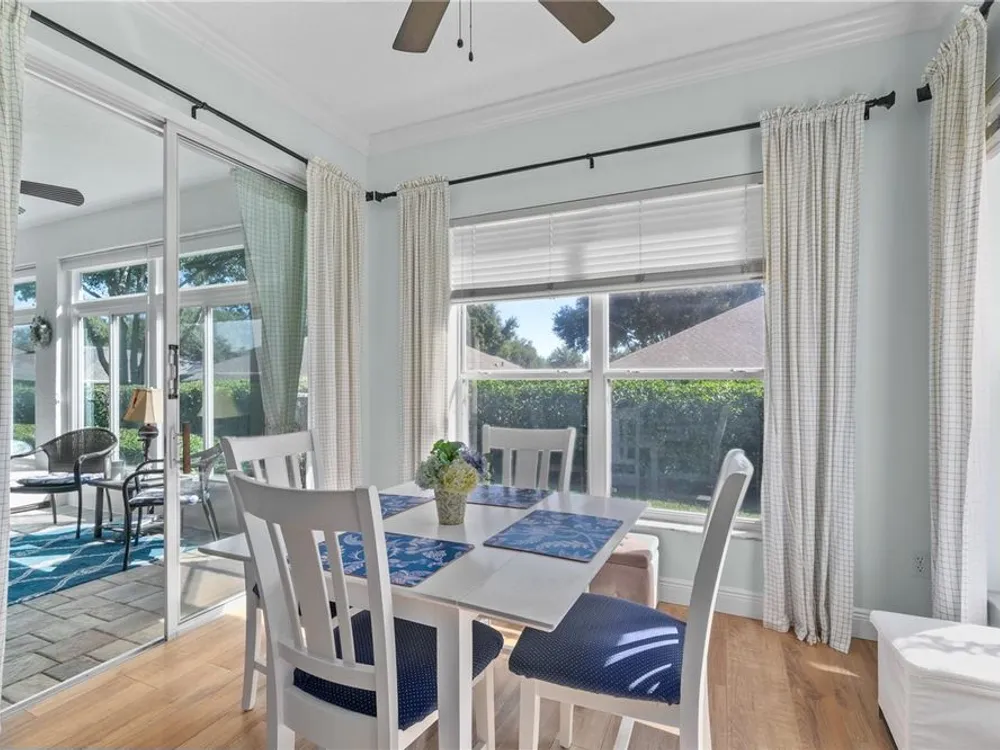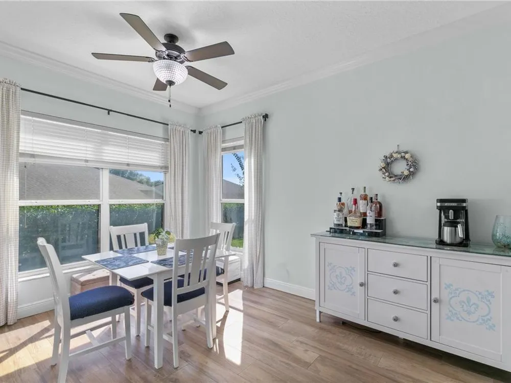 - Ceiling Fan(s), Crown Molding, Eat-in Kitchen, L-Shaped Dining Room, Main Level Primary, Stone Counters, Thermostat, Walk-In Closet(s), Window Treatments