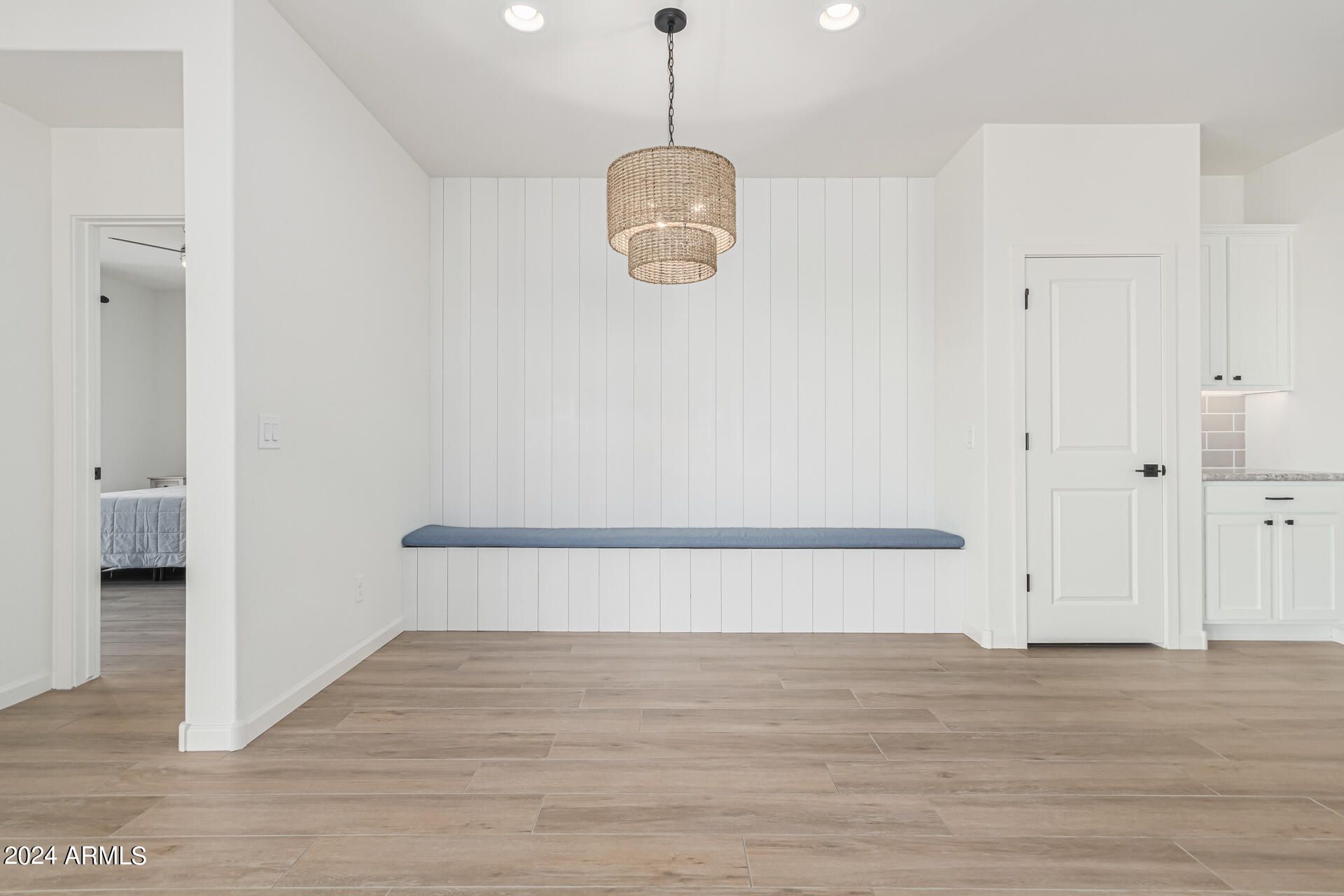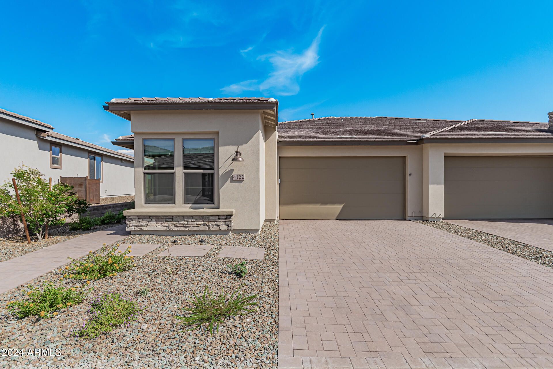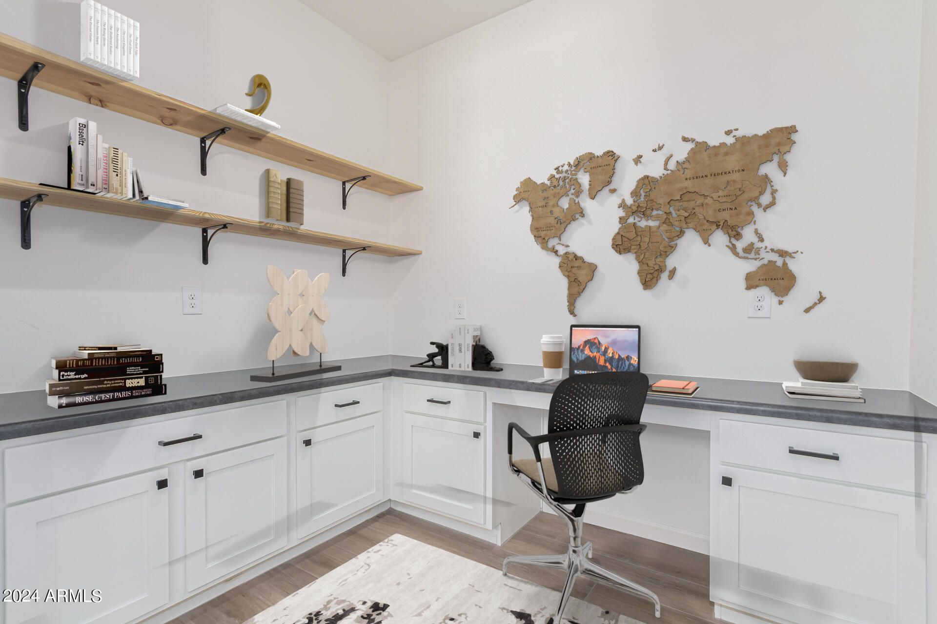 Amazing unobstructed vistas of the golf course and Vulture Peak from extended patio, pergola, fan and two relaxing water fountains. Over $90,000 of upgrades! (See MLS Documents Tab) $80,000 lot premium. Seller purchased property for $599,026! Fantastic floor plan includes a separate OFFICE. Kitchen, upgraded granite, stainless Steel appliances. Dining Room has shiplap custom wall, custom bench, custom light fixture. Home is in Resort Area, where HOA fees pays for the landscape maintenance once per month, irrigation repairs, irrigation to plants and trees, granite replenishment, and painting of the duplex.