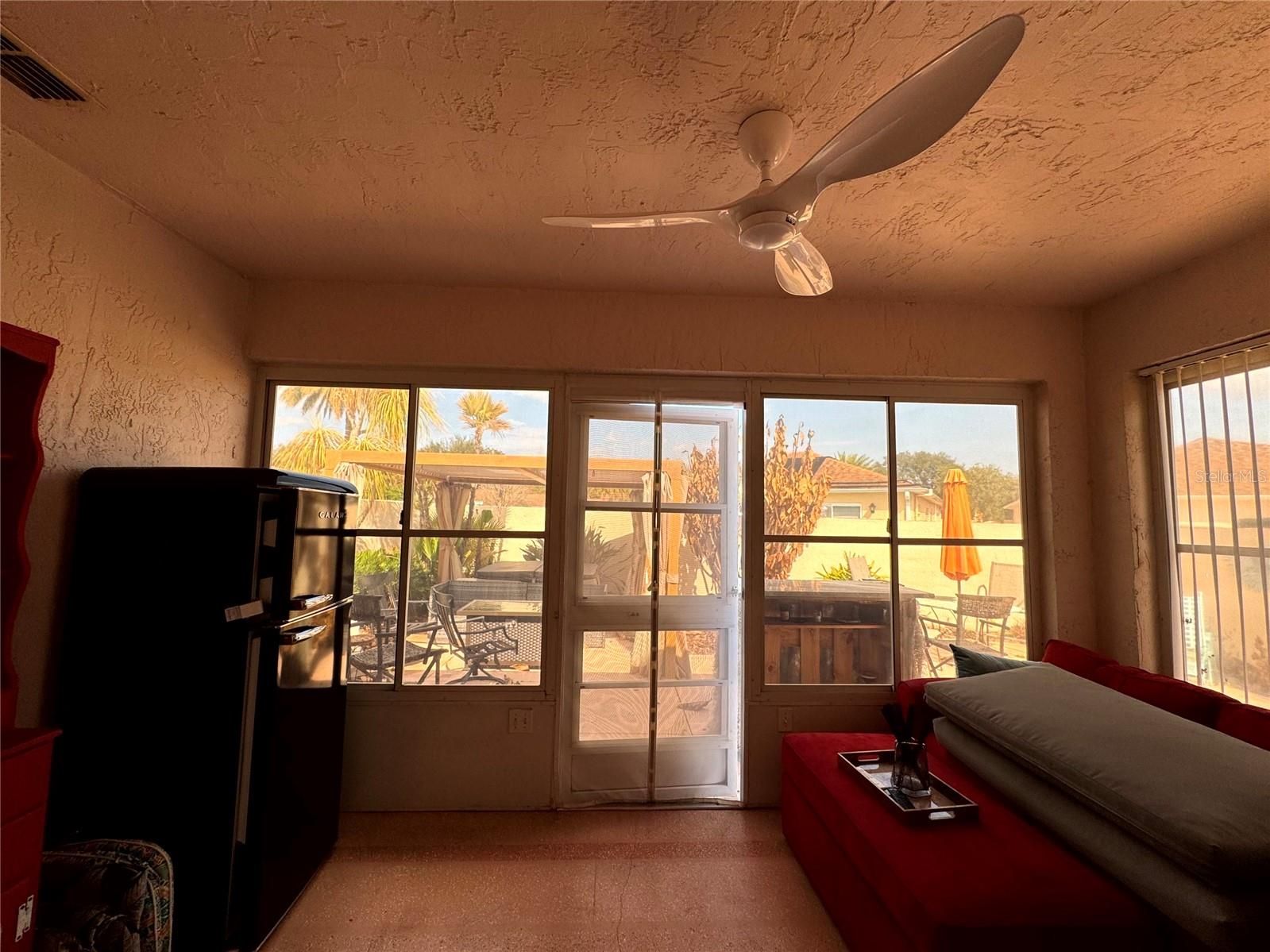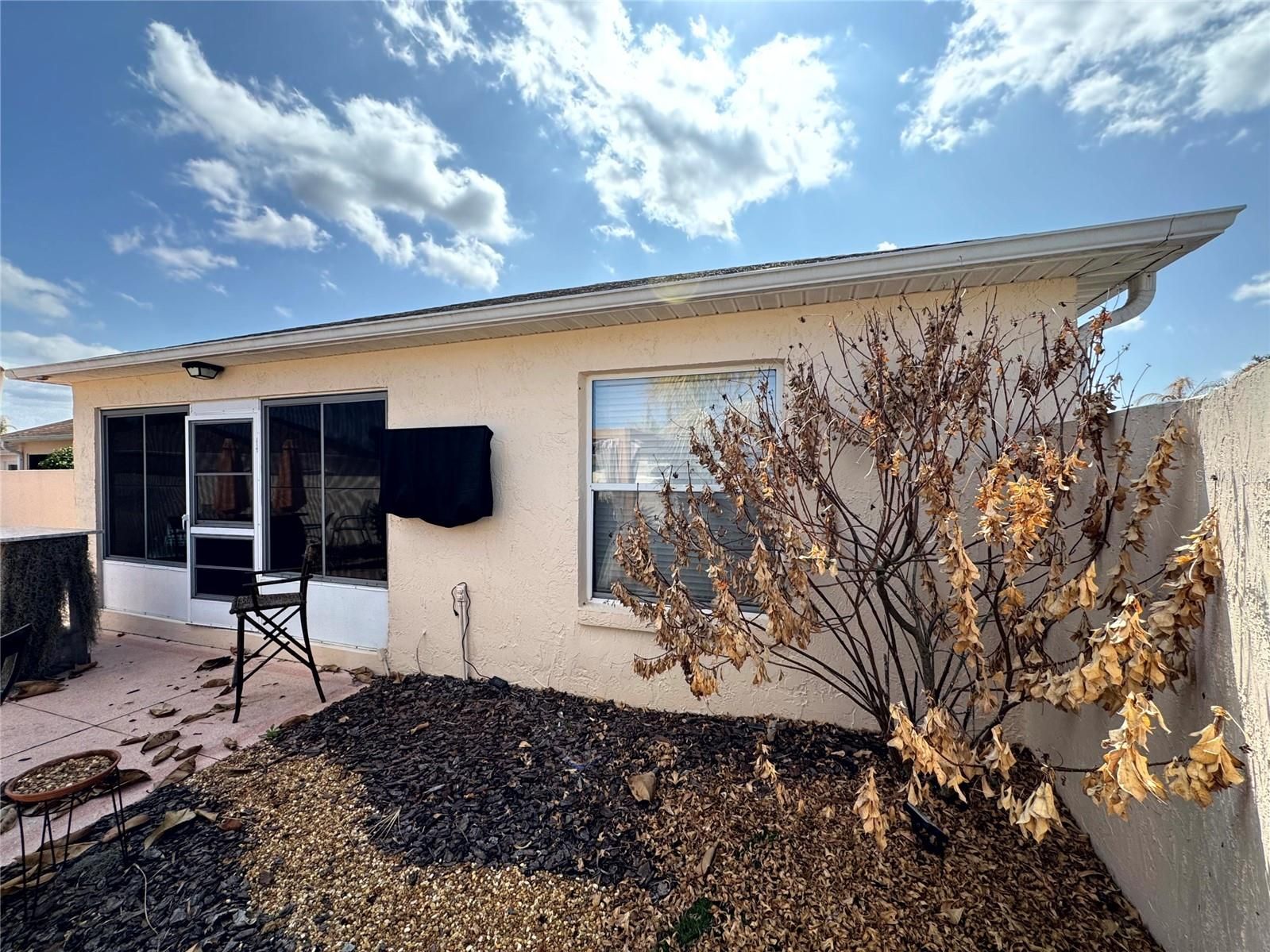 Bond paid! This affordable block-constructed courtyard villa offers privacy with no neighbor to the north. Prime location in The Villages—conveniently close to Lake Sumter Landing and under 2 miles from Spanish Springs Town Square—ideal for full-time residents, snowbirds, or strong rental income potential. Enjoy low-maintenance living with no mowing thanks to hardscaped courtyard, expansive walkways, and outdoor spaces. Inside, custom one-of-a-kind epoxy flooring flows throughout (except dining/living room), opening to a bright, combined dining/living area. The generous primary bedroom fits a king bed easily and includes ample storage via a full-length closet. The second bedroom suits guests (with twin beds) or doubles as an office/flex room (Murphy bed option). Step out to a screened lanai for peaceful morning coffee or reading, while the spacious patio accommodates raised garden beds, a hot tub, extra storage, or ample furniture for entertaining. Dual access from kitchen and living room makes year-round grilling a breeze. New AC installed in 2021, garage space for your vehicle plus convenient guest parking. Nestled near multiple golf courses and rec facilities—this true gem won't last! Villages Fire District $125/yr, Villages Maintenance $243.59/yr. Roof is 2012. AC replaced in 2021