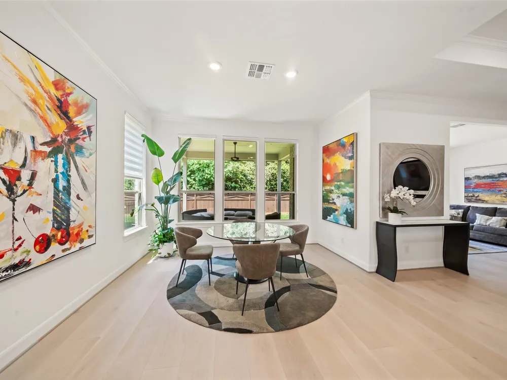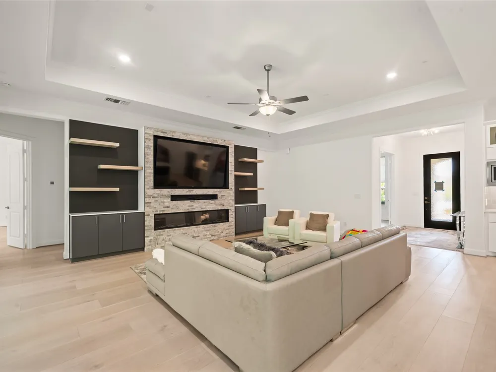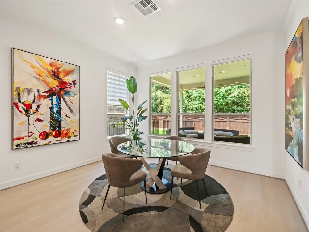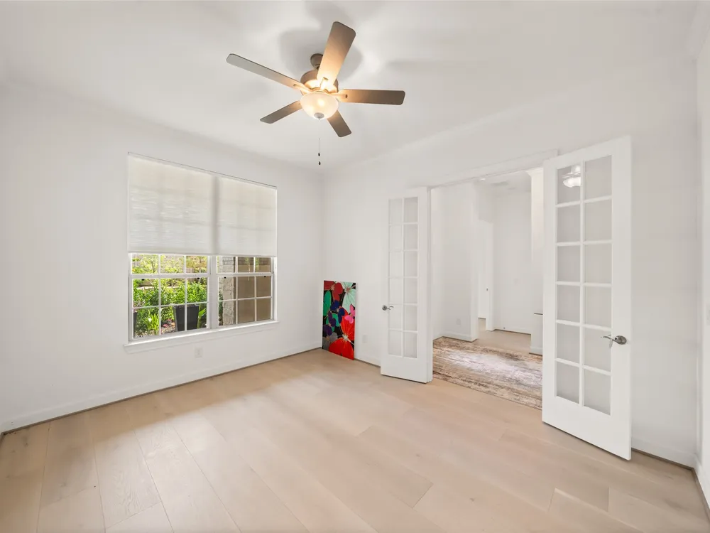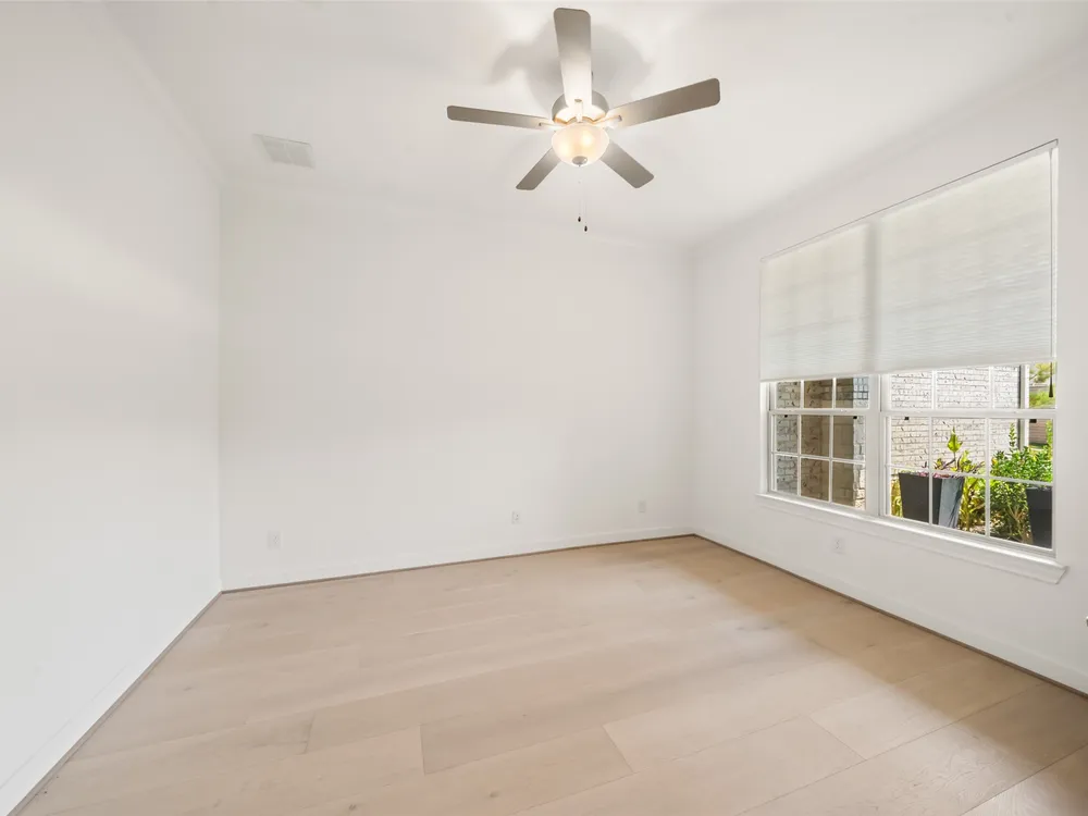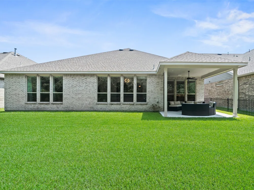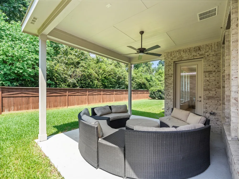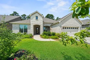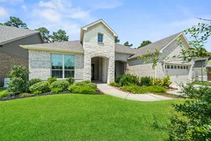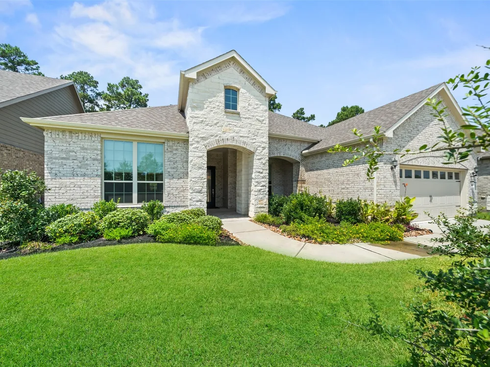 Stunning 3 bed, 2.5 bath home with 2-car garage in the desirable 55+ Active Community of Del Webb The Woodlands. Brick and stone elevation w/ welcoming front porch sits on a generous lot w/ no back neighbors. Inside, Canadian white oak flooring flows throughout an open layout featuring a private home office with French doors, spacious living room filled with natural light, and an electric fireplace. The chef’s kitchen offers stainless Kitchenaid appliances, double ovens, gas cooktop, wine fridge, subway backsplash, island w/ breakfast bar, upgraded cabinets/glass & bright breakfast area. A wall of windows highlights the sunroom. The primary suite boasts large windows, dual sinks, oversized mirror, walk-in shower with seat, and huge walk-in closet. Two secondary bedrooms, plus a large laundry with mud area add convenience. Enjoy the covered back patio with ceiling fan overlooking a partially fenced yard, perfect for relaxing or entertaining. Garage has 4ft extension & overhead storage!