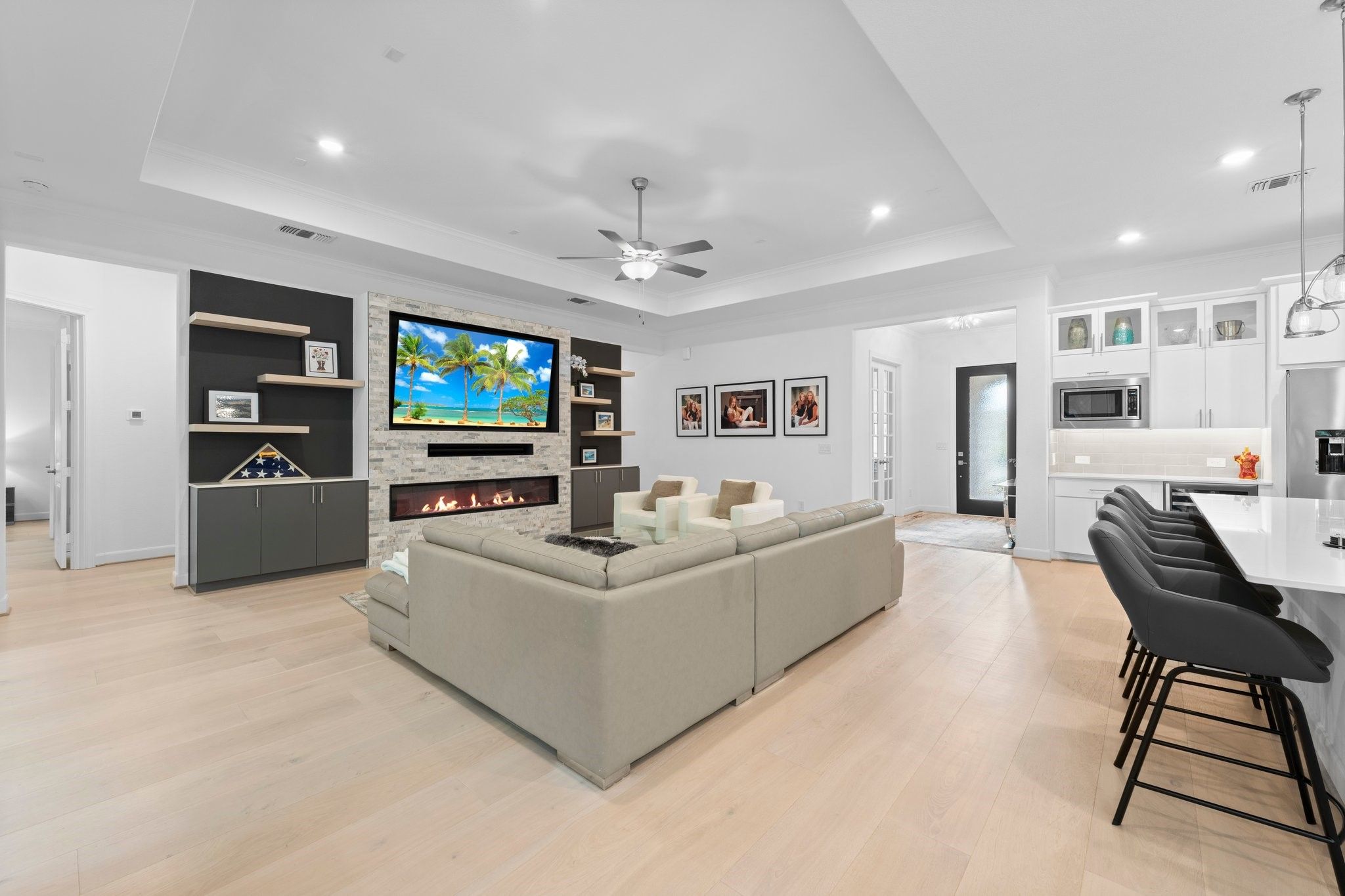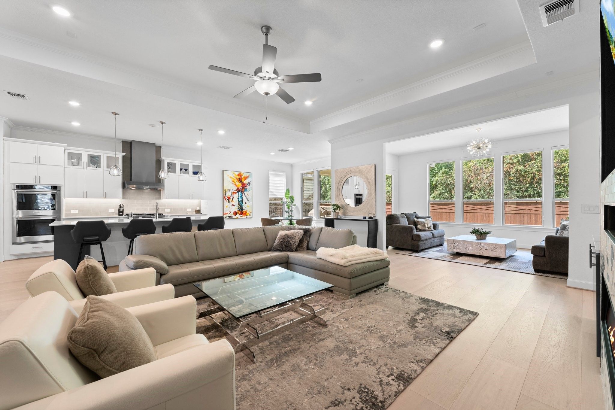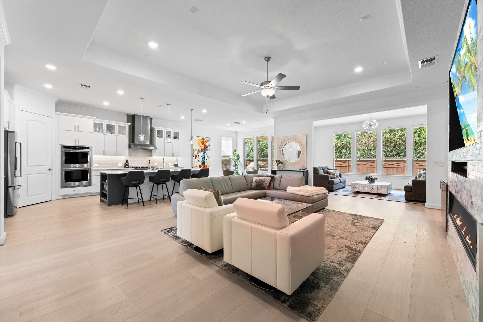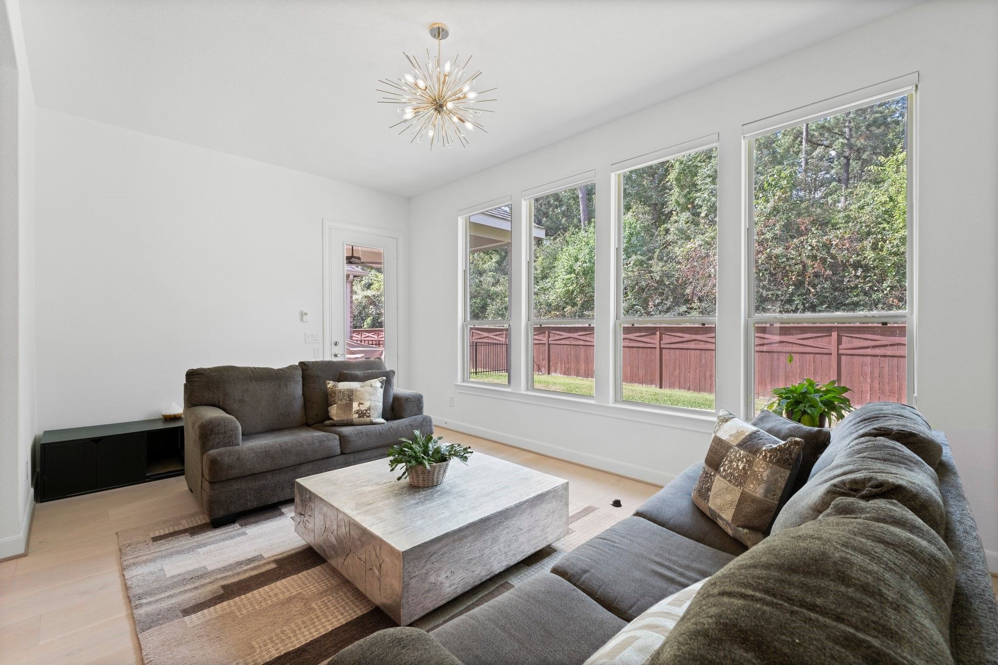 *NO BACKYARD NEIGHBORS* 3 BEDROOM * SUNROOM* POPULAR MAGNOLIA FLOOR PLAN* 55+ ACTIVE RESORT DEL WEBB THE WOODLANDS COMMUNITY*4Ft GARAGE EXTENSION This home is perfect for entertaining and culinary enthusiasts, boasting a chef’s kitchen equipped with KitchenAid stainless appliances, a double oven, gas cooktop, built-in wine refrigerator, large island, and upgraded cabinets. The spacious den is a cozy retreat with a tray ceiling, linear built-in fireplace, and wood flooring throughout. Relax in the sunroom, offering tranquil views of the tree-lined backyard. The primary bedroom is a luxurious sanctuary, complete with an en-suite bath featuring double sinks, a walk-in roll-in shower, and an expansive walk-in closet. An additional unique room, known as the snore room, serves as a versatile third bedroom. Guests will appreciate the comfort of their own private bath in the guest bedroom. Enjoy outdoor living on the covered patio, perfect for unwinding or hosting friends.