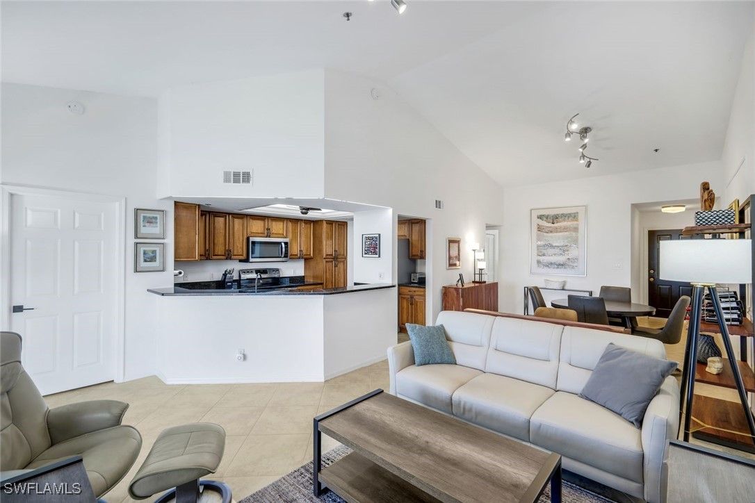 Enjoy the serenity of golf course and lake views from this beautifully updated top-floor residence in the exclusive Greenbriar neighborhood of Bonita Bay. Vaulted ceilings—unique to top-floor units—enhance the open, airy ambiance, while the absence of neighbors above ensures peace and privacy. Inside, you’ll find a clean, contemporary motif with custom trim detailing, recessed kitchen lighting, and thoughtful updates throughout—from the kitchen to both bathrooms. The spacious 3-bed, 2-bath layout includes a generous primary suite with an en-suite bath, plus two additional bedrooms ideal for guests or a home office. Relax or entertain on the screened lanai, where sweeping golf and lake views create a stunning backdrop. Greenbriar offers a true resort-style atmosphere, complete with a large community pool and spa, two tennis courts, and a brand-new pavilion with an upgraded pool house, 75" TV, and ample seating for social gatherings. Secured underground parking provides convenience and peace of mind. Residents also enjoy access to Bonita Bay’s unmatched amenities, including a private beach park on the Gulf of Mexico, over 12 miles of scenic walking and biking paths, canoe and kayak launches, a full-service marina with Gulf access, and waterfront dining at Backwater Jack’s. Membership to the Bonita Bay Club—featuring five championship golf courses, tennis and pickleball courts, a fitness center, spa, and multiple restaurants—is available but not mandatory. Discover refined coastal living in one of Southwest Florida’s most prestigious communities—where every day feels like a getaway