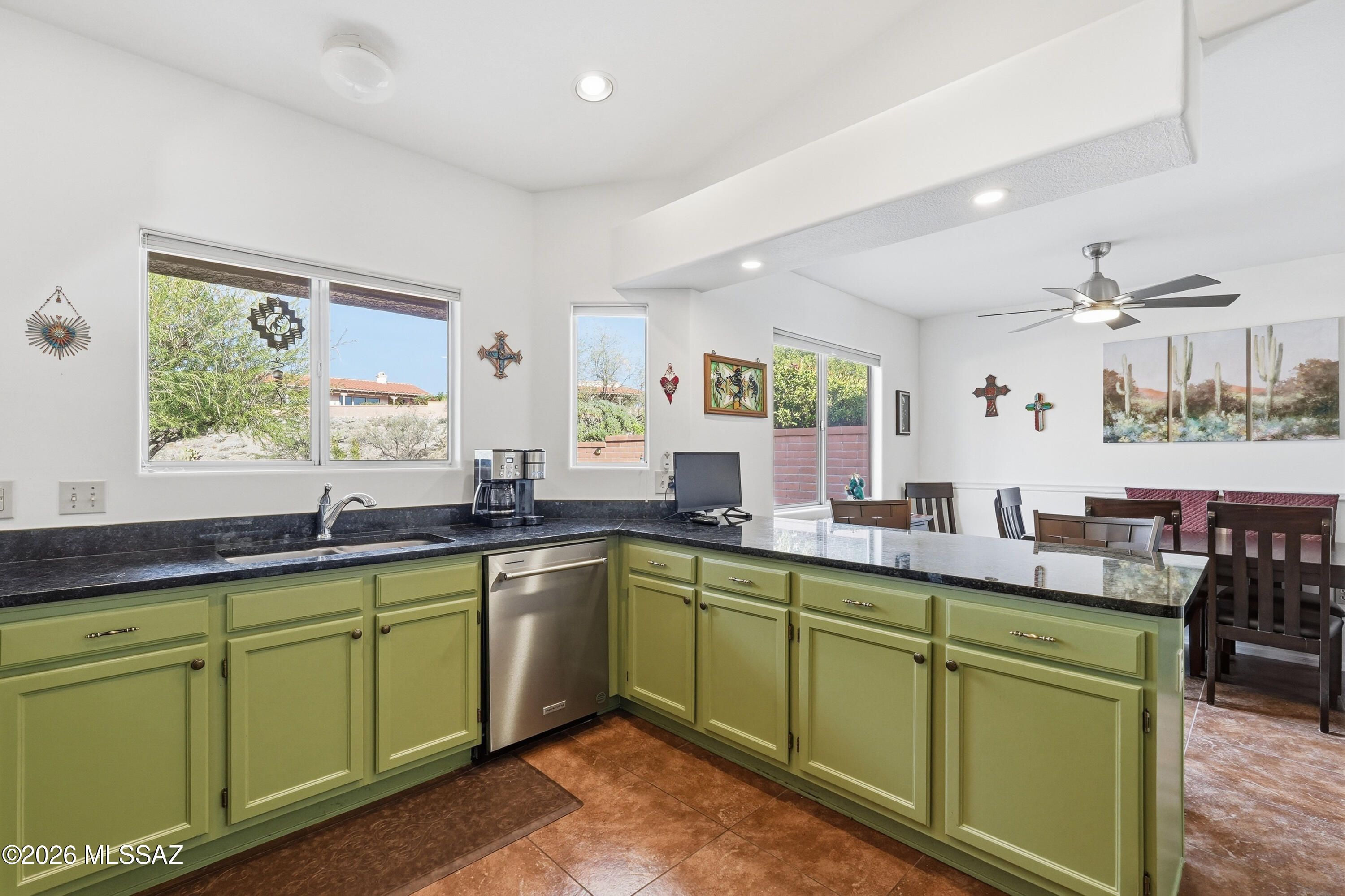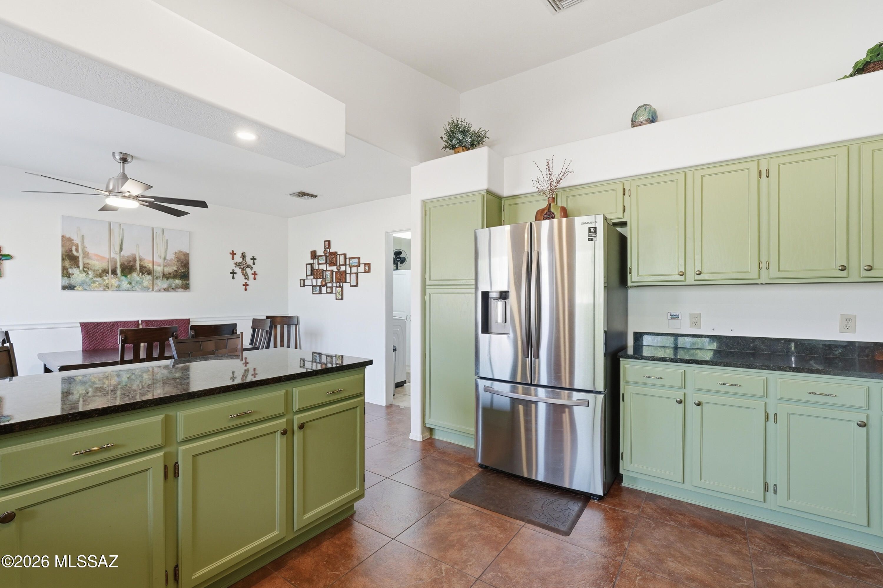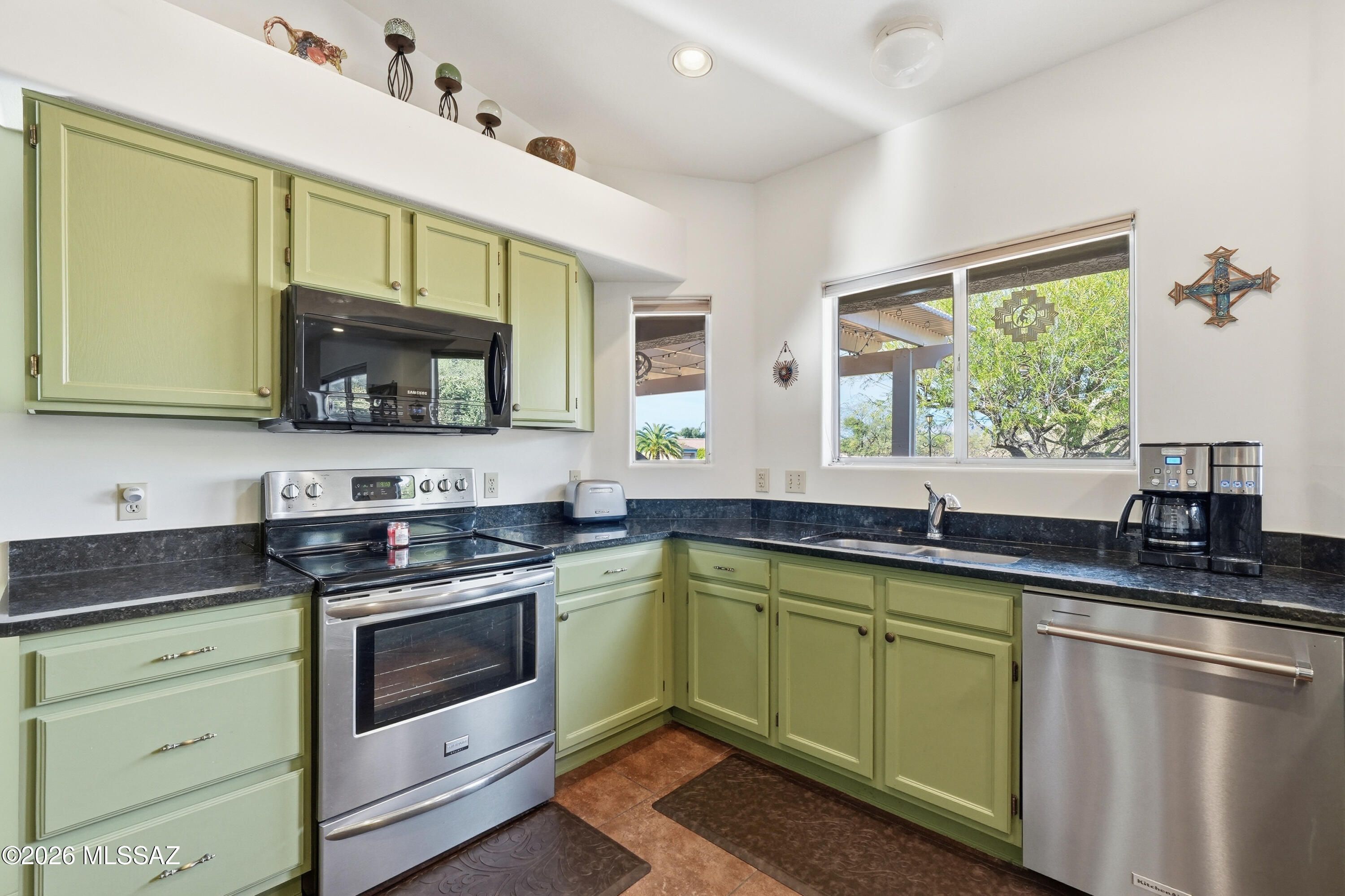 A serene retreat, golf home on elevated 0.26-acre lot offering an array of notable features and upgrades. Owned Solar power system for energy efficiency. Lovely southwestern custom paint palette and ceramic tile floors lend a warm and inviting ambiance. The spacious home layout is accentuated by abundant natural light, courtesy of the clerestory windows cascading the interior with a bright, airy atmosphere. BONUS: No Poly, whole house retrofit with PEX plumbing, New Roof! The spacious kitchen is a true highlight, featuring stainless steel appliances, granite countertops, double sink and viewing windows. Abundant counter space and dining area make this an ideal setting for both everyday meals and entertaining. This kitchen includes an overhead microwave and an electric range/oven,