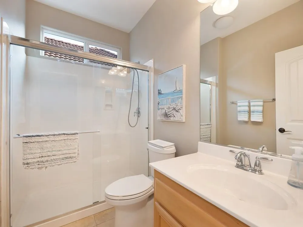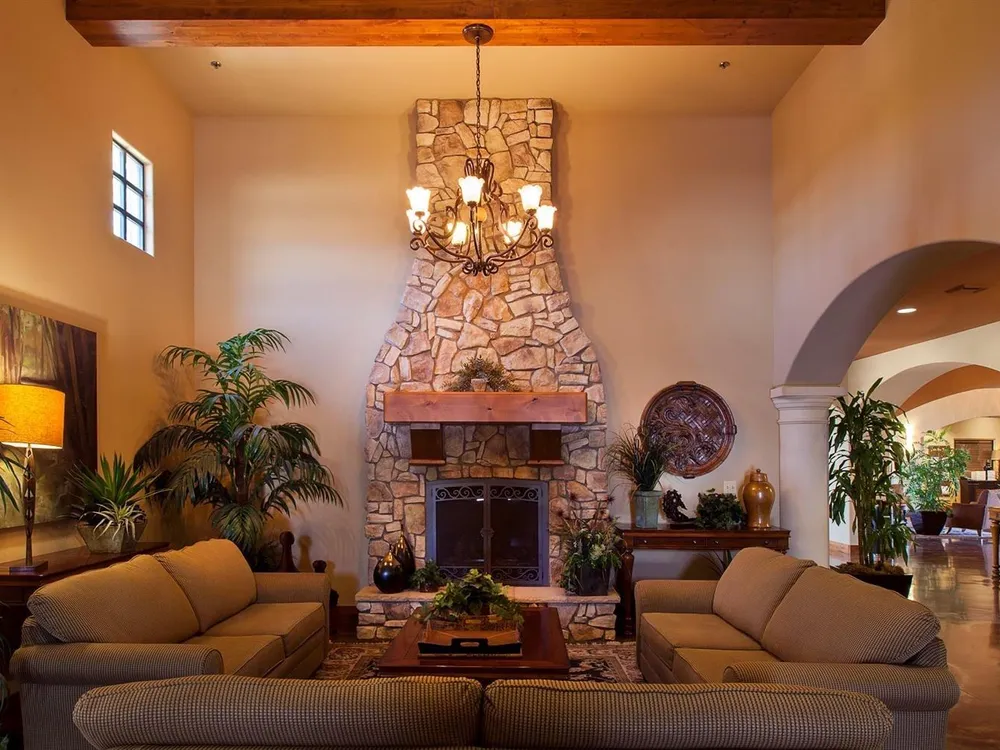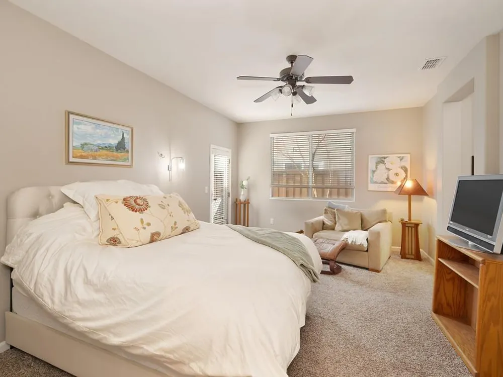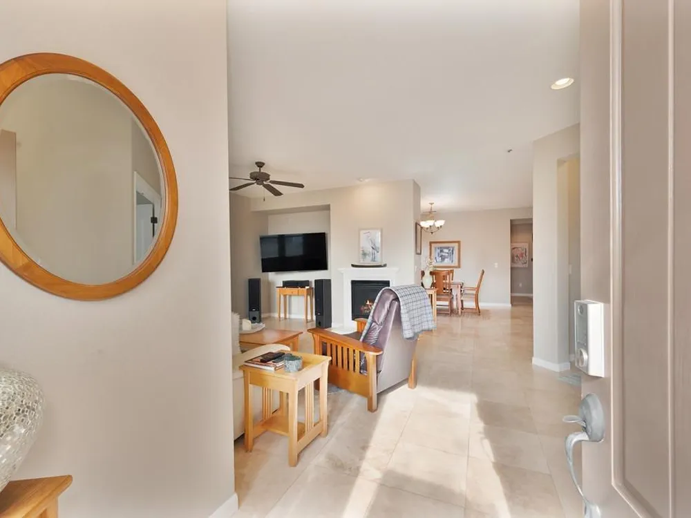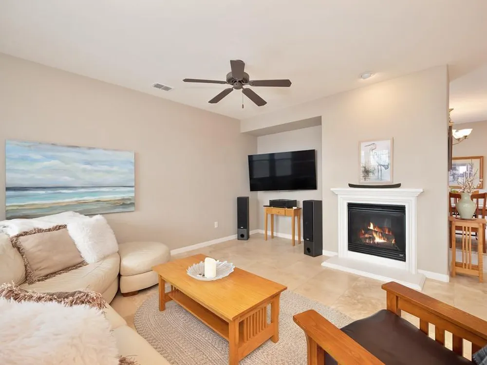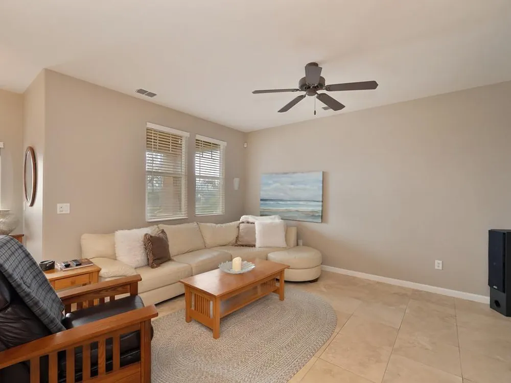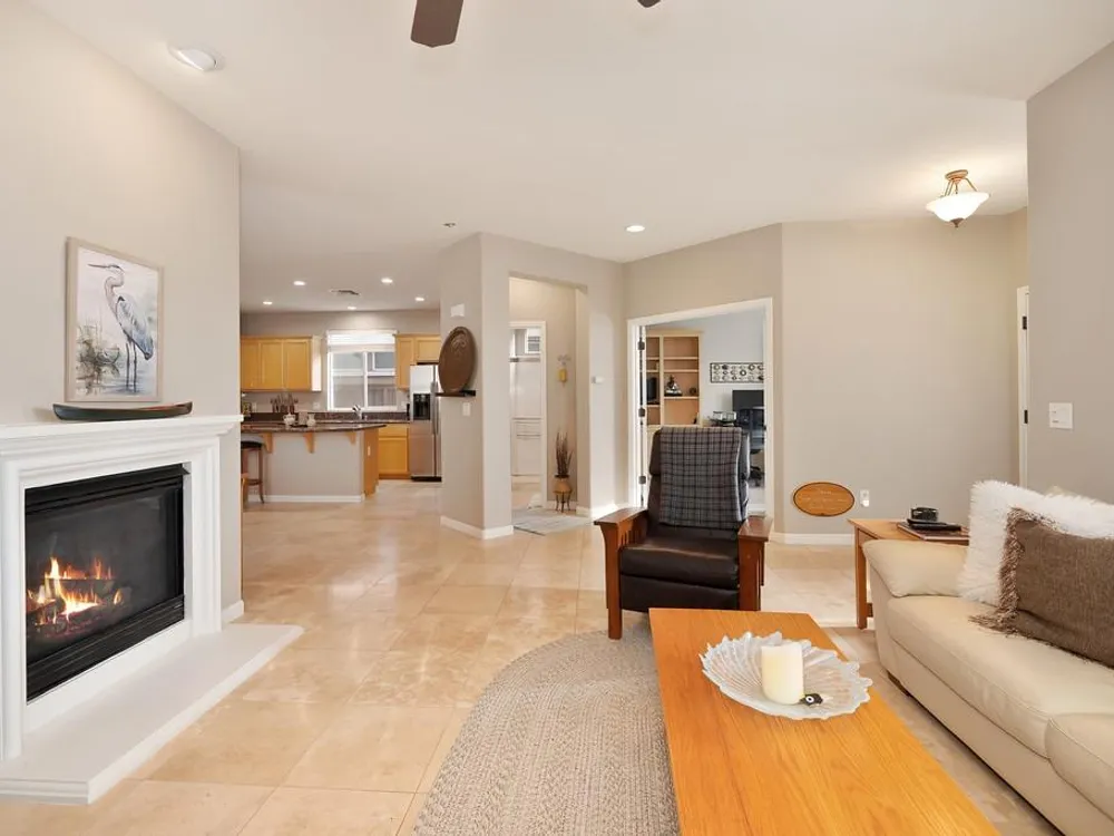 Be captivated by this charming Craftsman-inspired bungalow. This homes' welcoming, ample covered front porch transitions inside into a spacious open concept living area with a gas fireplace and travertine flooring that flows beautifully throughout the main living spaces. The chef's kitchen is designed for both function and style, with an oversized entertaining island, granite counters, pull-out shelving, and stainless steel appliances. The dining area and primary suite offer direct patio access. The primary en-suite master bath with oversized soaking tub, double sinks and huge walk-in-closet is tucked away at the rear of the home. Experience a lifestyle of relaxation and recreation- with close access to the airport and downtown, vibrant Four Seasons at Westshore, a 55+ active adult community, includes the Lodge with large ballroom, gym, yoga studio, library, movie theater, billiards, card room and just behind it, a resort-style swimming pool, spa, fireplace, barbecue area, and pickle ball /tennis courts. With walking and biking trails winding around the 26-acre lake, nature is always at your doorstep.