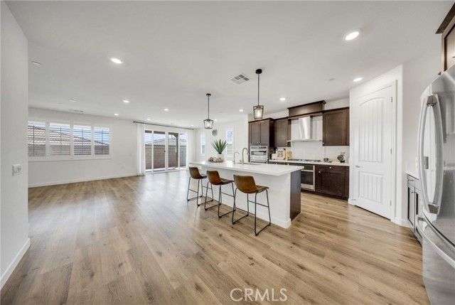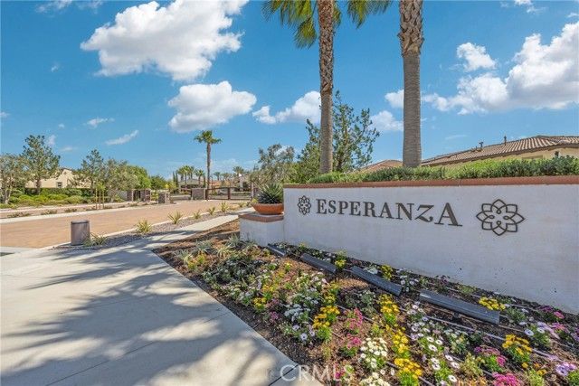 Highly desirable Esperanza 55+ gated community! This resort-style, low-maintenance home is ideally located just steps from the clubhouse. The community features exceptional amenities including a pool, fitness center, pickleball courts, BBQ areas, fire pits, and a dog park. Inside, discover a bright and open layout with high ceilings, a spacious living area, and a modern kitchen centered around a large island. Oversized sliding glass doors connect seamlessly to the backyard patio, creating a wonderful indoor-outdoor living experience. The primary suite includes a large walk-in closet and a spacious en-suite bathroom. Notable property features include brand-new flooring throughout, a whole-house water filtration system, and a fully paid-off solar system. The beautifully maintained grounds offer a loquat tree in the front yard and a pomegranate tree in the backyard. Super convenient location close to Costco, 99 Ranch Market, a future Whole Foods (opening 2027), and providing easy access to the 15, 60, and 91 freeways. Located approximately 15 minutes to Ontario International Airport. This home is perfectly designed for a comfortable and convenient lifestyle.