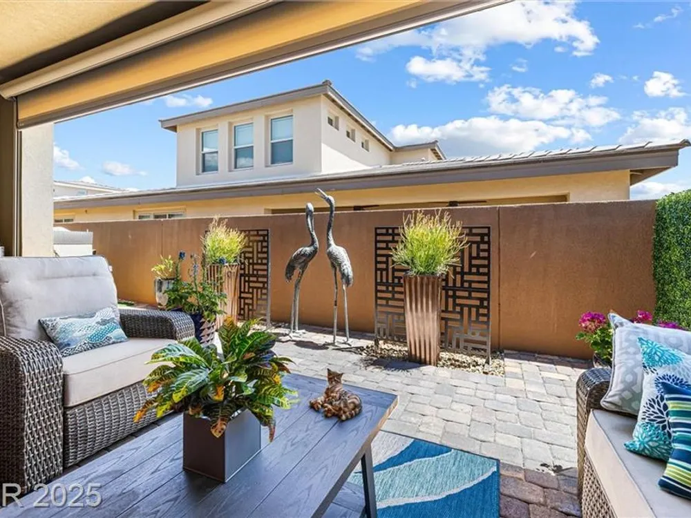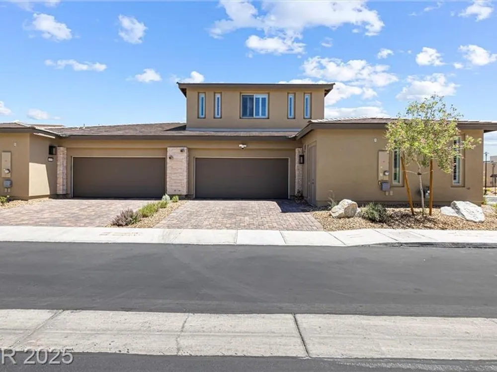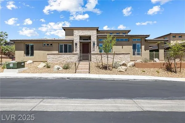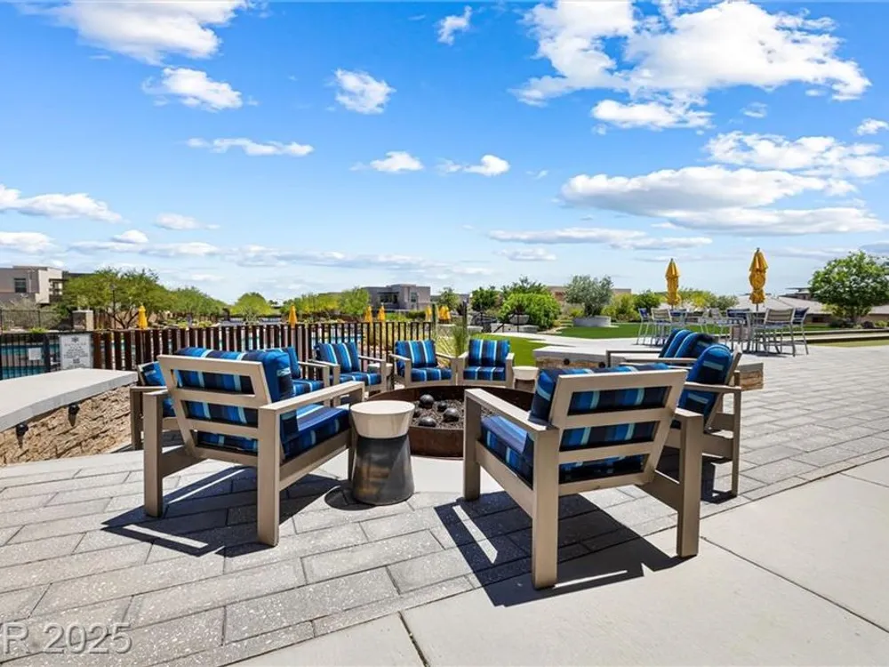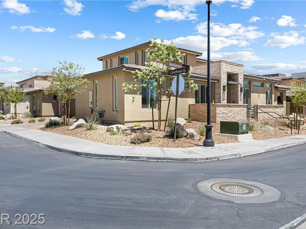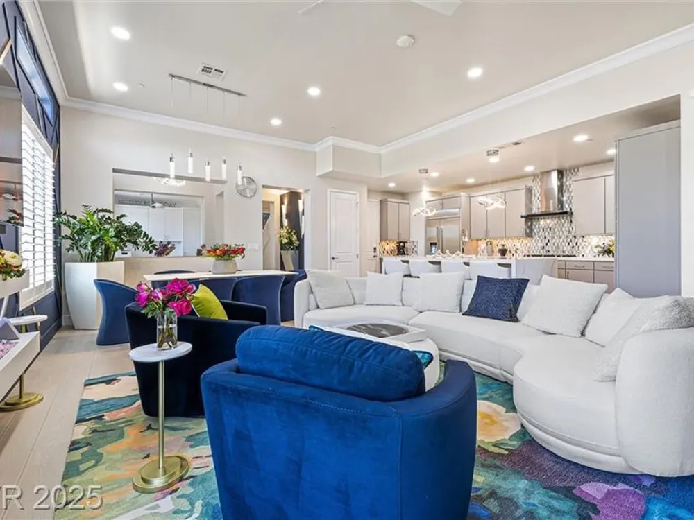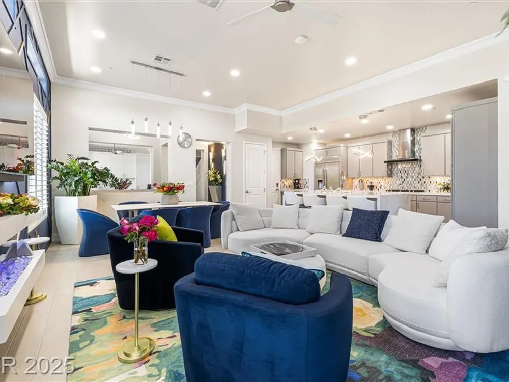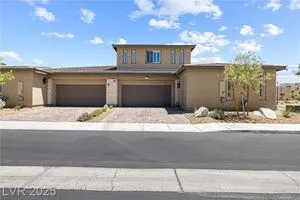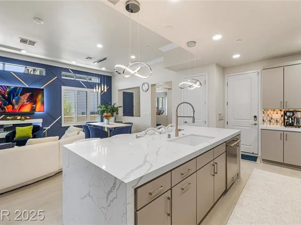55+ Community in the Desirable Guard Gated Community of Trilogy in Summerlin. This 2 Level Townhouse has a Modern Open Concept that is comfortable and luxurious. The Kitchen Boasts Stylish Quartz Countertops, A Large Island with a Double Waterfall Countertop, Upgraded Stainless Steel Appliances, Walk In Pantry, Recessed Lighting, Contemporary Lighting, and under Cabinet Lighting . Enjoy the Custom Crown Molding as it is present throughout the home. The Contemporary Accent Wall in the Living Room features a large Electric Fireplace. The Primary Bedroom is on the first floor and has an Ensuite Bathroom with a Custom Vanity with Dual Sinks, a Walk In Closet with Built Ins and an Oversized Shower. There is a Large Loft upstairs and another Bedroom with an ensuite Bathroom and an Electric Fireplace. The covered patio has Pavers and Polar Shades. The owner spared no expense with Upgrades. The Community offers considerable Amenities for Everyone.