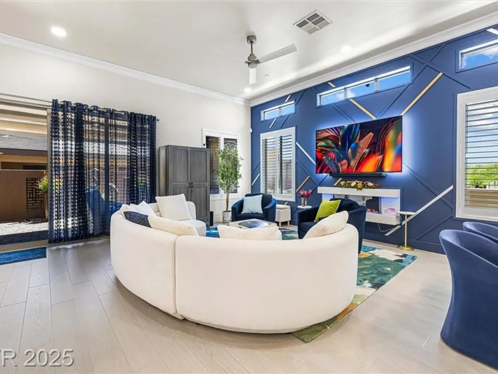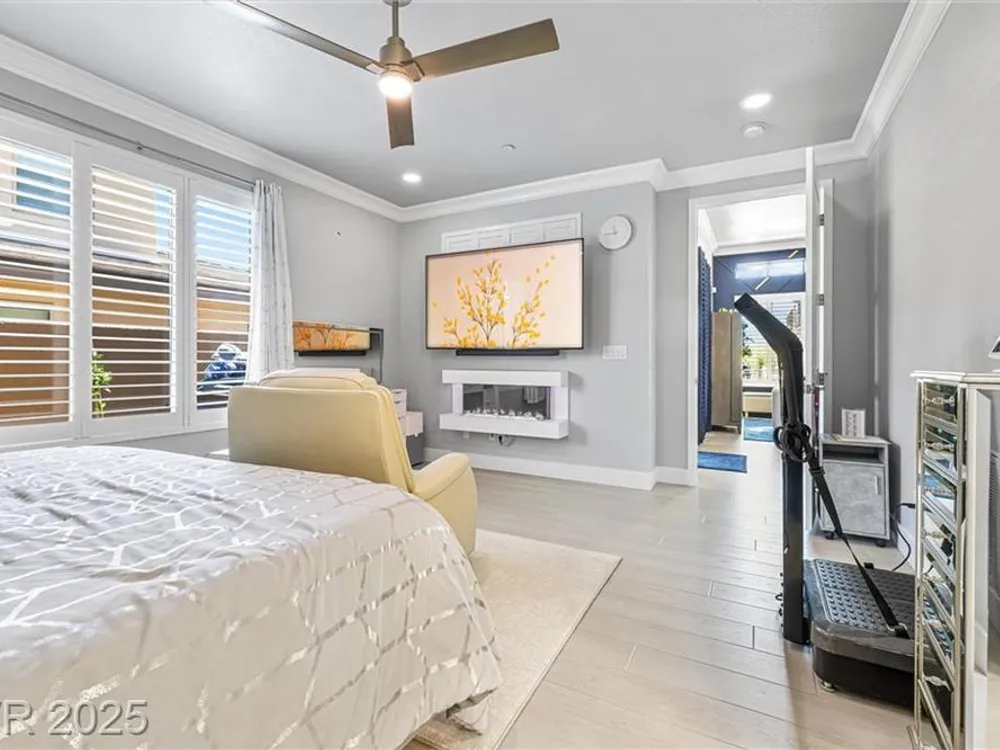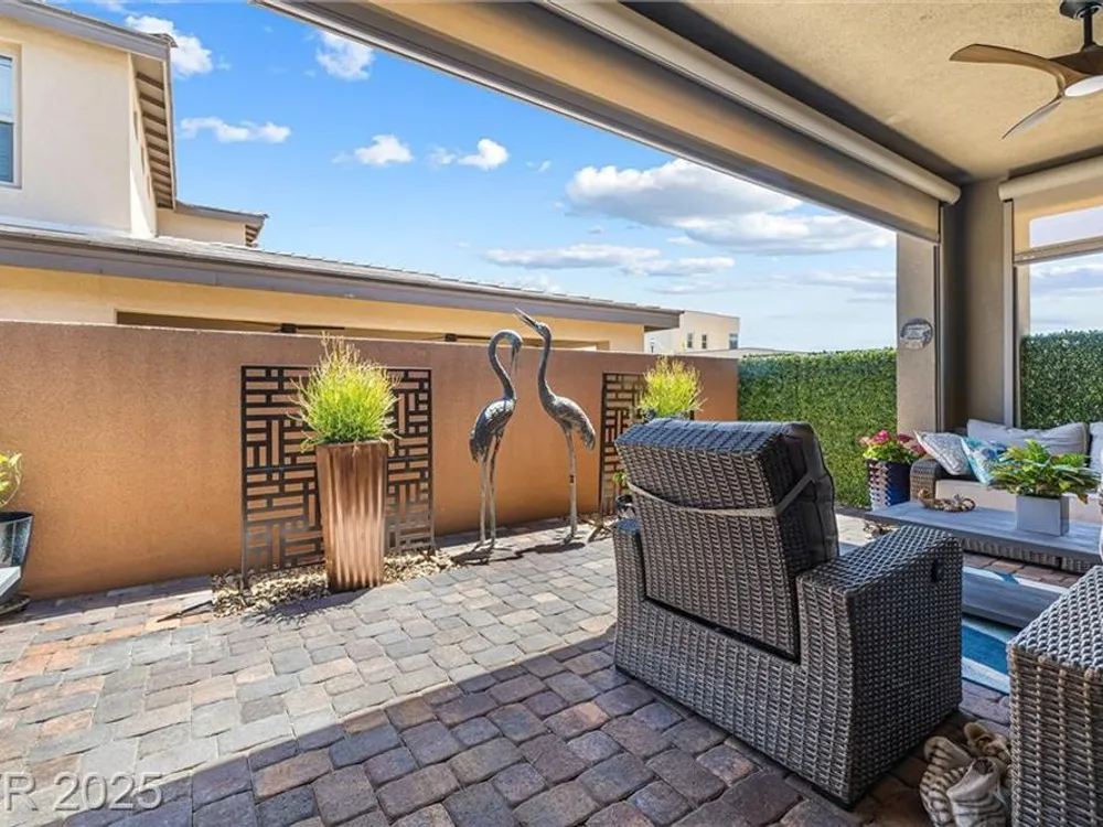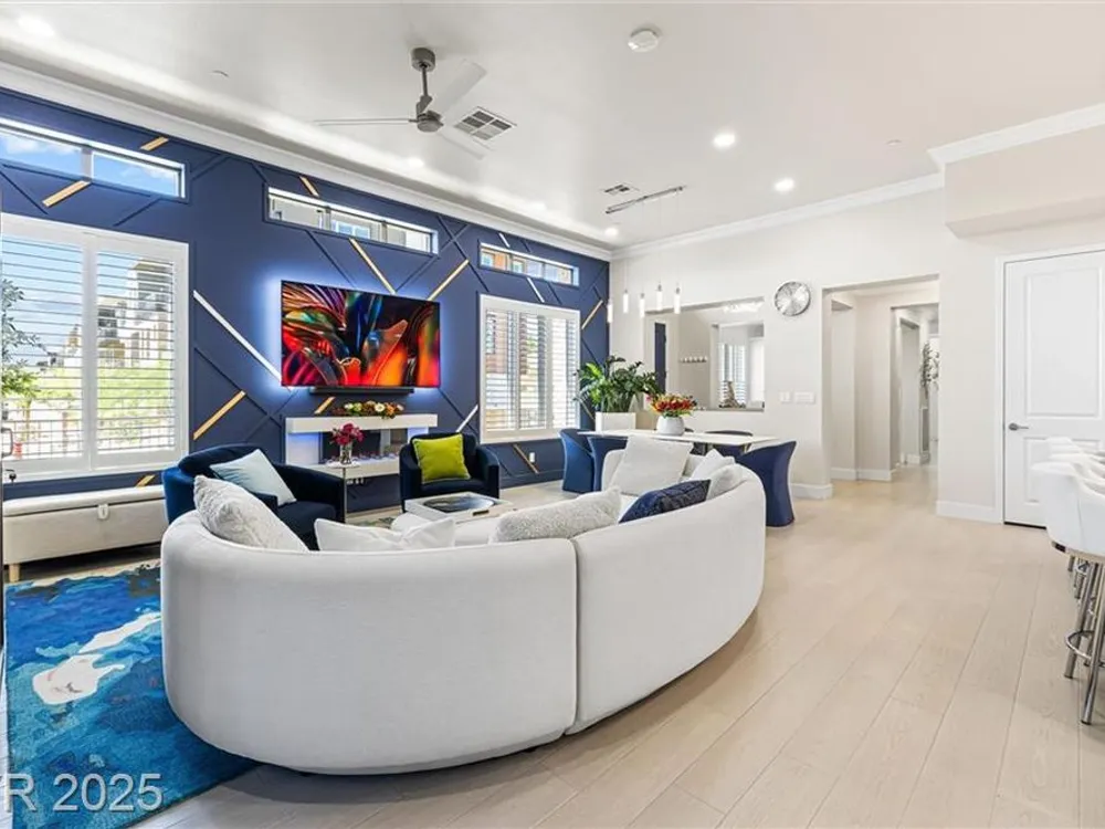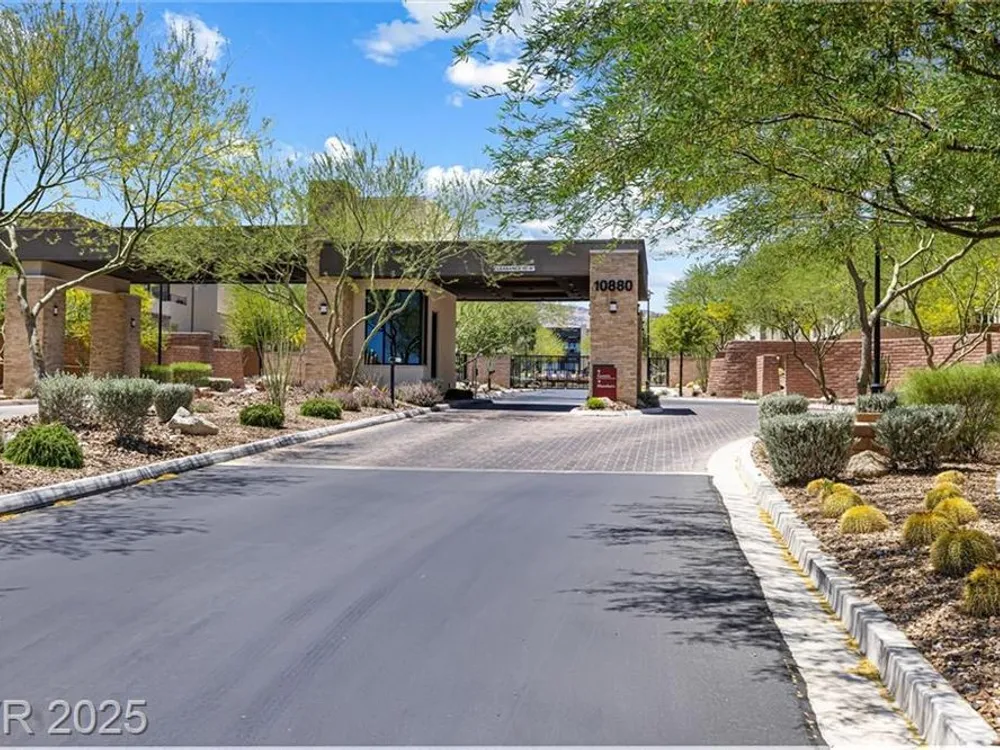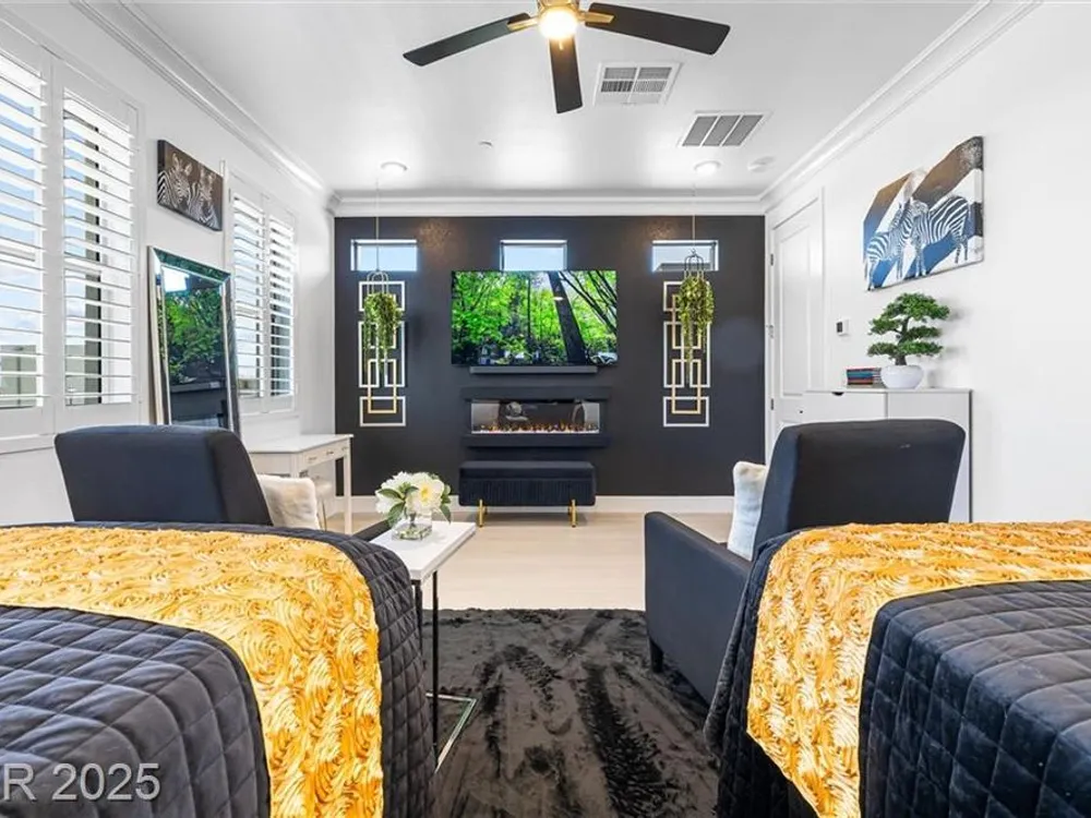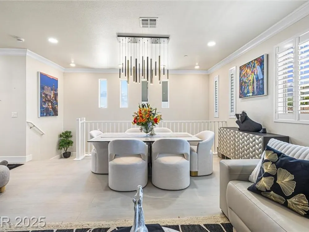 55+ Community in the Desirable Guard Gated Community of Trilogy in Summerlin. This 2 Level Townhouse has a Modern Open Concept that is comfortable and luxurious. The Kitchen Boasts Stylish Quartz Countertops, A Large Island with a Double Waterfall Countertop, Upgraded Stainless Steel Appliances, Walk In Pantry, Recessed Lighting, Contemporary Lighting, and under Cabinet Lighting . Enjoy the Custom Crown Molding as it is present throughout the home. The Contemporary Accent Wall in the Living Room features a large Electric Fireplace. The Primary Bedroom is on the first floor and has an Ensuite Bathroom with a Custom Vanity with Dual Sinks, a Walk In Closet with Built Ins and an Oversized Shower. There is a Large Loft upstairs and another Bedroom with an ensuite Bathroom and an Electric Fireplace. The covered patio has Pavers and Polar Shades. The owner spared no expense with Upgrades. The Community offers considerable Amenities for Everyone.