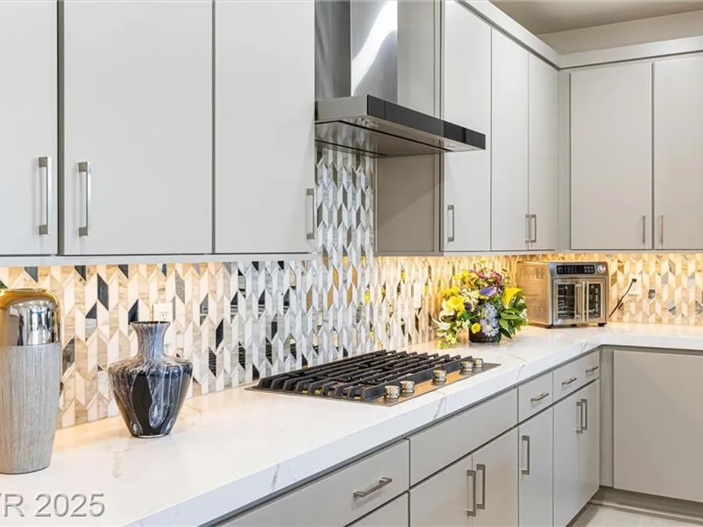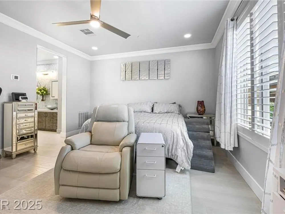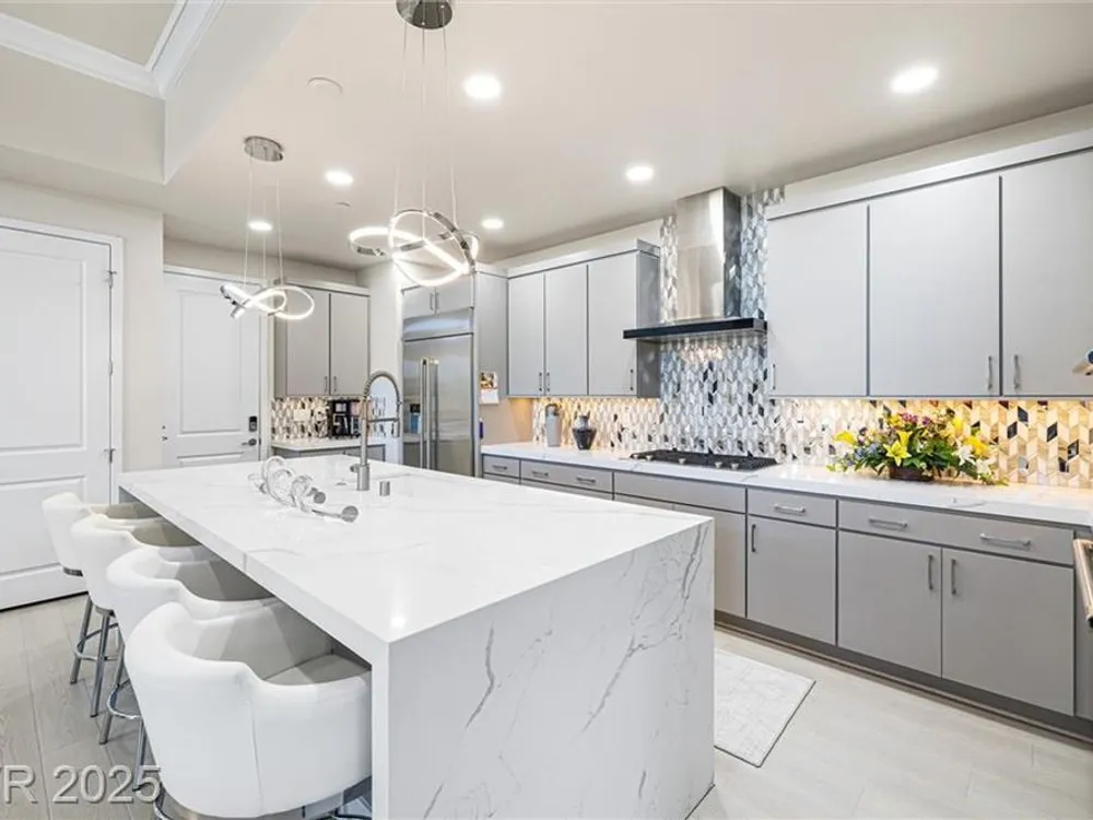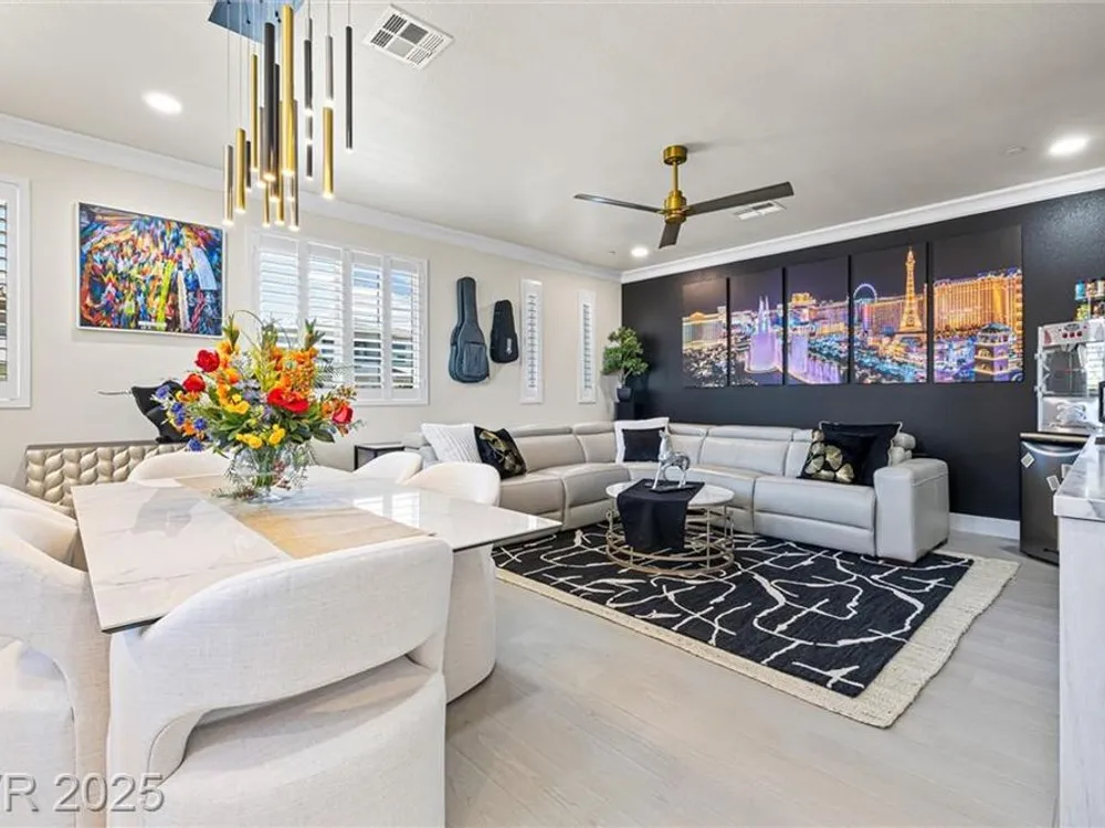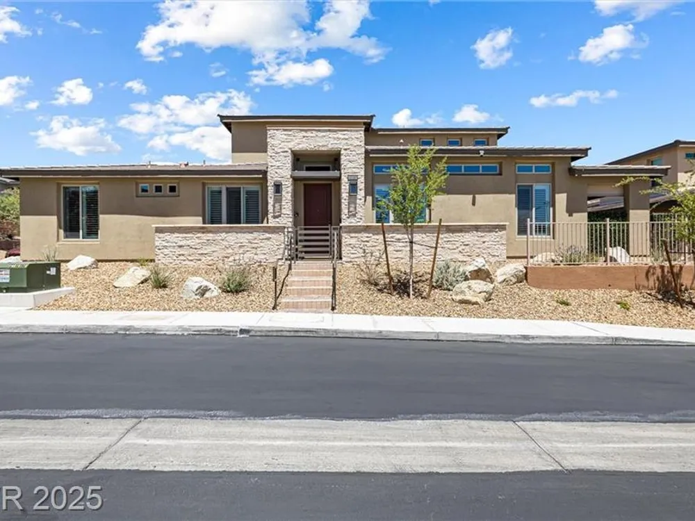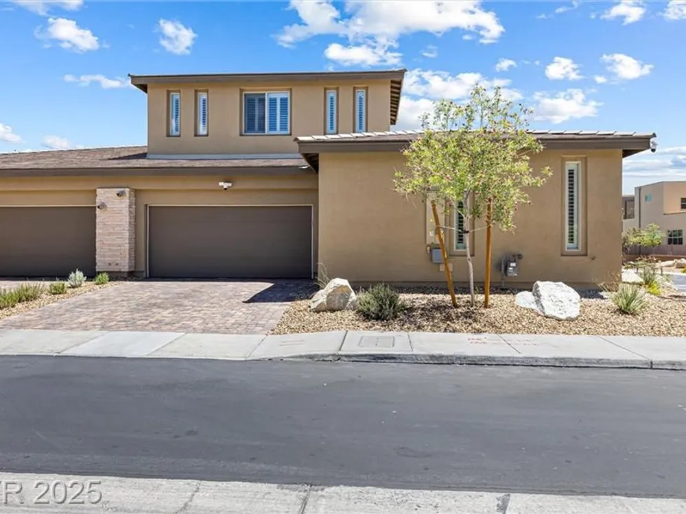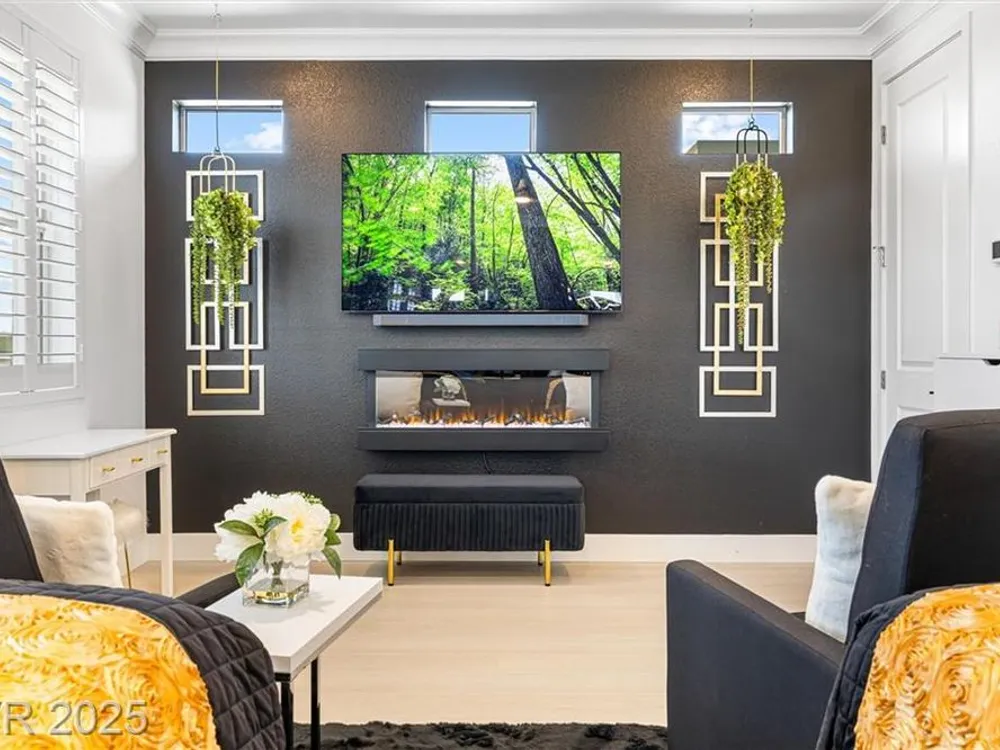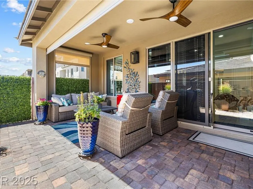 55+ Community in the Desirable Guard Gated Community of Trilogy in Summerlin. This 2 Level Townhouse has a Modern Open Concept that is comfortable and luxurious. The Kitchen Boasts Stylish Quartz Countertops, A Large Island with a Double Waterfall Countertop, Upgraded Stainless Steel Appliances, Walk In Pantry, Recessed Lighting, Contemporary Lighting, and under Cabinet Lighting . Enjoy the Custom Crown Molding as it is present throughout the home. The Contemporary Accent Wall in the Living Room features a large Electric Fireplace. The Primary Bedroom is on the first floor and has an Ensuite Bathroom with a Custom Vanity with Dual Sinks, a Walk In Closet with Built Ins and an Oversized Shower. There is a Large Loft upstairs and another Bedroom with an ensuite Bathroom and an Electric Fireplace. The covered patio has Pavers and Polar Shades. The owner spared no expense with Upgrades. The Community offers considerable Amenities for Everyone.