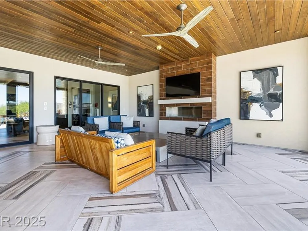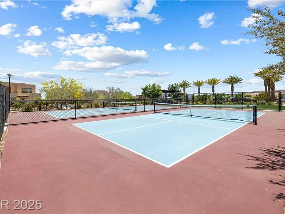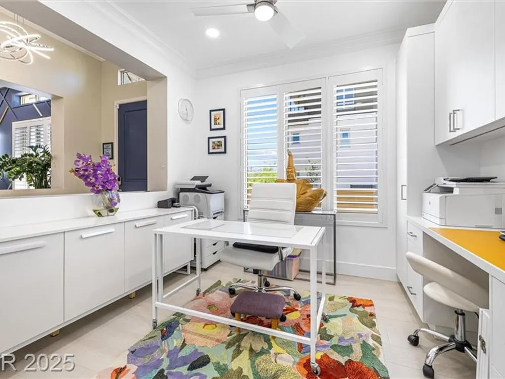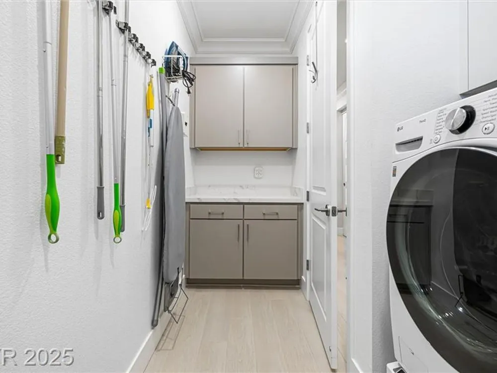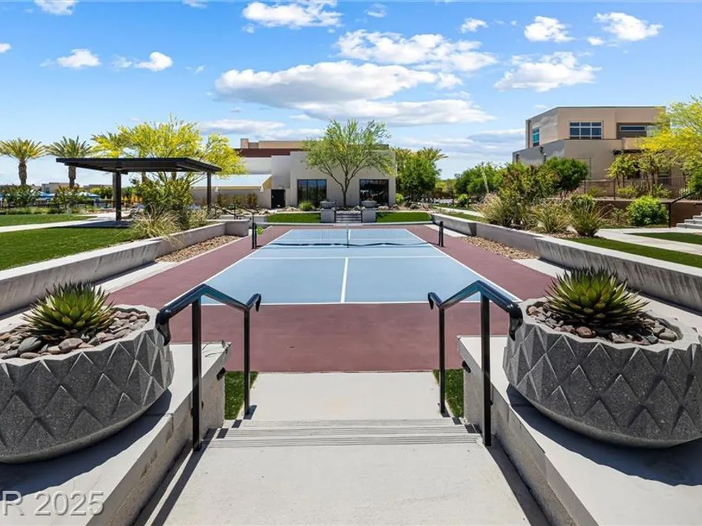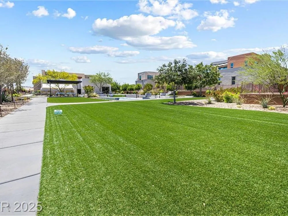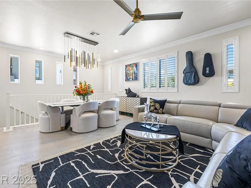 55+ Community in the Desirable Guard Gated Community of Trilogy in Summerlin. This 2 Level Townhouse has a Modern Open Concept that is comfortable and luxurious. The Kitchen Boasts Stylish Quartz Countertops, A Large Island with a Double Waterfall Countertop, Upgraded Stainless Steel Appliances, Walk In Pantry, Recessed Lighting, Contemporary Lighting, and under Cabinet Lighting . Enjoy the Custom Crown Molding as it is present throughout the home. The Contemporary Accent Wall in the Living Room features a large Electric Fireplace. The Primary Bedroom is on the first floor and has an Ensuite Bathroom with a Custom Vanity with Dual Sinks, a Walk In Closet with Built Ins and an Oversized Shower. There is a Large Loft upstairs and another Bedroom with an ensuite Bathroom and an Electric Fireplace. The covered patio has Pavers and Polar Shades. The owner spared no expense with Upgrades. The Community offers considerable Amenities for Everyone.