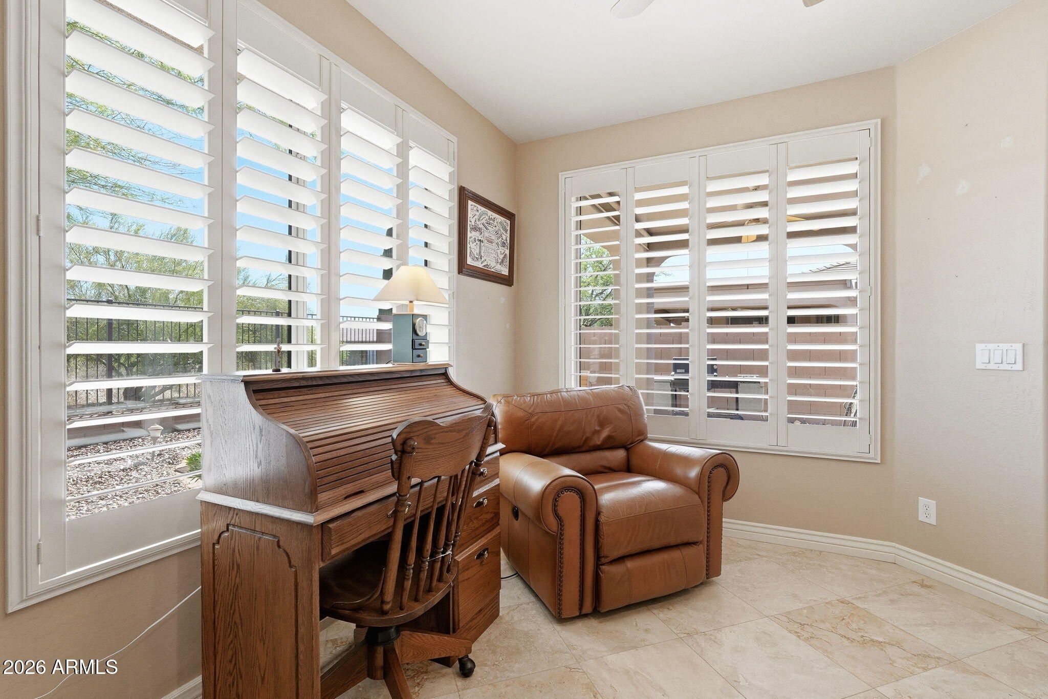 This Acadia floorplan in Anthem Country Club has been lovingly maintained by its original owners. Set on a wash lot, the backyard offers a sense of openness with a subtle view of Daisy Mountain. The yard is finished with extensive pavers & a firepit. A gated front courtyard creates an extra layer of usable outdoor space. Inside, the layout offers 2 bedrooms + a den/office. Travertine flooring runs through the main living areas, with luxury vinyl in the bedrooms - no carpet anywhere. Shutters throughout. The kitchen features granite counters & stainless appliances, and the guest bath has been beautifully remodeled. Gas fireplace & custom wood media wall. Soft water system, RO + washer/dryer. Near Persimmon with convenient access to golf, dining, fitness, and everything Anthem has to offer.