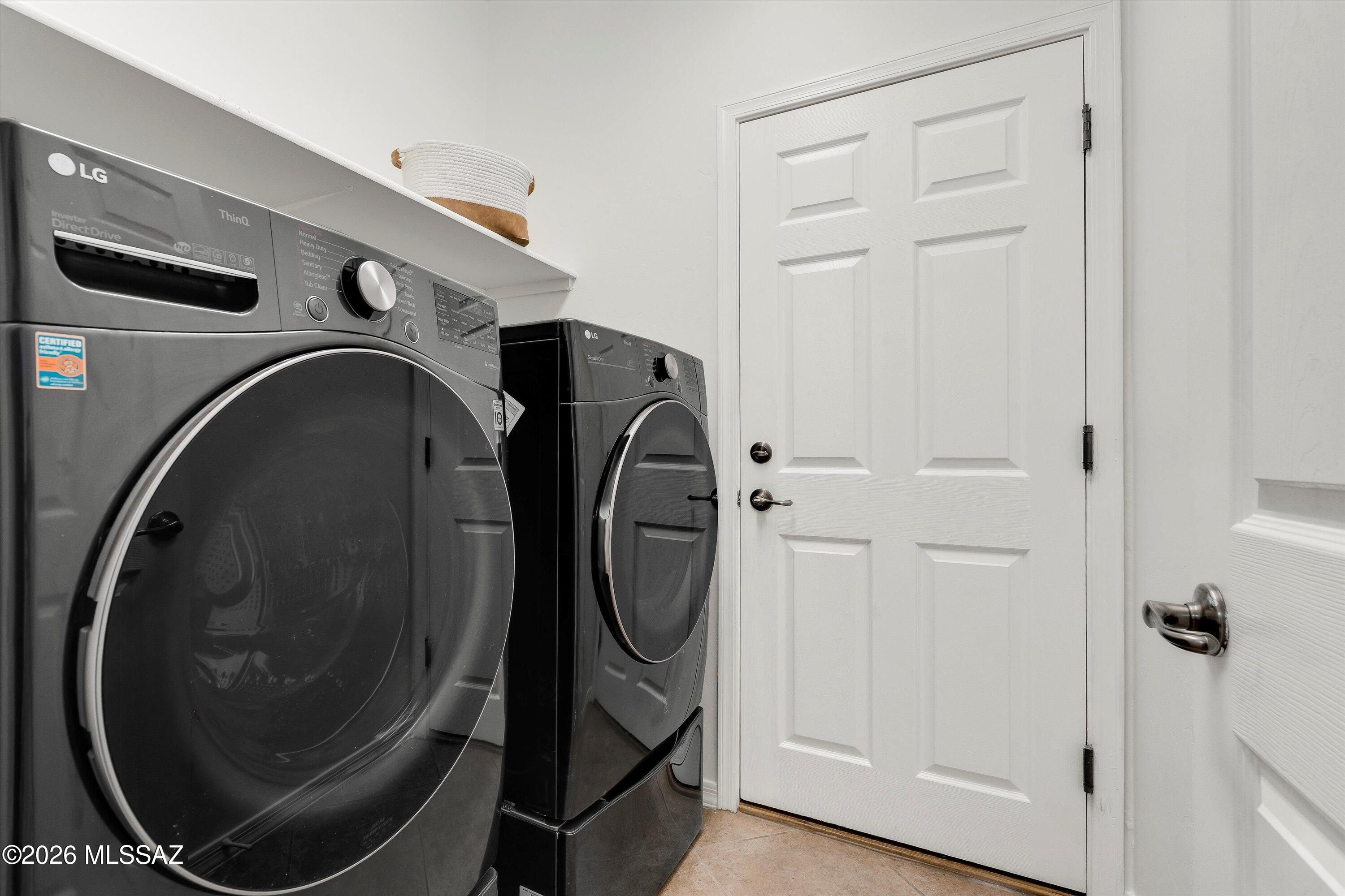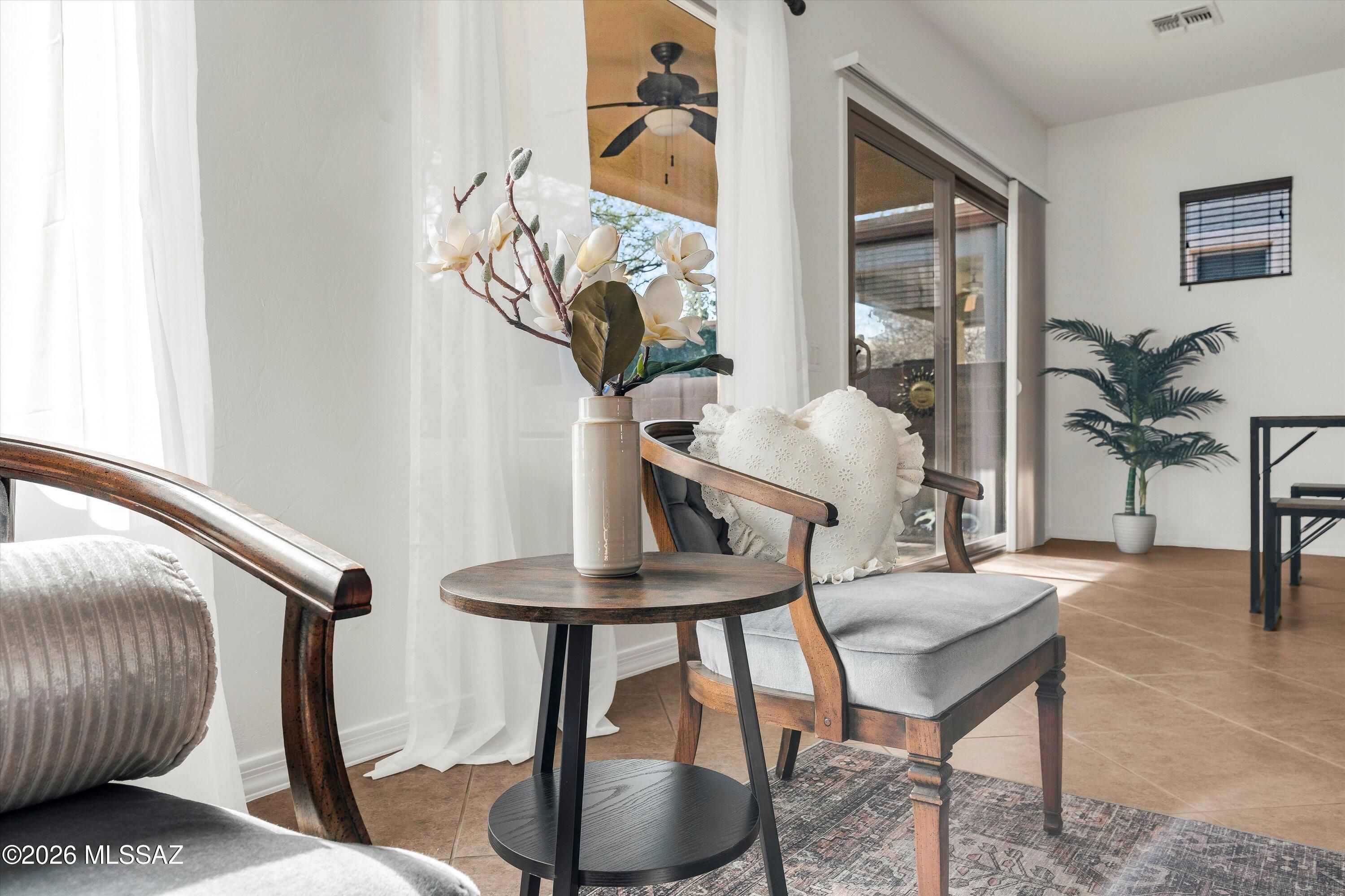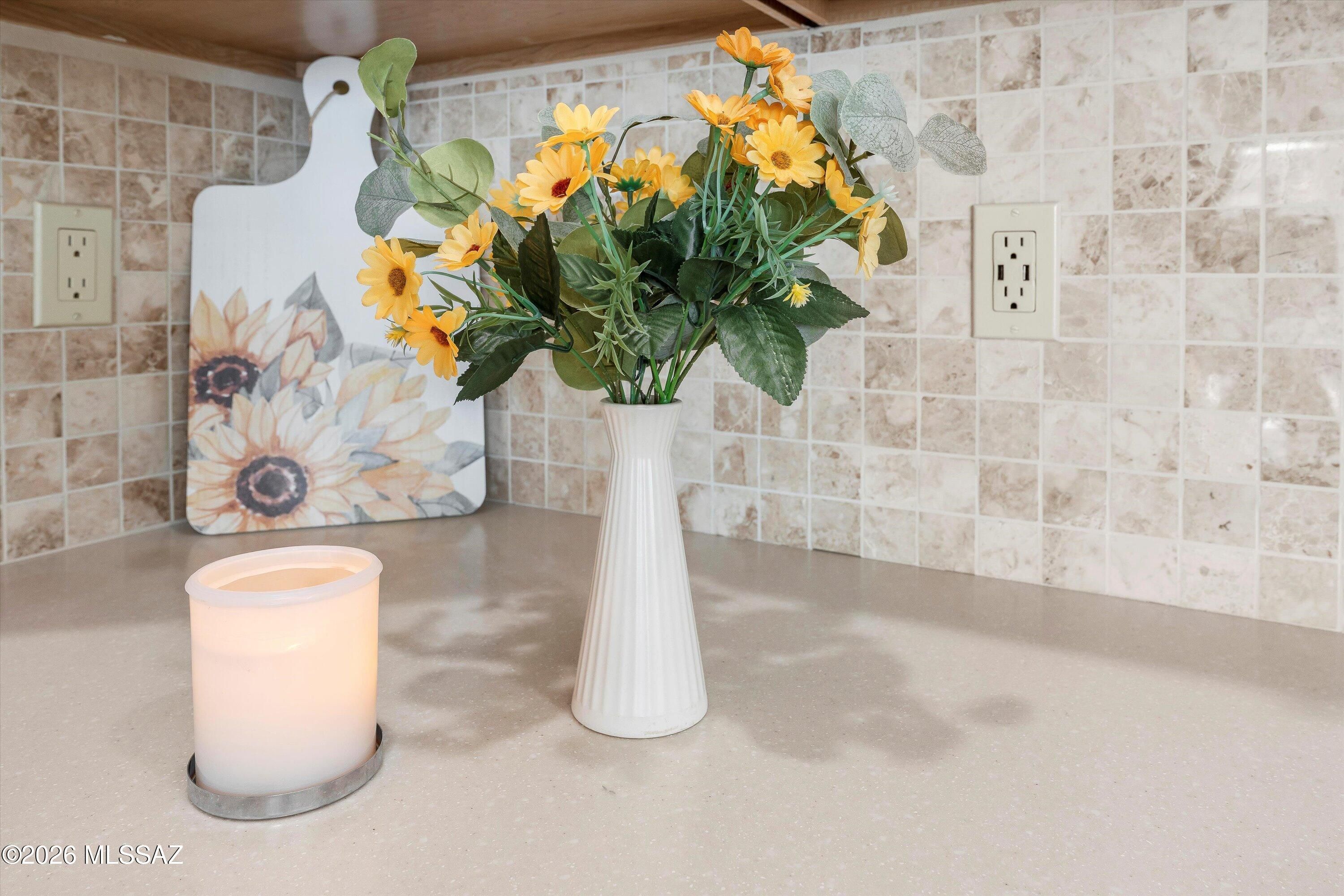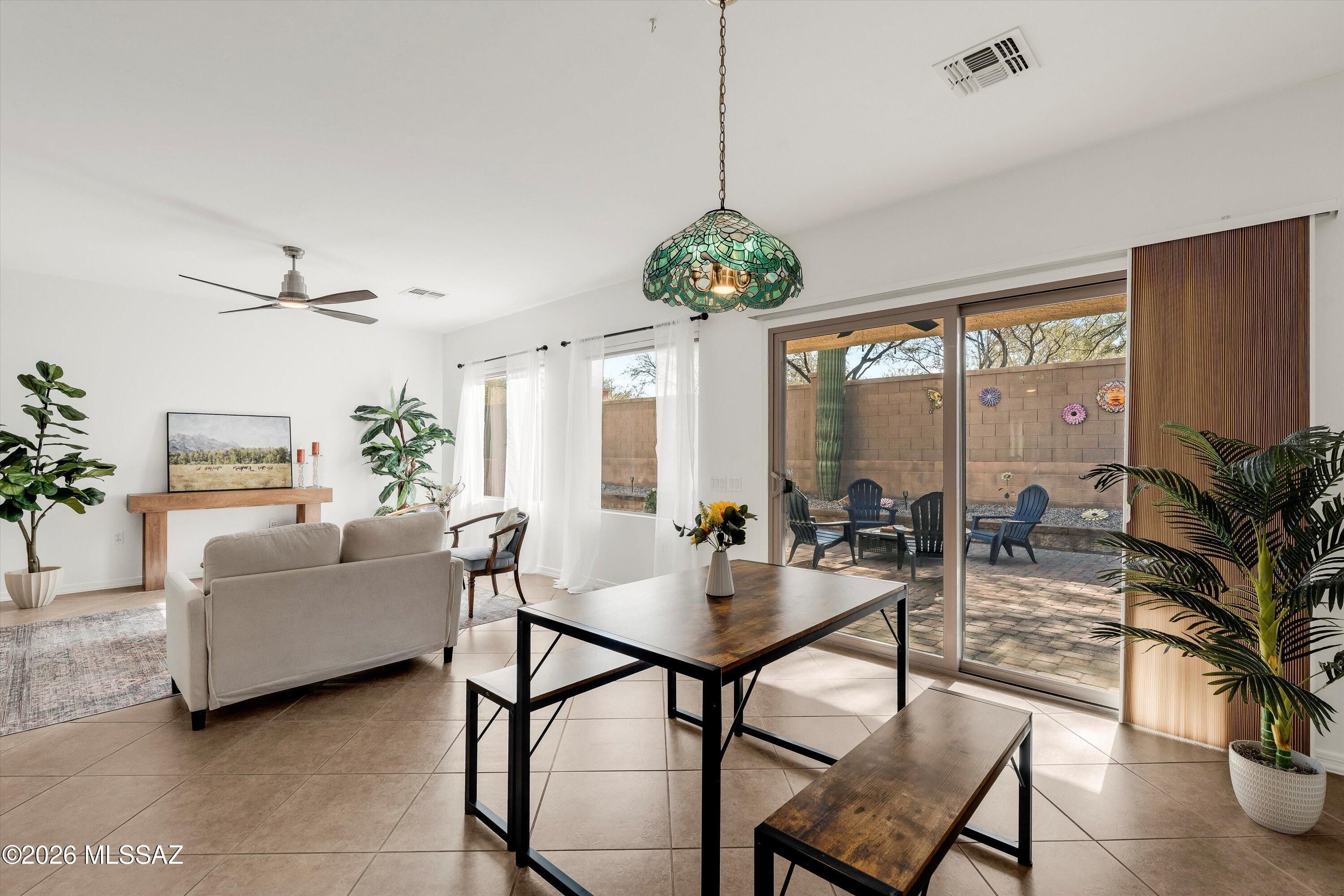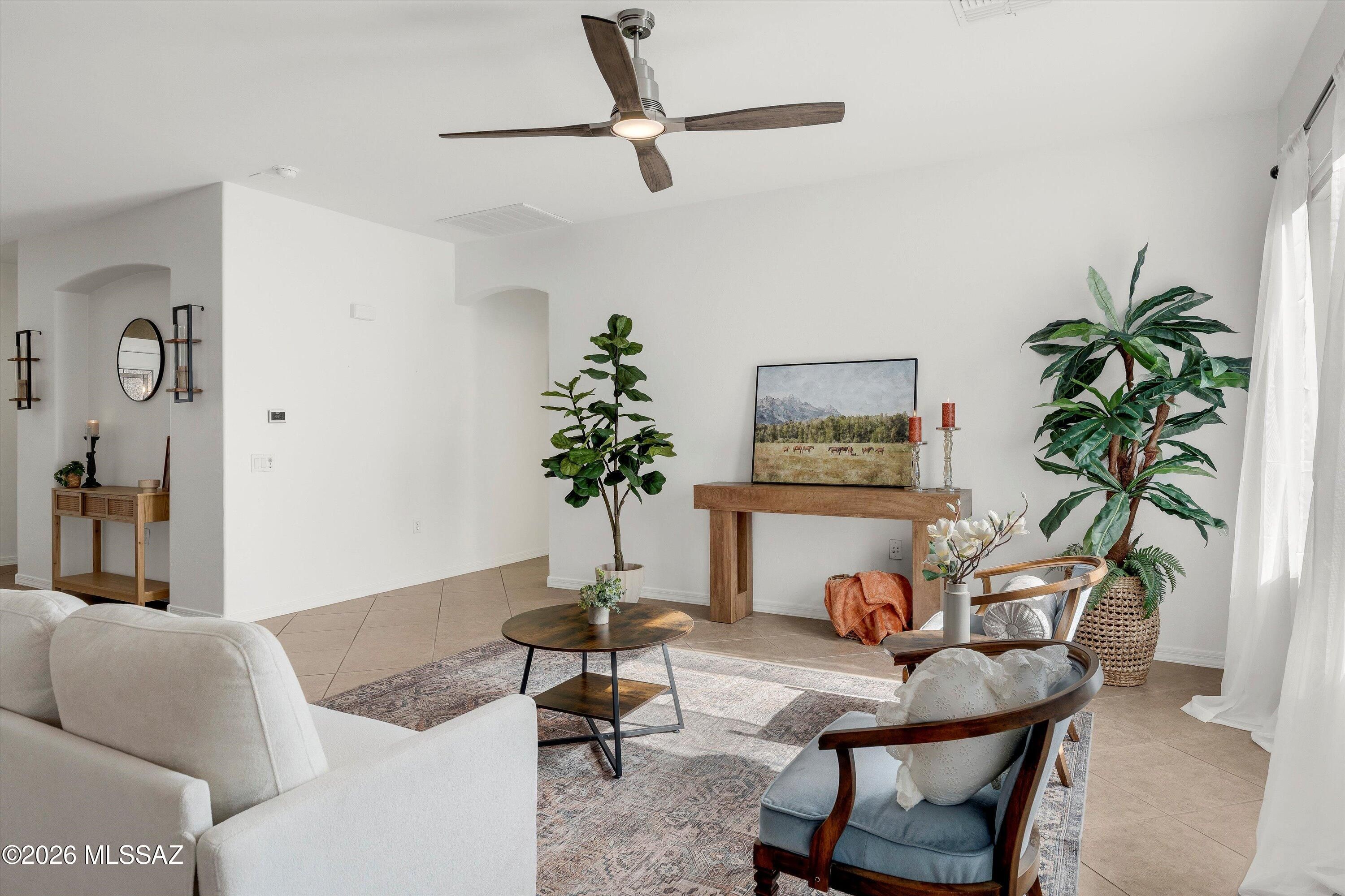 Welcome to this beautifully maintained home located in the desirable active adult community of Del Webb at Rancho Sahuarita. Light, bright, and thoughtfully designed, this home offers a spacious great-room layout with fresh interior paint and neutral tile flooring throughout.The stunning kitchen is both functional and inviting, featuring Corian countertops, a stone backsplash, stainless steel appliances, and an abundance of cabinetry, perfect for everyday living and entertaining alike. The open-concept design flows seamlessly into the living and dining spaces, creating a welcoming atmosphere filled with natural light.