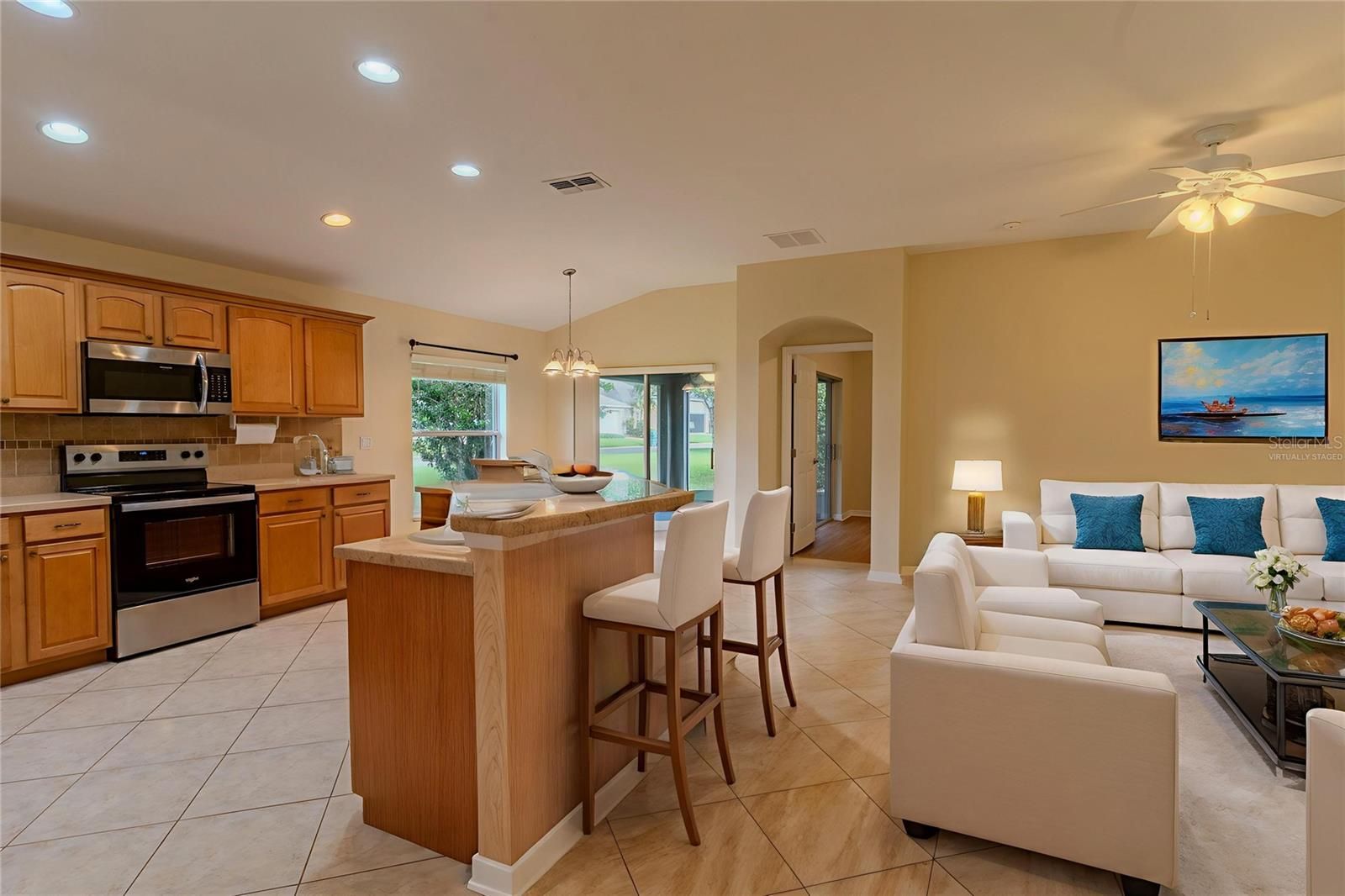 One or more photo(s) has been virtually staged. Step into your dream lifestyle with this stunning 3-bedroom, 2-bathroom gem perched on a desirable corner lot in the highly sought-after gated community of Traditions! This well-maintained home is a perfect blend of comfort and elegance, designed for those who appreciate both style and function. As you enter, you’ll be greeted by an inviting open concept layout that seamlessly integrates the living, dining, and kitchen areas—ideal for entertaining or simply enjoying a quiet evening at home. The thoughtful split bedroom design ensures privacy and tranquility for everyone. The heart of this home is the kitchen, boasting all brand-new stainless steel appliances, including a dishwasher, stove, side-by-side refrigerator with an in-door ice dispenser, garbage disposal, and a hot water heater. Cooking and entertaining will be a delight in this modern space! Step outside to your screened-in patio, perfectly designed for savoring the beautiful Florida weather! With a ceiling fan to keep you cool, this outdoor oasis is easily accessible from both the kitchen and the primary bedroom, making it a perfect spot for morning coffee or evening relaxation. The spacious primary bedroom features a fantastic walk-in closet equipped with shelving, ensuring ample storage. The en suite bathroom is a true retreat, showcasing a standalone garden tub, a walk-in shower, and dual sinks with a shared vanity—luxury at its finest! Freshly painted interiors and a pristine garage floor add to the home's appeal, making it move-in ready! Situated on a charming corner lot, this home offers added privacy and an abundance of natural light. Traditions is more than just a residence; it’s a vibrant 55+ community brimming with amenities designed for your enjoyment and well-being. With remote-controlled gated entry, you’ll feel secure in your new haven. Take advantage of the clubhouse, dog park, fitness center, pool, and tennis courts—all at your fingertips! And yes, golf carts are welcome in this community, so you can explore in style. The HOA covers access to all amenities, cable, internet, and common area maintenance, ensuring a hassle-free lifestyle. Don’t miss out on this incredible opportunity—schedule your showing today and discover the lifestyle you’ve been dreaming of in Traditions!