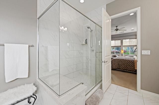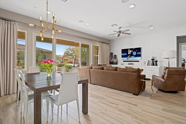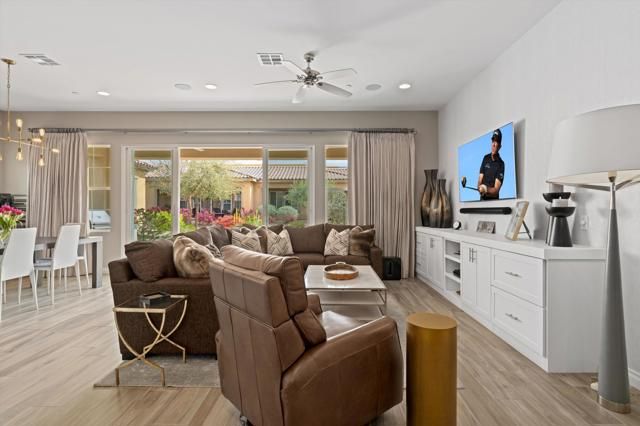 Show Stopper! Designer Turnkey Furnished! Impeccably appointed 3 bedroom, plus a Den/Office, 2.5 bath condo w/no adjoining walls like a SF detached home in the prestigious, gated 55+ community of Villa Portofino! 1 owner, purchased from the builder customized & upgraded every detail during construction, transforming this home into a stunning model-like masterpiece. Gently used as a second home, it is in pristine condition and ready for its next owner. Professionally designed w/custom lighting throughout, custom wallpaper, plank wood-look ceramic tile flooring, & luxurious quartz countertops. Custom shutters, drapery, & shades, Sonos entertainment system throughout the home and patio, water softener, purified water AR, tankless water heater, and leased solar system. A spectacular open-concept kitchen w/double ovens, 2 wine captains, extended custom cabinetry, a spacious center island, & a dedicated desk area--perfect for any home chef or entertainer. Greatroom is designed w/custom built-in cabinets for entertainment storage, this expansive space is seamlessly connected to the kitchen & dining area opening to the patio w/built-in BBQ, firepit w/seating overlooking lovely garden. Office/Den featuring double glass door entry, built-in shelving, drawers, & a stylish glass desk, this space is enhanced with elegant wainscoting and custom designer wallpaper. Luxurious Primary Suite with custom nightstands, a floating built-in dresser, & designer wallpaper, w/French door leading to the patio & garden. Primary bath is an upgraded sanctuary w/a Jacuzzi spa tub, custom cabinetry in the separate toilet room, custom built-ins in the closet, with mirrored closet doors on both sides. Guest Bedrooms are beautifully appointed w/custom wood-framed mirror doors & stylish wallpaper, providing an inviting space for family & guests. Garage has epoxy floors, built-in storage cabinets, & an AC unit. Villa Portofino has a 30,000 sq. ft. Clubhouse: Enjoy access to a gym, yoga studio, card & game rooms, library, & 100-seat cinema w/weekly feature films. A billiards room, sports bar, dining room, & bistro with indoor/outdoor bar ensure endless options for fun and relaxation. Relax at the resort-style pool & spa w/shade cabanas, bocce ball, shuffleboard, dog park, and putting greens, all surrounded by tranquil water fountains, ponds, meandering streams, and picturesque bridges. Leased solar 100. per mo. EVERYTHING is included as shown-Furn, artwork, linens, kitchenware etc.