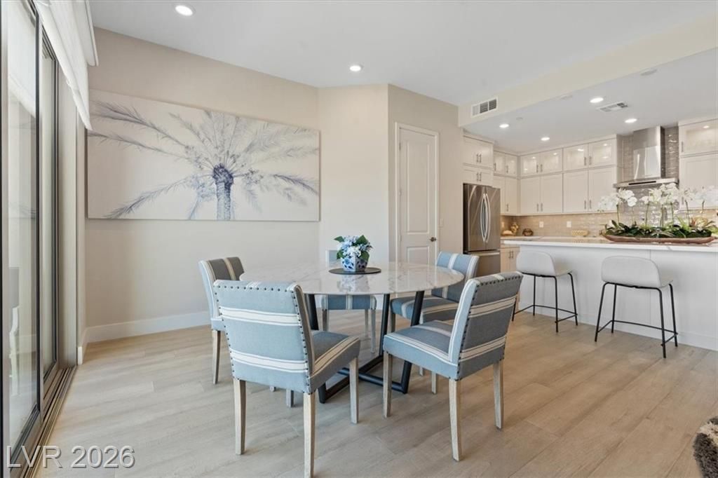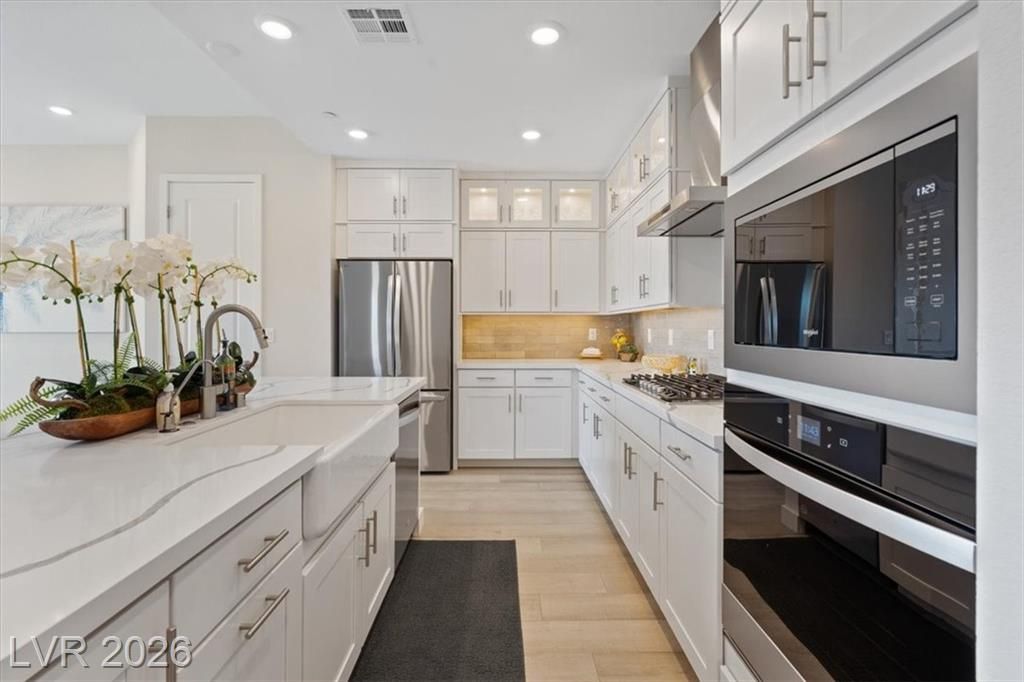 LOCATED IN DESIRABLE GUARD-GATED TRILOGY. THIS STUNNING INSPIRE FLOOR PLAN OFFERS EXCEPTIONAL UPGRADES, SUCH AS LUXURY VINYL PLANKING AND CUSTOM SHUTTERS. THE FIRST LEVEL FEATURES A SPACIOUS DEN/BEDROOM, WHICH INCLUDES A WALK-IN SHOWER, WET BAR & CUSTOM BARN DOORS, PROVIDING FLEX SPACE FOR WORK, HOBBIES, OR GUEST QUARTERS. TAKE YOUR PRIVATE ELEVATOR TO THE SECOND FLOOR, A BRIGHT, OPEN GREAT ROOM SEAMLESSLY CONNECTED TO THE GOURMET KITCHEN. THE CHEFS ISLAND IS IDEAL FOR ENTERTAINING, COMPLEMENTED BY CUSTOM CEILING TO FLOOR CABINETS WITH LIGHTING, & BEAUTIFUL BACKSPLASH. TRIPLE SLIDERS WILL LEAD YOU TO THE BALCONY WHERE YOU CAN ENJOY THE QUIET & CALM SUMMERLIN VIEWS. A LAVISH PRIMARY RETREAT & SPA-LIKE BATH FOR RELAXATION. IF YOU ARE 55+ & LOOKING FOR MORE THAN JUST A HOME, THIS IS THE PLACE. THIS IS WHERE NEIGHBORS BECOME FRIENDS, AND EVENTS BRING PEOPLE TOGETHER. THE LIFESTYLE IS CENTERED AROUND THE OUTLOOK CLUBHOUSE, MAKING IT ONE OF THE MOST SOUGHT-AFTER 55+ COMMUNITIES.