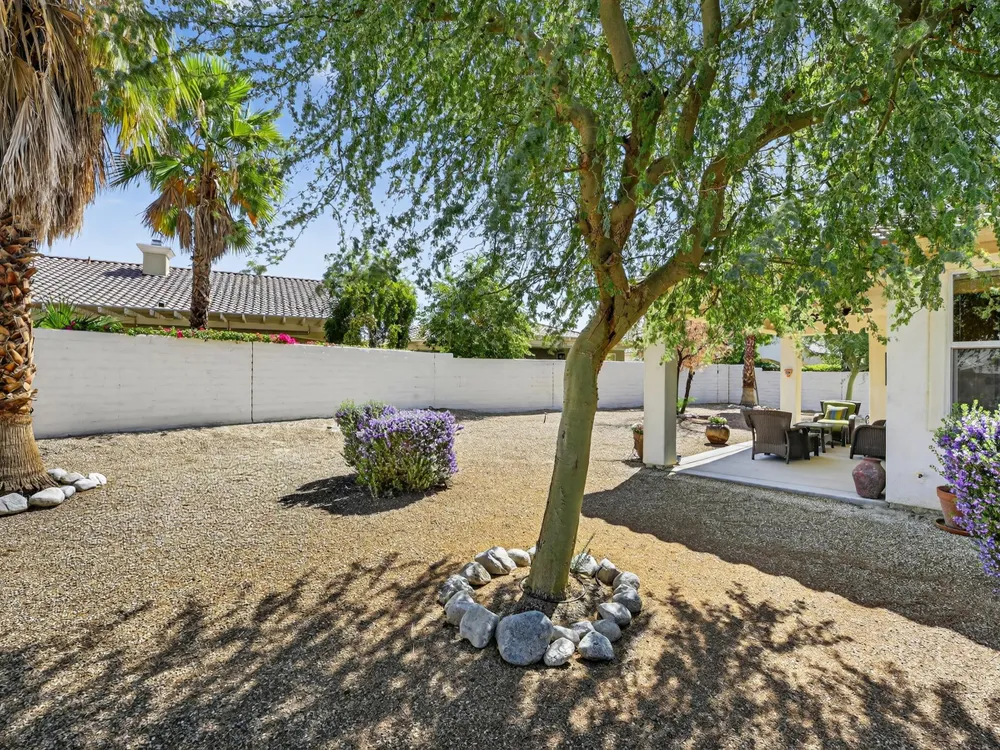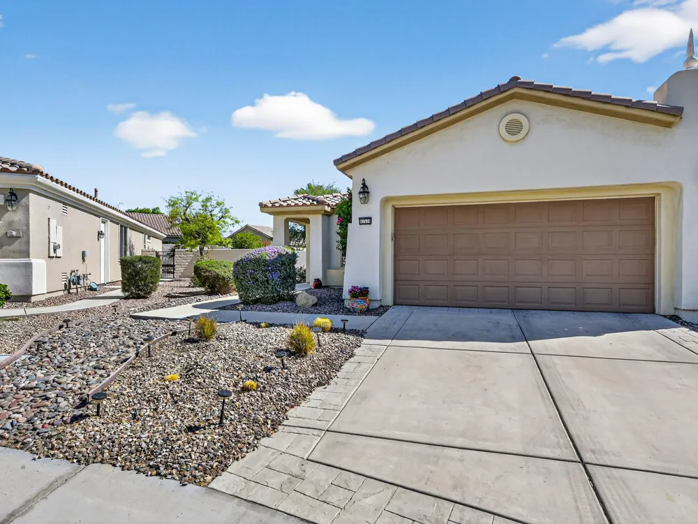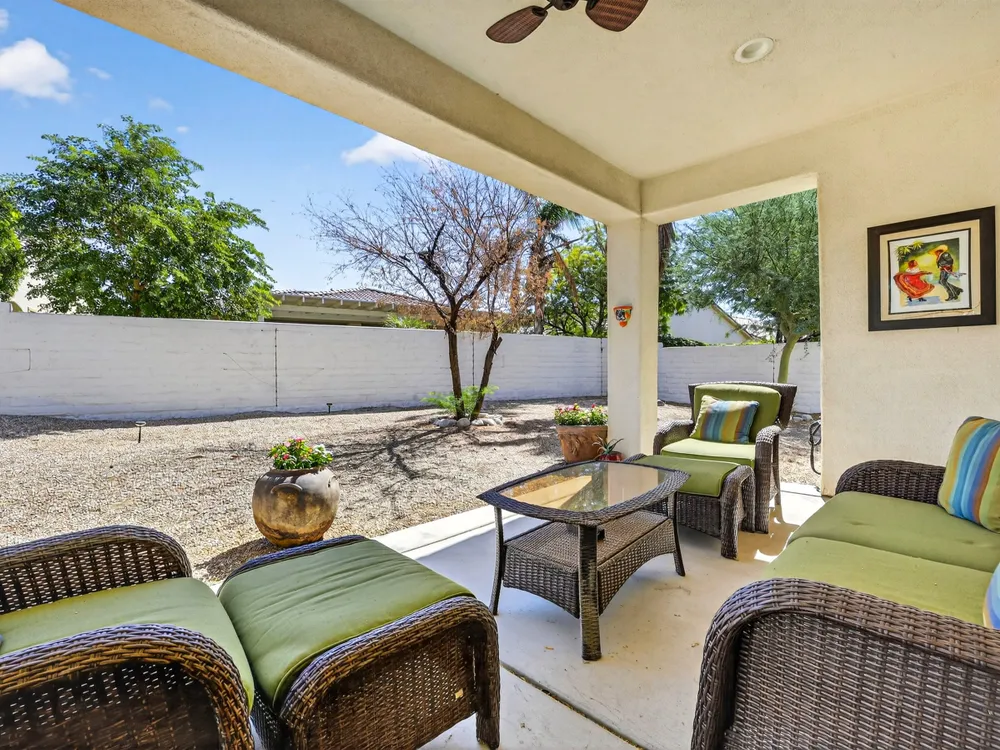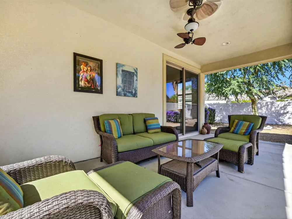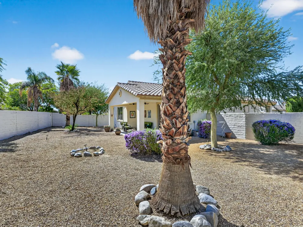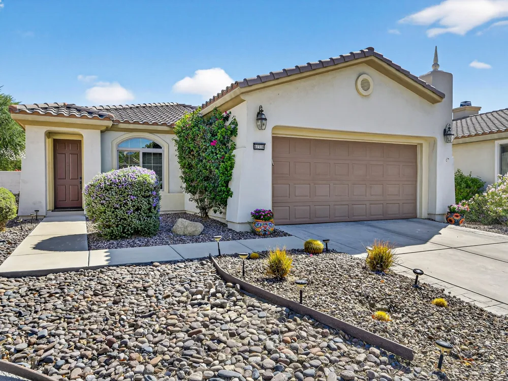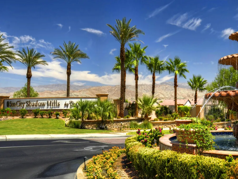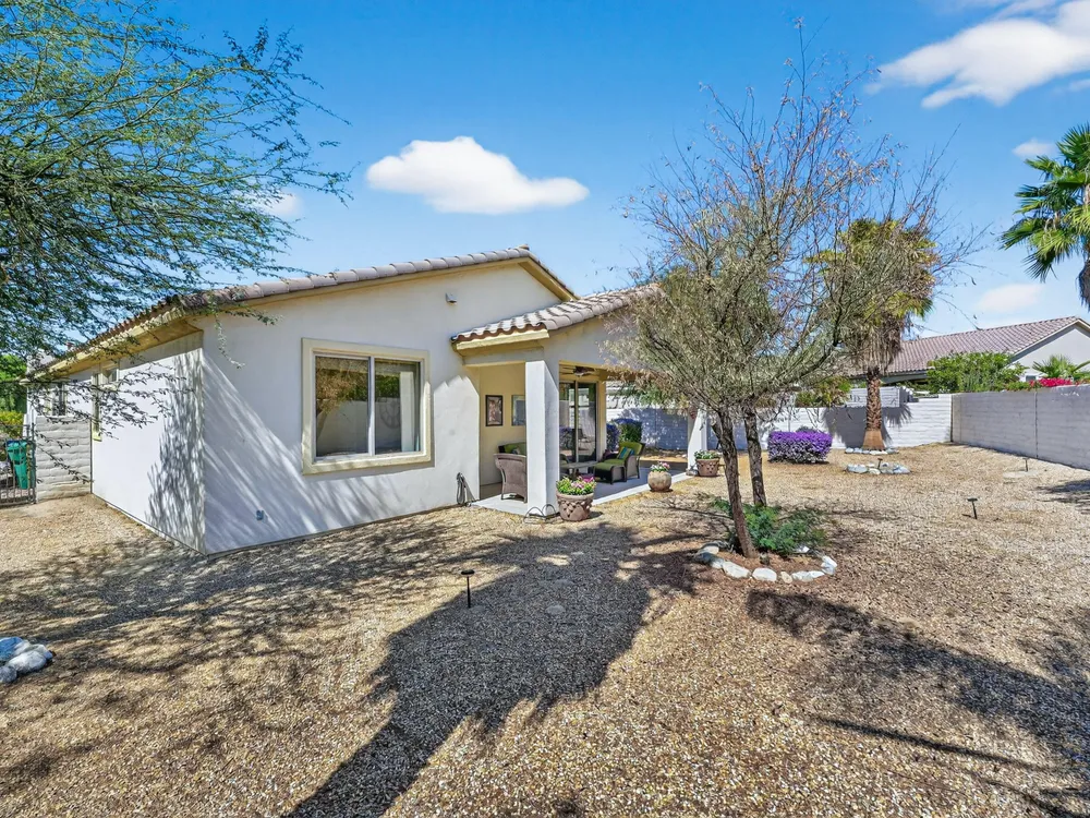Welcome to this charming San Ysidro floor plan offering 1,463 sq. ft. of living space in the active 55+ community of Sun City Shadow Hills. Nestled on a quiet cul-de-sac, this thoughtfully designed home features an open great room with recessed lighting, laminate flooring, and abundant natural light that enhances the inviting atmosphere. The kitchen boasts granite countertops, rich cabinetry, and bar seating at the breakfast counter, flowing seamlessly into the dining area with sliding glass doors that open to the backyard. The spacious primary suite includes a walk-in closet and en suite bath, while the guest bedroom and additional bath provide comfort for visitors. Step outside to enjoy the extended covered patio and low-maintenance landscaping, creating a private outdoor retreat. Just a 60-second walk from the dog park, this home is perfect for pet owners. As a resident of Sun City Shadow Hills, you'll have access to two clubhouses, two championship golf courses, fitness centers, pools, tennis and pickleball courts, and countless clubs and social activities—making every day feel like a vacation.