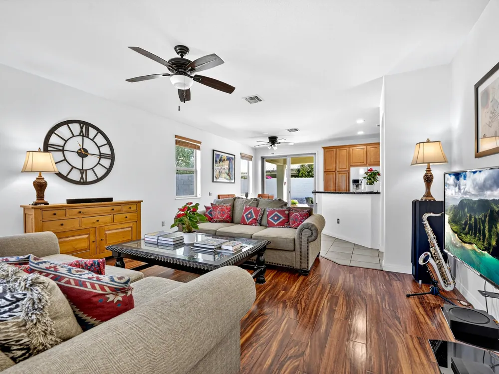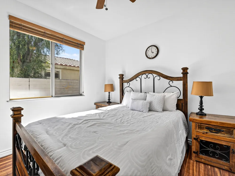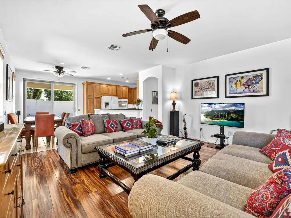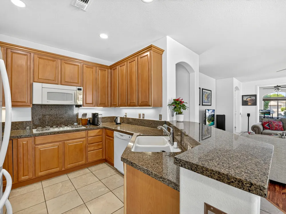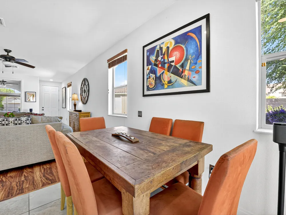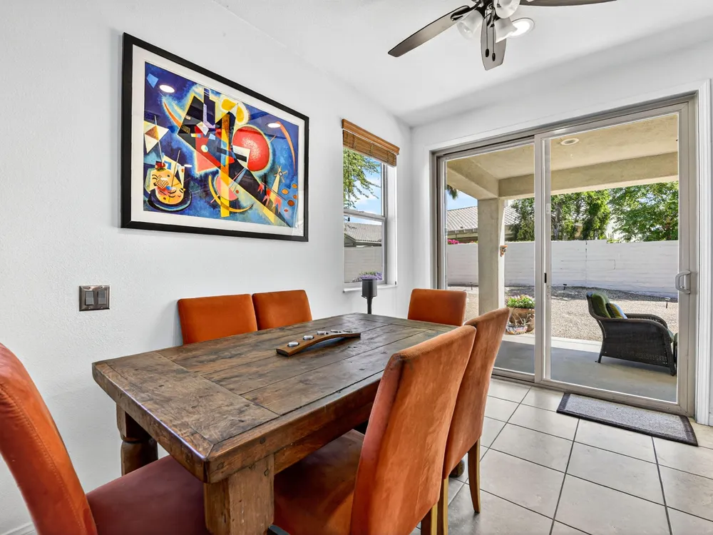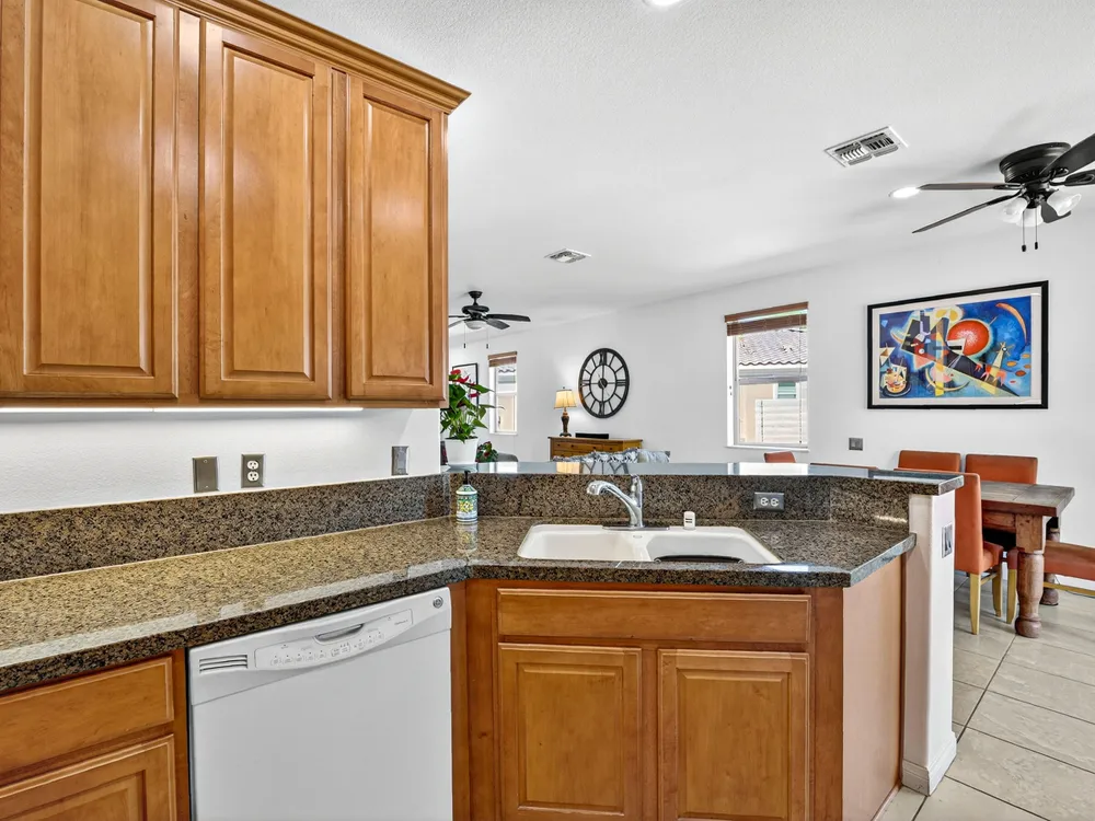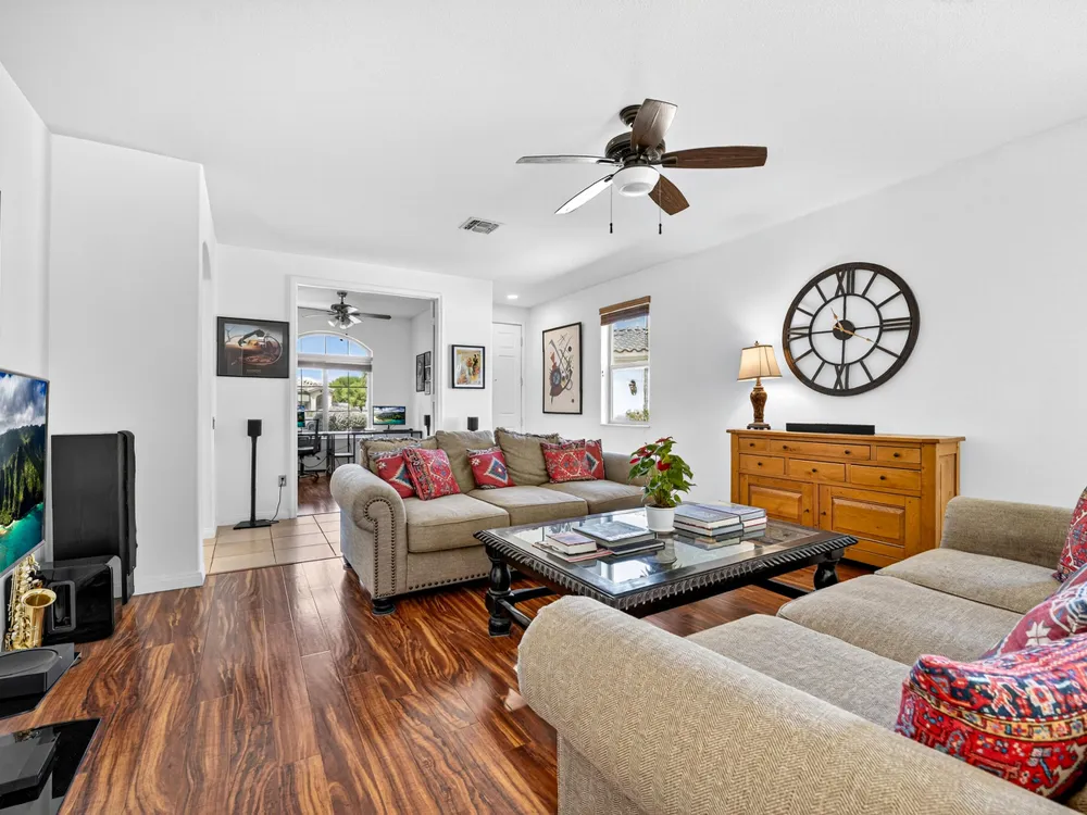 Welcome to this charming San Ysidro floor plan offering 1,463 sq. ft. of living space in the active 55+ community of Sun City Shadow Hills. Nestled on a quiet cul-de-sac, this thoughtfully designed home features an open great room with recessed lighting, laminate flooring, and abundant natural light that enhances the inviting atmosphere. The kitchen boasts granite countertops, rich cabinetry, and bar seating at the breakfast counter, flowing seamlessly into the dining area with sliding glass doors that open to the backyard. The spacious primary suite includes a walk-in closet and en suite bath, while the guest bedroom and additional bath provide comfort for visitors. Step outside to enjoy the extended covered patio and low-maintenance landscaping, creating a private outdoor retreat. Just a 60-second walk from the dog park, this home is perfect for pet owners. As a resident of Sun City Shadow Hills, you'll have access to two clubhouses, two championship golf courses, fitness centers, pools, tennis and pickleball courts, and countless clubs and social activities—making every day feel like a vacation.