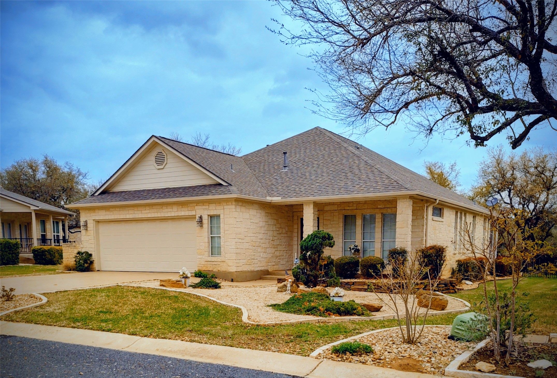 Beautiful, sunny home on beautiful tree-filled lot. Great covered front porch, Large living and eating areas and tons of light! Office is in the front of the home with convenient access to the front door. Office can also be used as a third bedroom. Extensive ceramic tile throughout, Open kitchen & breakfast bar. Large walk-in pantry. Laundry room. Primary bedroom with two walk in closets and seating area. Primary bath includes double vanity, walk-in shower and separate tub. Second bedroom has access to a separate full bath. The open floor plan is inviting for get togethers. Relax on the cozy patio or in the glass enclosed porch and enjoy the private backyard and greenbelt. Texas Traditions is a 55 and older neighbor hood with quiet streets for those who like to walk