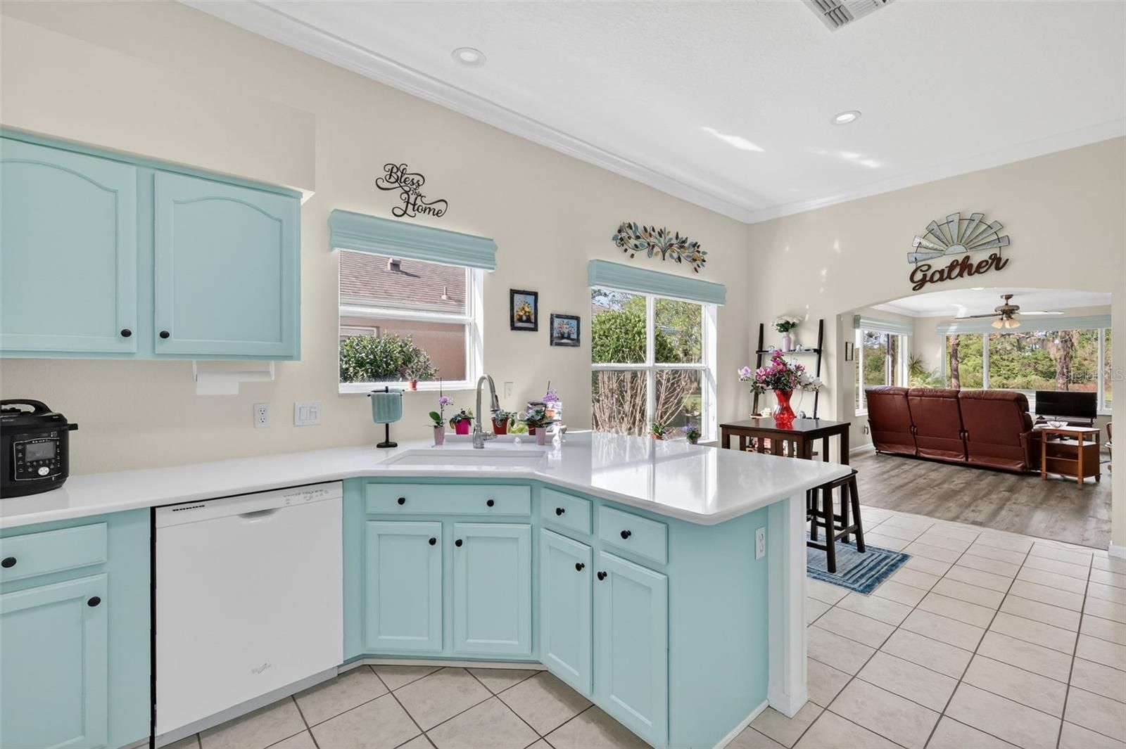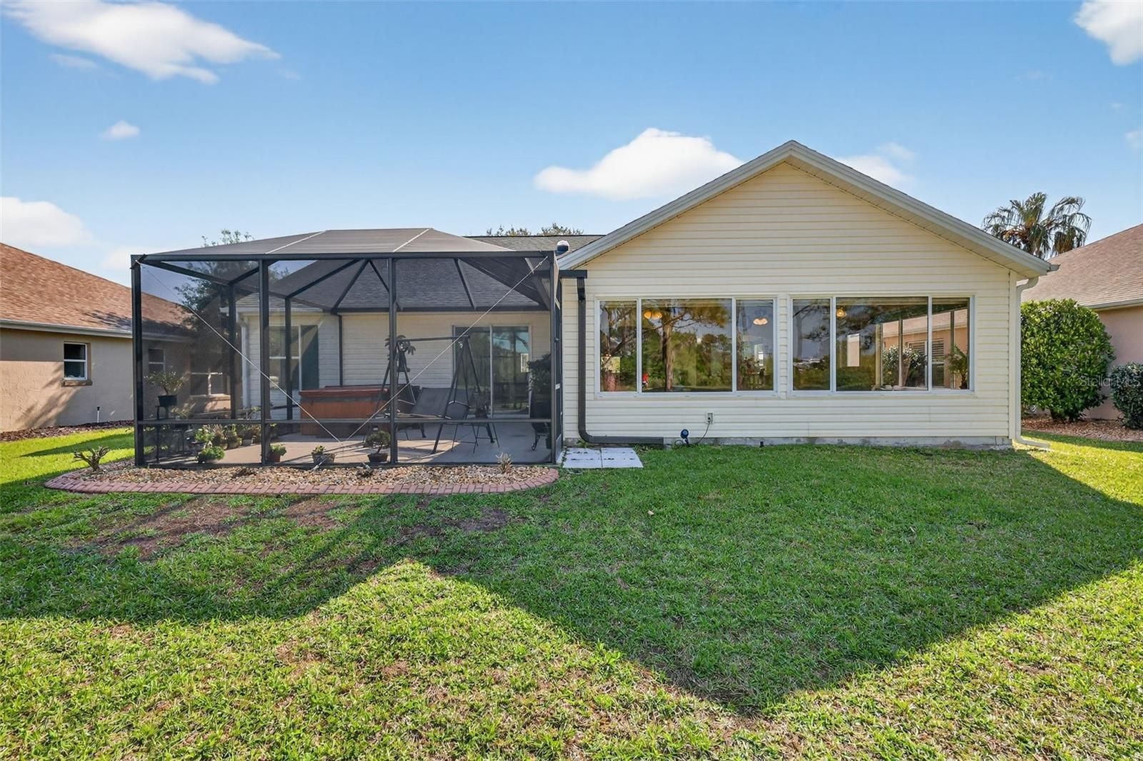 ENJOY SPECTACULAR, PANORAMIC, GOLF FRONT VIEWS overlooking the 13th hole of Tierra Del Sol Championship Golf Course in this DESIGNER La Costa with an EXPANSIVE 22’x21’ FLORIDA ROOM and SPACIOUS BIRDCAGE - Only MINUTES to BOTH Spanish Springs Town Square and Lake Sumter Landing with shopping, dining, and live nightly entertainment! BOND PAID! DECORATIVELY PAINTED drive and walkways, CURBED landscaping with STONED beds, and a quaint SCREENED FRONT PORCH welcome you to this INCREDIBLE home! Step inside through a side lit French door into the SPACIOUS foyer boasting an ENTRY CLOSET and OPULENT columns. Soaring HIGH VAULTED ceilings and LUXURY VINYL PLANK flooring grace the OPEN CONCEPT layout of the living and dining rooms. CUSTOM CROWN MOLDING adorns the ceilings throughout the home, adding a touch of sophistication. An elegant arched doorway off the main living area opens to the EXPANSIVE 22’ x 21’ under-air Florida Room, offering an impressive 345 additional square feet of living space. Designed for both relaxation and entertaining, this REMARKABLE SPACE features LUXURY VINYL PLANK flooring and WALLS OF WINDOWS that flood the room with NATURAL LIGHT while framing BREATHTAKING, PANORAMIC, GOLF COURSE VIEWS! For outdoor enjoyment, sliding glass doors from the living room lead to an EXPANSIVE BIRDCAGE—perfect for savoring Florida’s gorgeous weather and the AMAZING SERENE SETTING! The gourmet kitchen showcases TILE flooring, beautiful aqua cabinetry, sleek QUARTZ countertops, built-in PANTRY with PULLOUTS, EAT-IN COUNTER-HEIGHT breakfast bar, and an adjacent DINETTE area for casual dining. The primary suite offers a VAULTED ceiling, LARGE WALK-IN closet, and corner windows overlooking the golf course! It’s EN-SUITE bathroom boasts beautiful aqua cabinetry, QUARTZ countertops, DUAL sinks, make-up vanity, TILED WALK-IN shower, and TWO LINEN closets. Designed for PRIVACY, the SPLIT FLOOR PLAN places an additional bedroom and a second bath near the front of the home, creating a SEPARATE GUEST WING. Bedroom two boasts a BAY window and a built-in closet. The second bathroom is thoughtfully appointed with a WHITE vanity with QUARTZ top, TILED tub and shower combination, and a hall LINEN closet. Completing the package is a TWO-CAR GARAGE with EPOXIED floors, LAUNDRY area with cabinets and a UTILITY SINK, STORAGE cabinets, attic access stairs, a convenient door to the foyer, and PLENTY of space for parking! DON’T MISS YOUR OPPORTUNITY TO MAKE THIS EXCEPTIONAL HOME YOUR OWN! The Village of Tierra Del Sol offers a FANTASTIC LOCATION-JUST MINUTES to BOTH Spanish Springs Town Square and Lake Sumter Landing with shopping, dining, and live nightly entertainment! Near multiple large Regional Recreation Centers: Tierra Del Sol, Laurel Manor, Savannah Center, and La Hacienda; several Country Clubs and Championship Golf Courses: Tierra Del Sol, Hacienda Hills, Orange Blossom Hills; and multiple pools, golf, and pickle ball! ONLY MINUTES to CR 466 and US 441 with an abundance of shopping, restaurants, banks, medical, and more! PLEASE WATCH OUR WALKTHROUGH VIDEO of this MAGNIFICENT GOLF FRONT HOME in an AMAZING LOCATION and CALL TODAY to schedule your Private Showing or Virtual Tour!