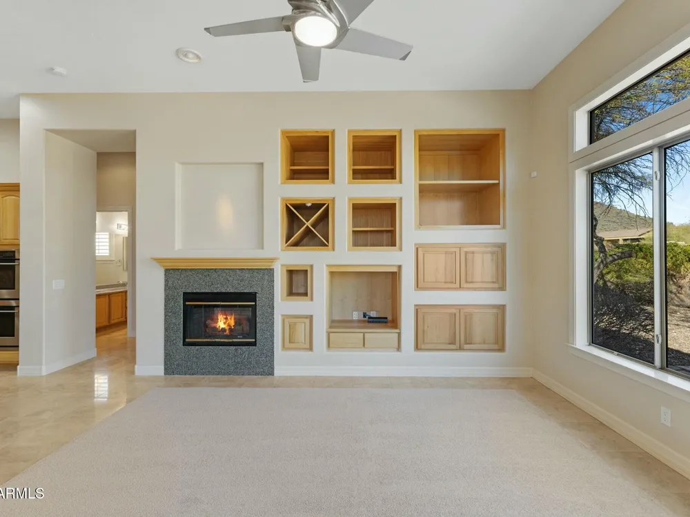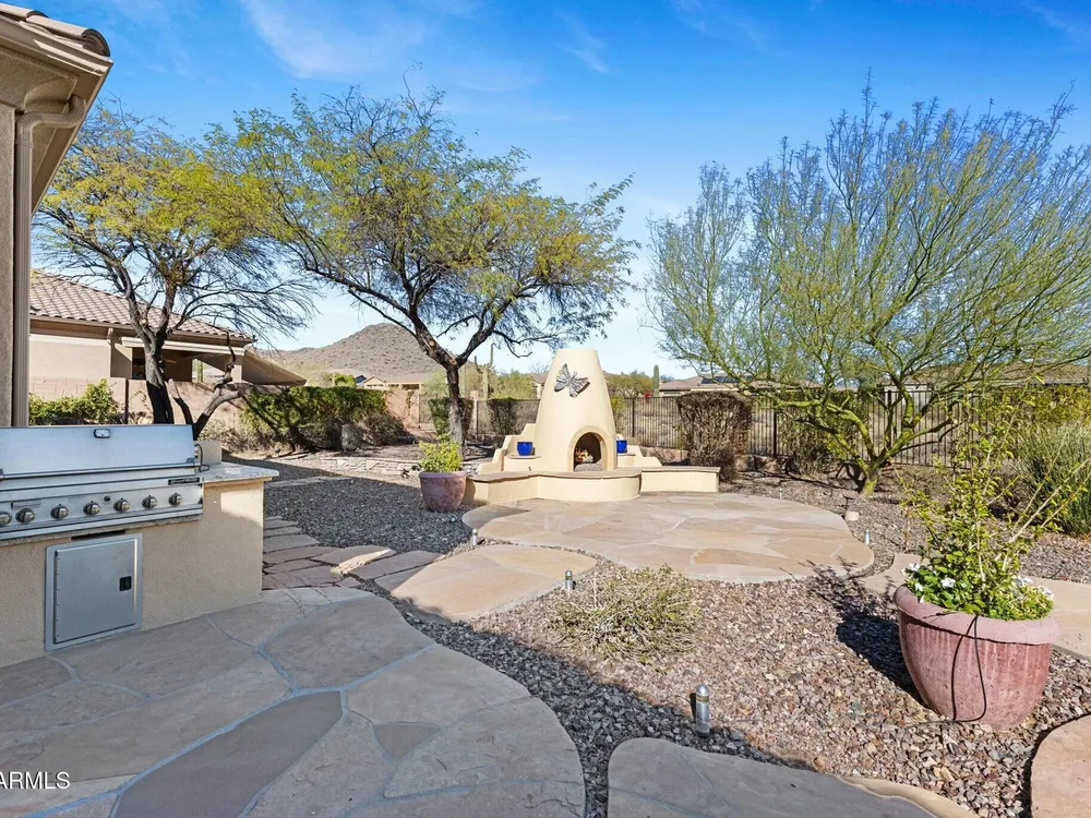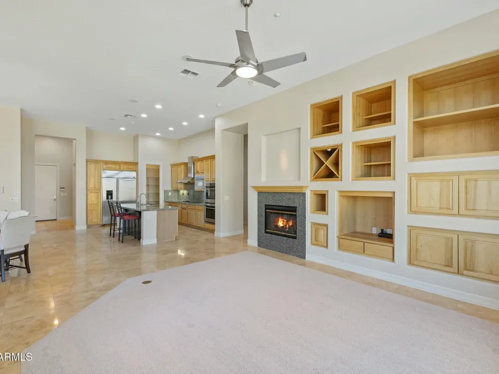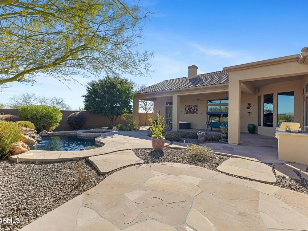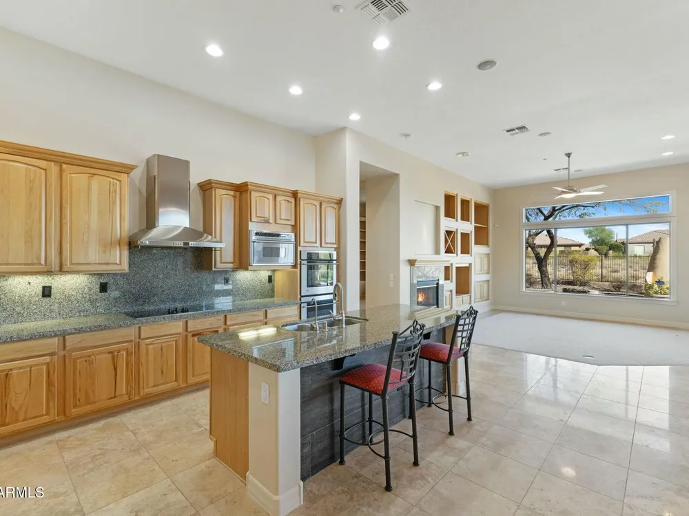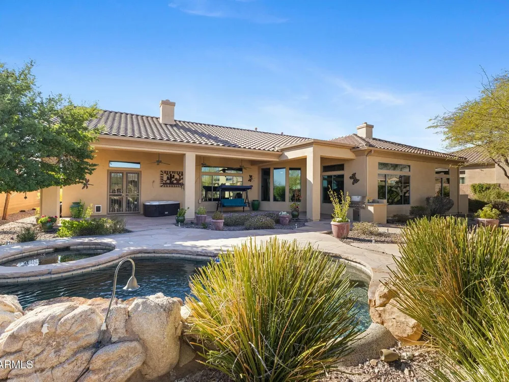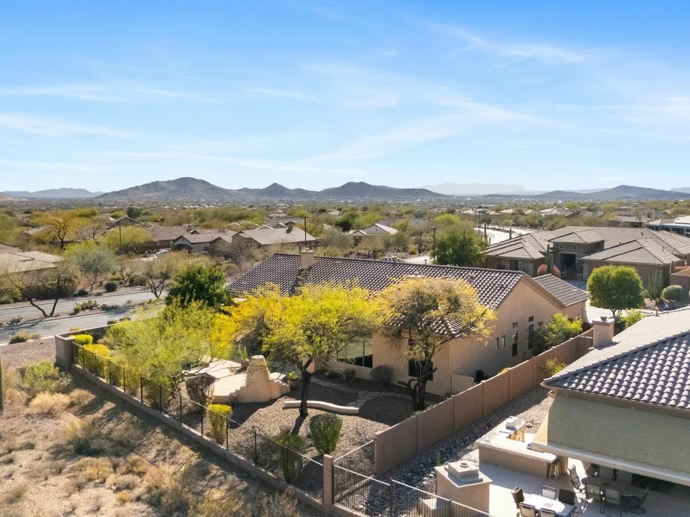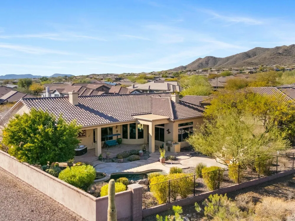 Anthem Country Club~This nicely-appointed 3 bedroom, den, 2.5 bath Brentwood floor plan offers entertaining backyard includes a Shasta heated pool & spa with water feature plus an above-ground spa, built-in BBQ, sitting area & gas fireplace on a desert wash lot! 2025 New Roof! 2022 HVAC with brand new 2025 interior & 2023 exterior paint. Kitchen features stainless appliances including electric cooktop, double wall ovens, granite counters, large island & beautiful raised-panel cabinets. Plantation shutters. Brand new 2025 carpet. French doors from primary bedroom to backyard. Primary suite features gas fireplace, walk-in shower, jetted tub, dual walk-in closets and sinks! Built-in refrigerator, washer & dryer included. Lots of built-ins!