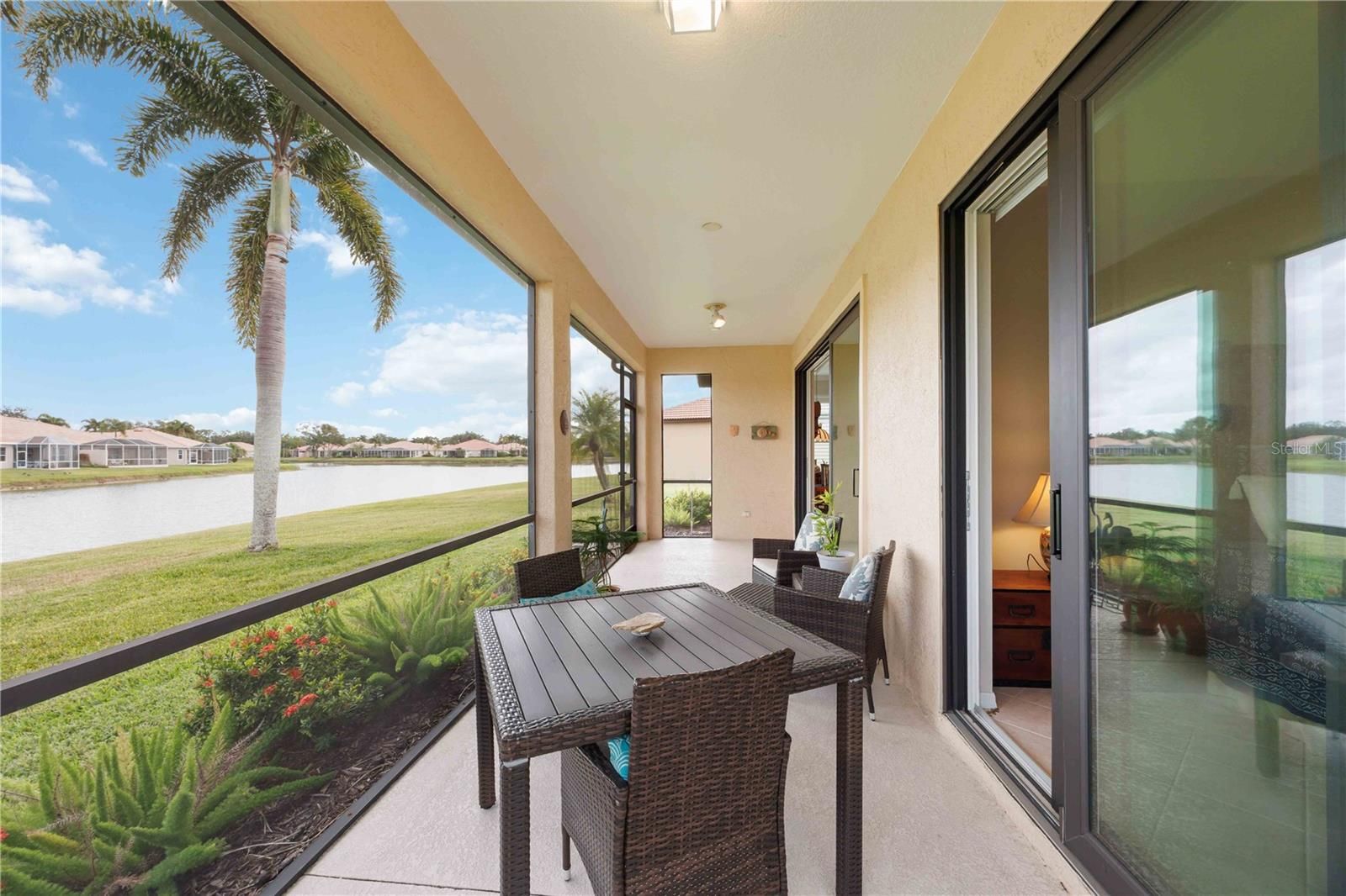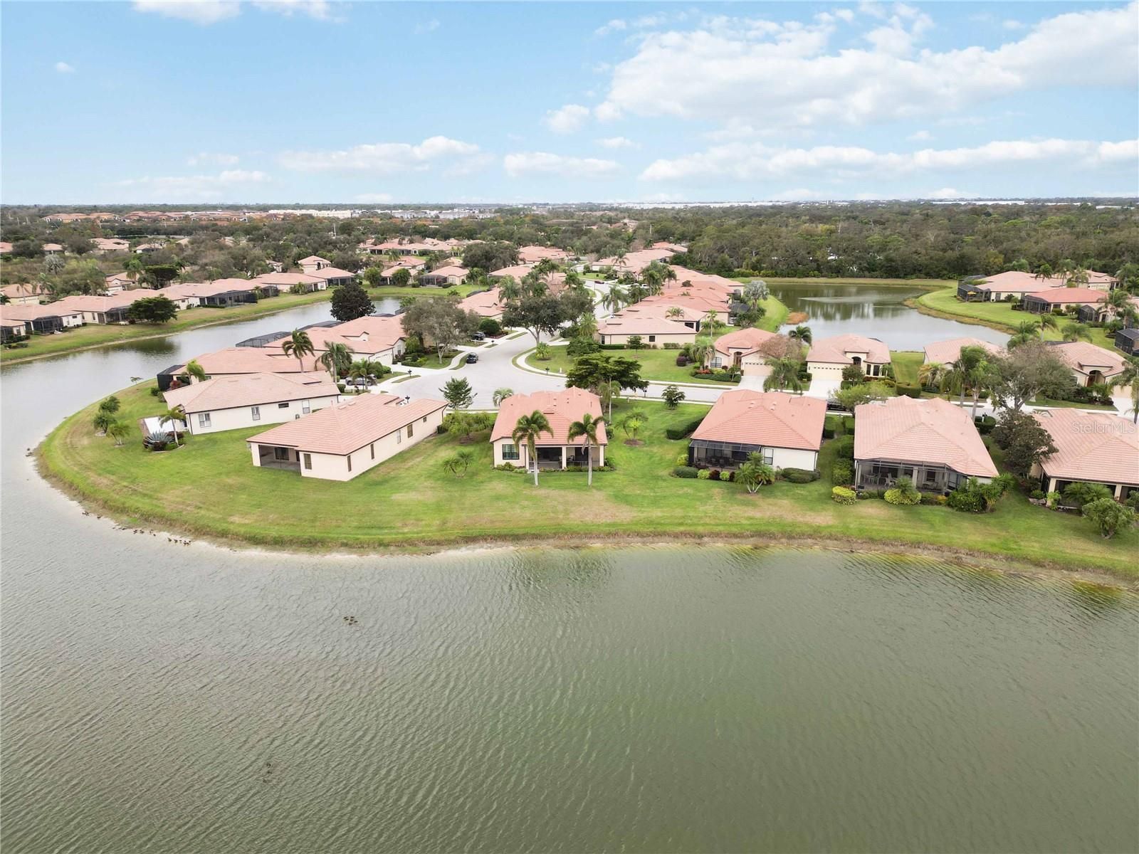 Enjoy the best of Florida living in this 2-bedroom plus den, 2-bath home with a 2-car garage, ideally positioned on a peaceful lake and preserve view in a desirable 24-hour guard-gated 55+ community. Major improvements include a NEW ROOF with transferable warranty and hurricane-impact windows and sliding glass doors, offering storm protection, reduced noise, UV protection, and energy efficiency that helps keep electric bills low. There is no cable charge, with the included TV antenna with cable connections throughout the home that adds convenience. A welcoming screened front entry leads into a light-filled interior featuring, crown molding, updated lighting, and ceiling fans throughout. There is tile flooring laid on the diagonal throughout the home The dining area opens to the living room creating an ideal space for entertaining. The living area has triple sliders giving you stunning views of the lake and preserve. The kitchen is both functional and inviting, offering oak cabinetry with pull-out drawers, Corian countertops, a breakfast bar, and a sunny breakfast nook with ceiling fan. Gas appliances include the stove, water heater, and dryer. The den/office is perfectly designed for flexibility, featuring a Murphy bed and ceiling fan—ideal for guests or a home office. The primary ensuite is a private retreat with two sliding doors to the lanai, ceiling fan, dual closets (walk-in and standard), and a spacious en-suite bath with dual sinks, soaking tub, Roman shower and water closet. The guest bedroom offers a standard closet plus a deep walk-in closet, and ensuite access to the guest bath. The guest bath, also accessible from the hall, offers a walk-in shower and single sink with vanity space. Step out to the extended screened lanai and relax while enjoying tranquil lake and preserve views, accented by foxtail and pygmy palms—a perfect setting for morning coffee or evening sunsets. No direct sunlight, so you can enjoy it all day long. Additional highlights include indoor laundry with sink (washer and dryer included), central vacuum system, automatic garage door opener, and recently replaced garage door springs. Lakeridge Falls is a 55+ guard gated community. It offers an updated clubhouse with grand salon for a full array of activities, state-of-art fitness center, card room, billiards room, resort style heated pool and spa, bocce ball courts and its own private sandy beach. Walking trails and beautiful lakes are another of its many attractive features. The community is located conveniently close to shopping at the UTC Mall, restaurants, world awarded beaches and the Sarasota airport. Come see for yourself why this home is your perfect place to relax, entertain, and enjoy the Florida lifestyle—schedule your showing today.