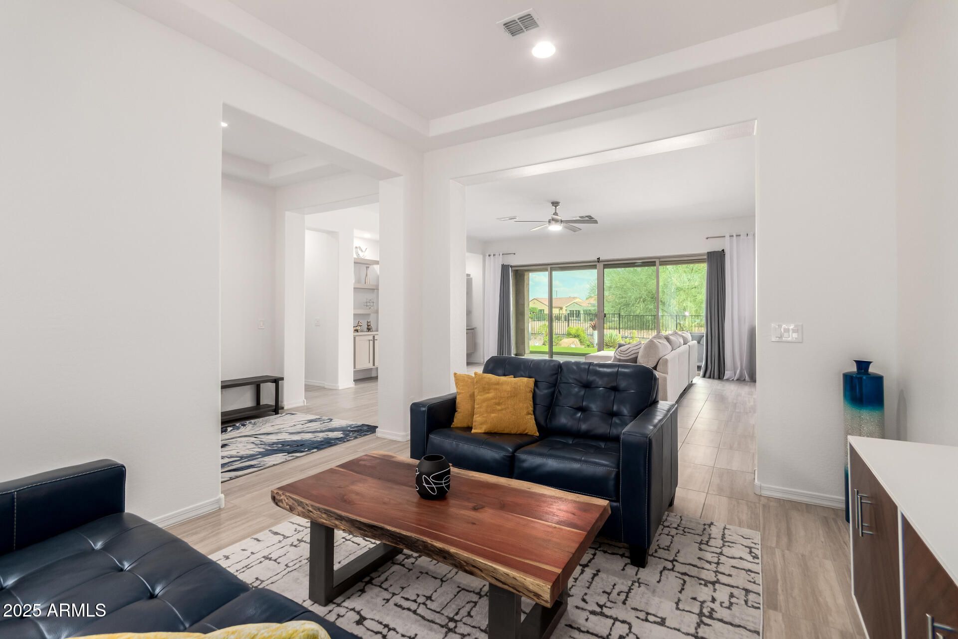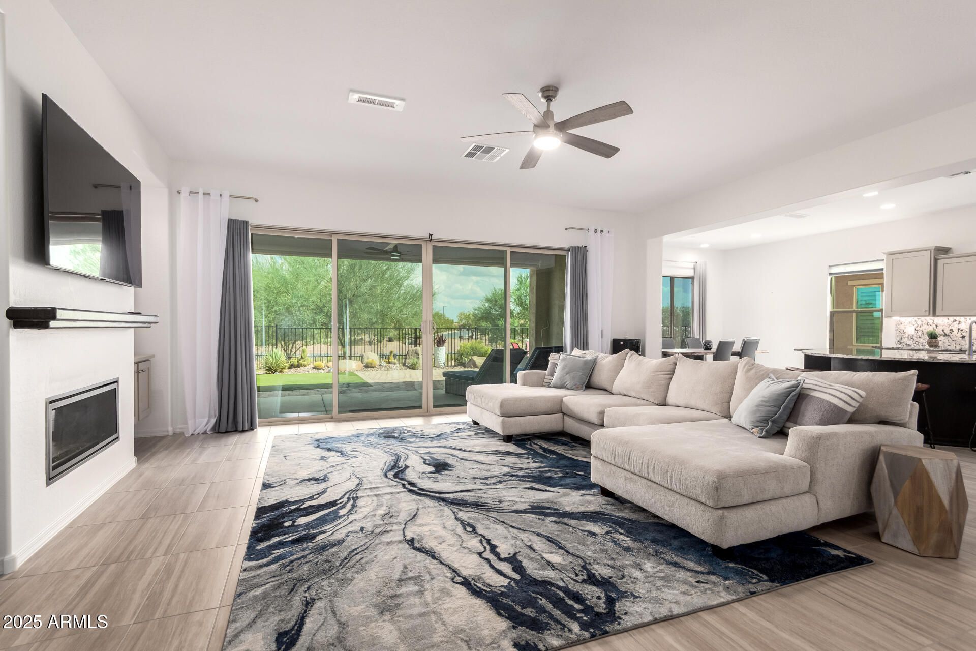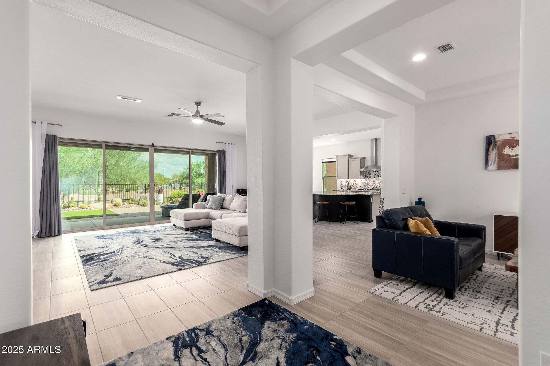 AMAZING RESORT LIVING w/ OPEN WASH VIEWS! Enter this beautifully upgraded JOURNEY thru the charming paver courtyard w/ ornate doors into this smartly designed home w/ open floor plan & AMAZING kitchen! The Great Room w/ cozy fireplace, built ins & center sliding door leads to extended paver patio...fully fenced w/ turf, lush landscaping & SERENE views of the WASH to enjoy w/ family & friends! Kitchen accents w/Granite counters/backsplash, staggered shaker cabinets, gas cooktop--SS appliances, Butler's Pantry & walk in pantry. The Primary Suite features luxurious tiled walk in shower w/ granite dbl vanities & walk in closet. Guest quarters provide privacy for all to enjoy! TWO CAR + CART GARAGE, epoxied floors & service door. *BONUS*FULLY FURNISHED! Ready for quick move-in before winter!! Sun City Anthem at Merrill Ranch offers a 48,000 SF recreation center w/ craft rooms for quilting, pottery, glass works, jewelry & crafts, spacious ballroom w/ stage for dancing, theatrical productions, concerts & more. PLUS full gym, work out rooms, indoor lap pool & spa, walking track, cafe area, card rooms, poker tables, pool table, ping pong table, business center, class room for interesting seminars! Troon Poston Butte Golf Course is one of the nicest in the area. Sun City offers Pickleball, Tennis, Bocce Ball, Horseshoes, Shuffleboard, clubs for all activities.......LIVE WHERE THE SURROUNDINGS DELIGHT, INSPIRE & CHALLENGE YOU!