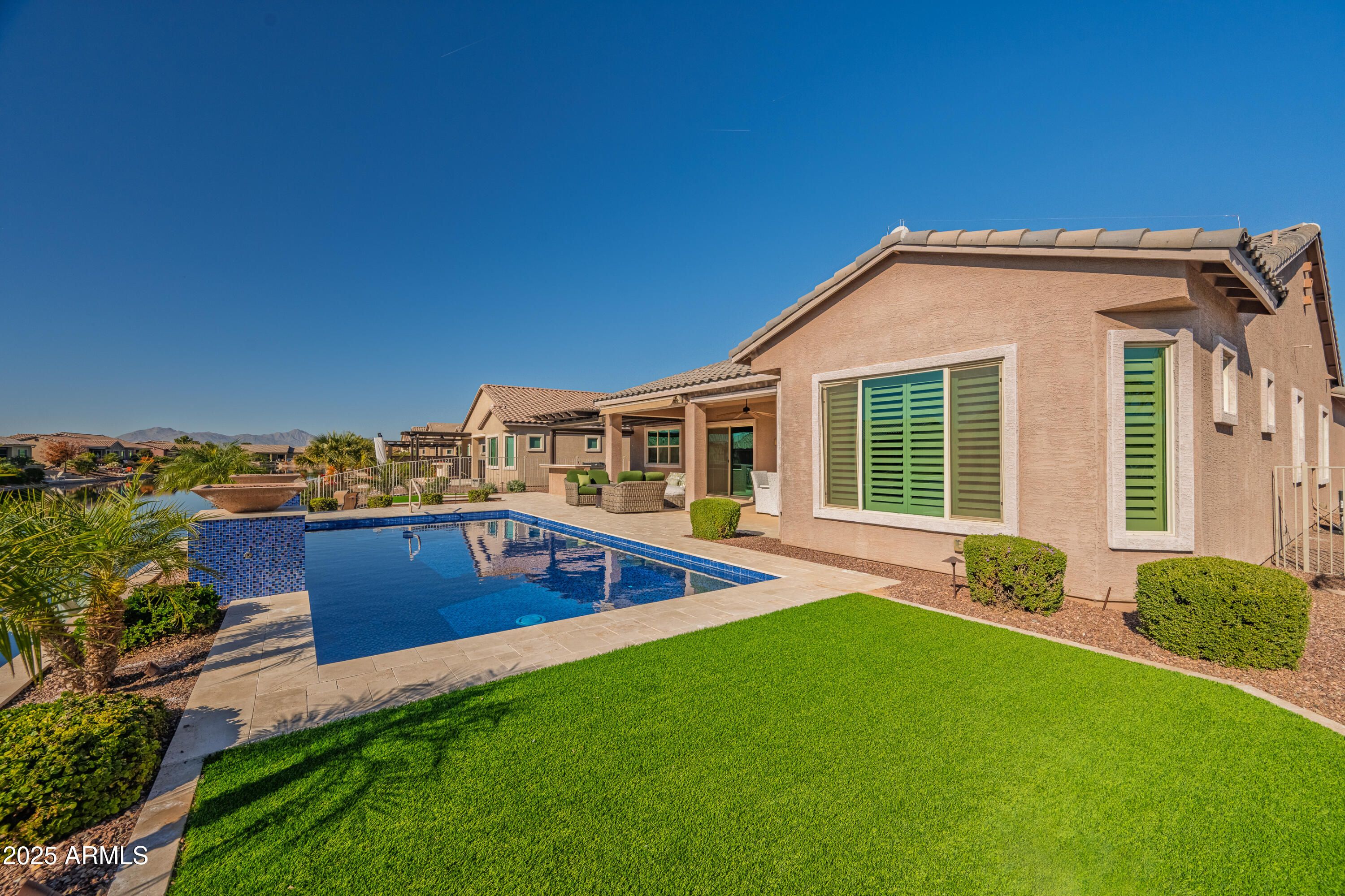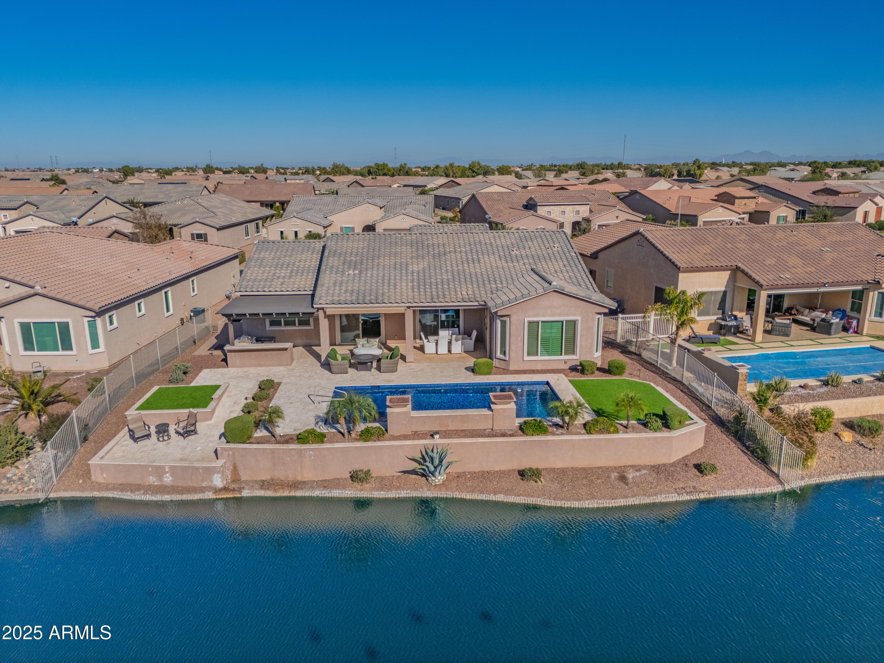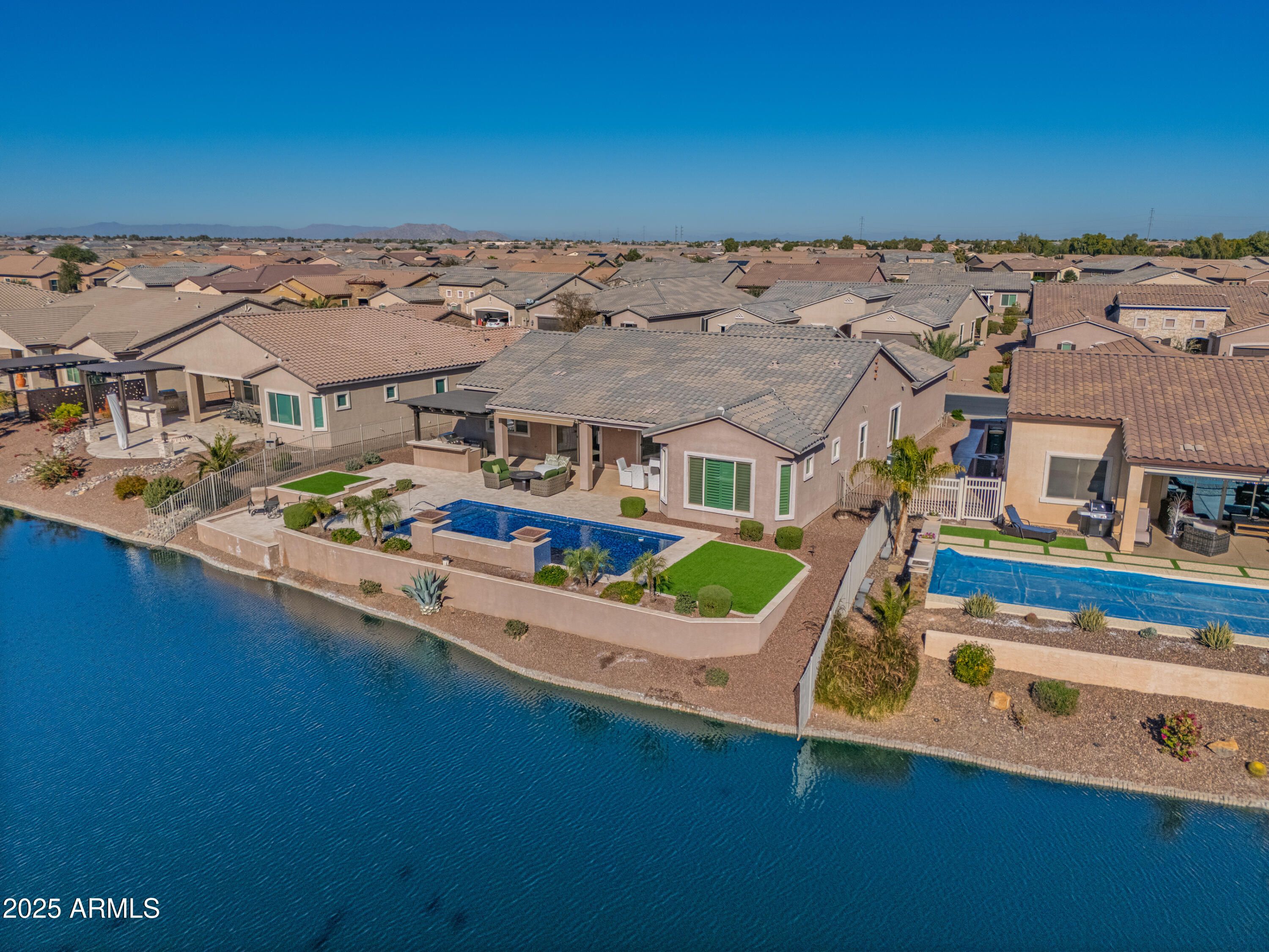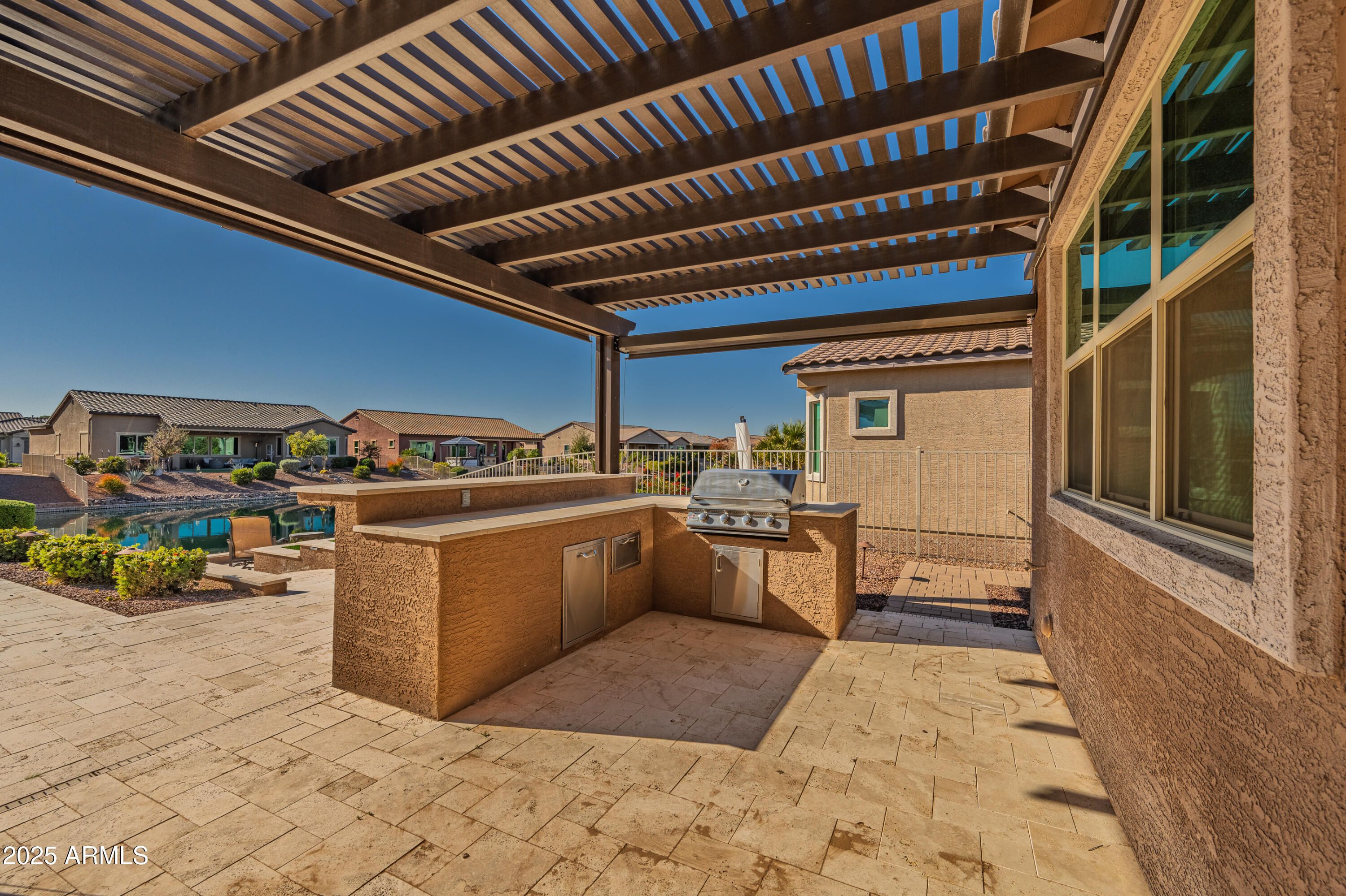 Highly upgraded waterfront home in award-winning Province! Step into the backyard oasis w/travertine, built-in BBQ, pergola, pool w/waterfall & fire bowls, & fenced yard to the water w/turf. Chef's kitchen w/granite countertops, undermount kitchen sink, built-in table, SS appliances, double ovens, walk-in pantry, upgraded cabinets, soft-close drawers, pull-out shelves, tile backsplash & remote shade. Owner's suite w/French door to patio, bay window & large ensuite w/large walk in CA Closet. XL insulated 3-car garage w/epoxy, mini-split, water softener, storage & custom cabinetry. Casita w/full bath, walk in closet & coffee niche. Enjoy resort style living in this community with lakes, walking paths, pickleball, pools, spa, library & clubhouse. Everything available for sale w/separate BOS