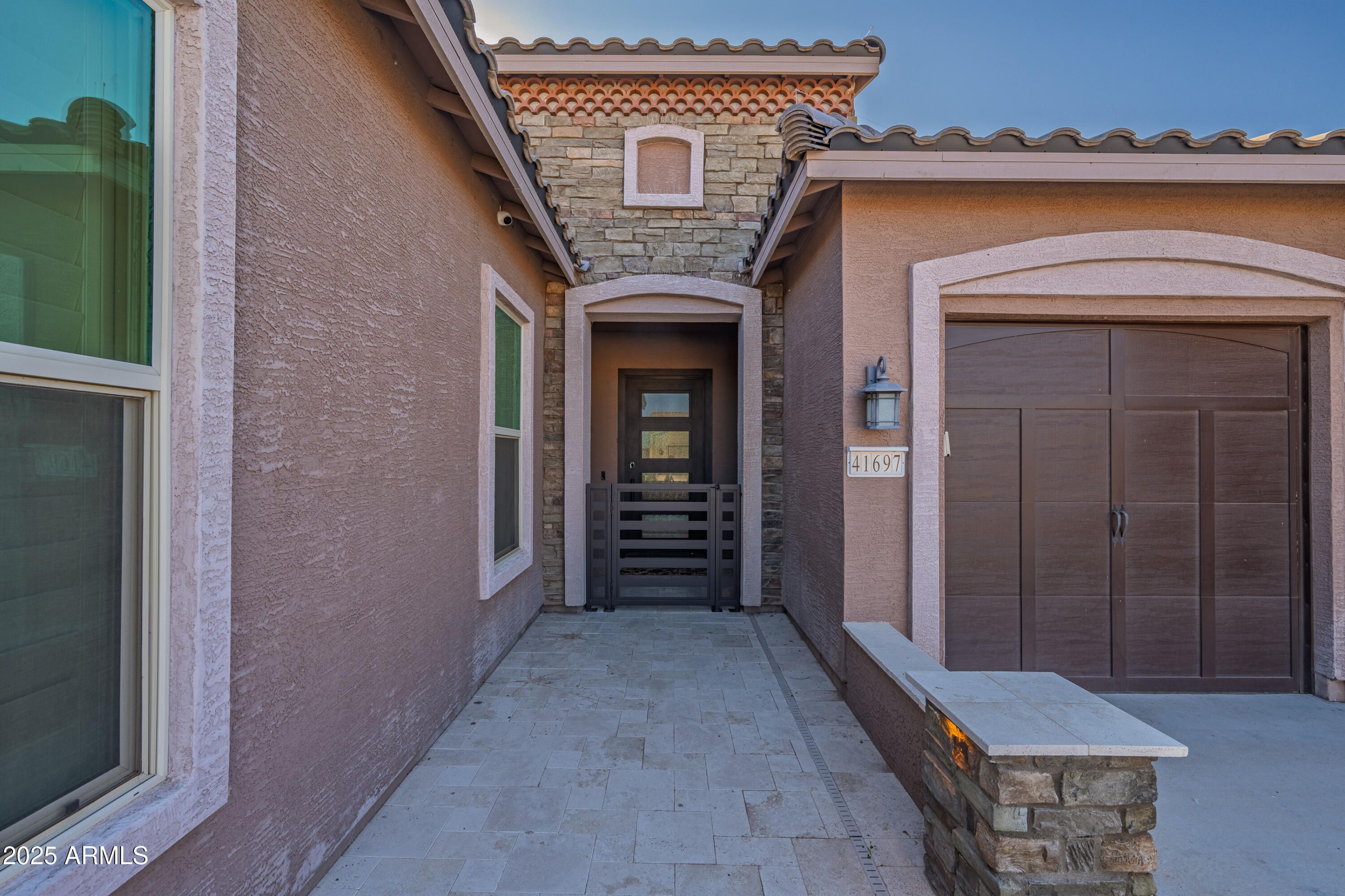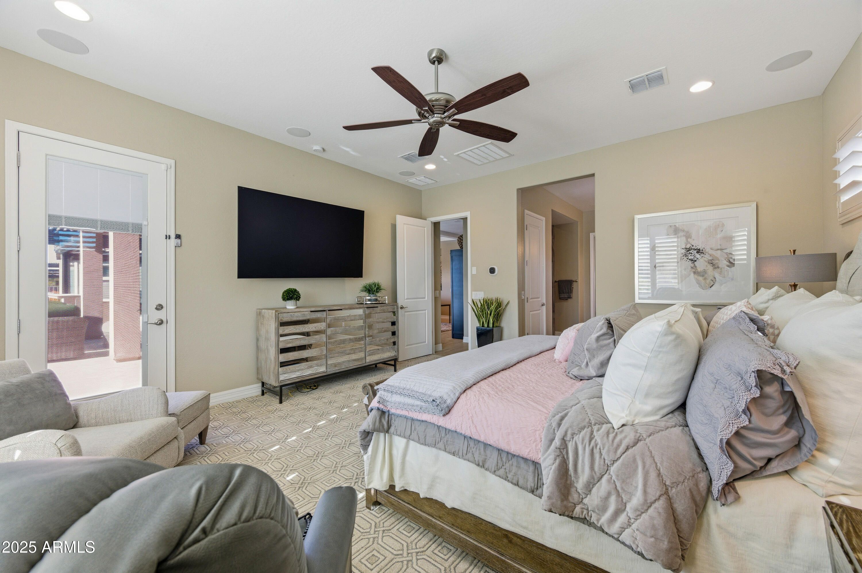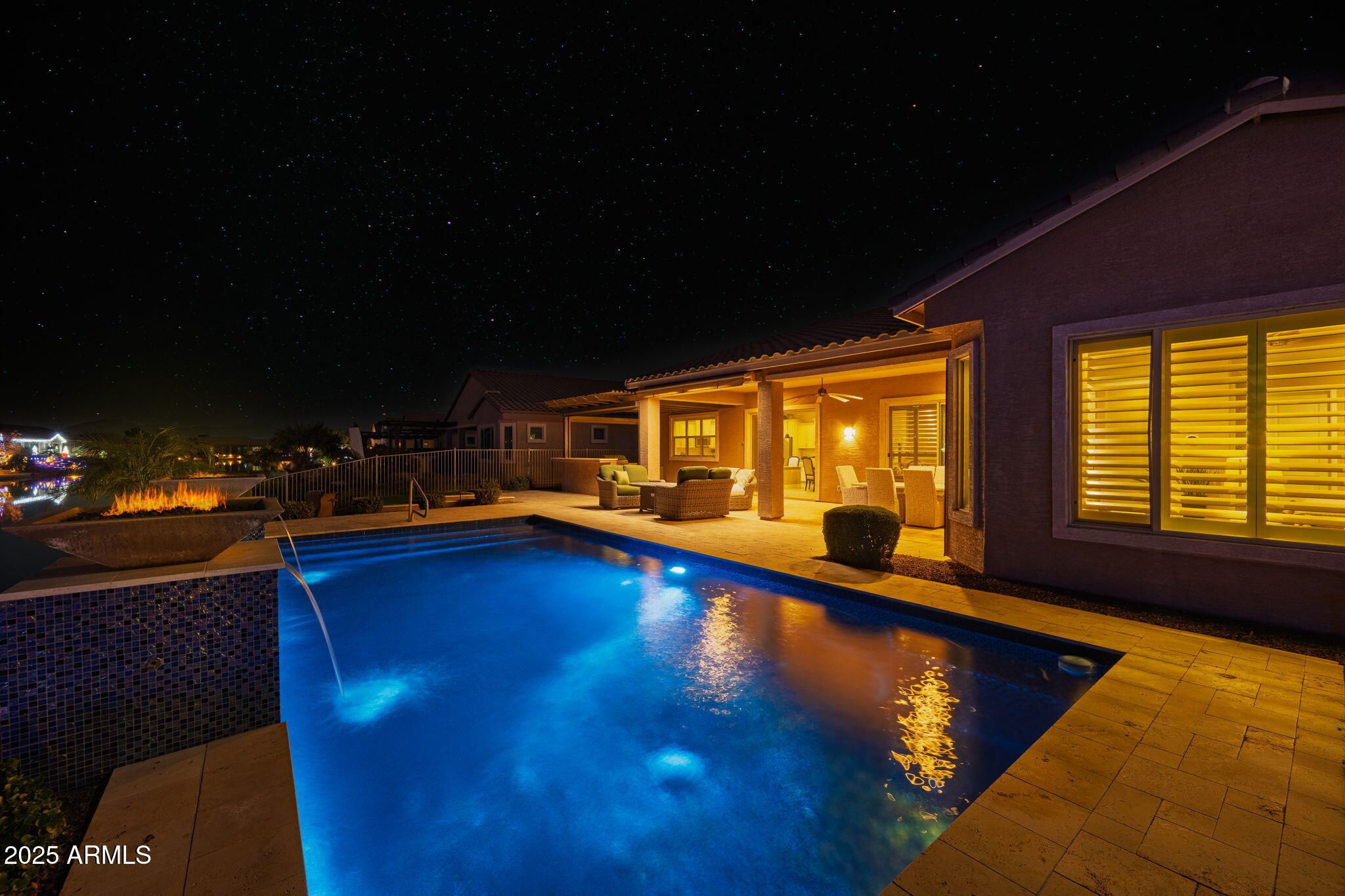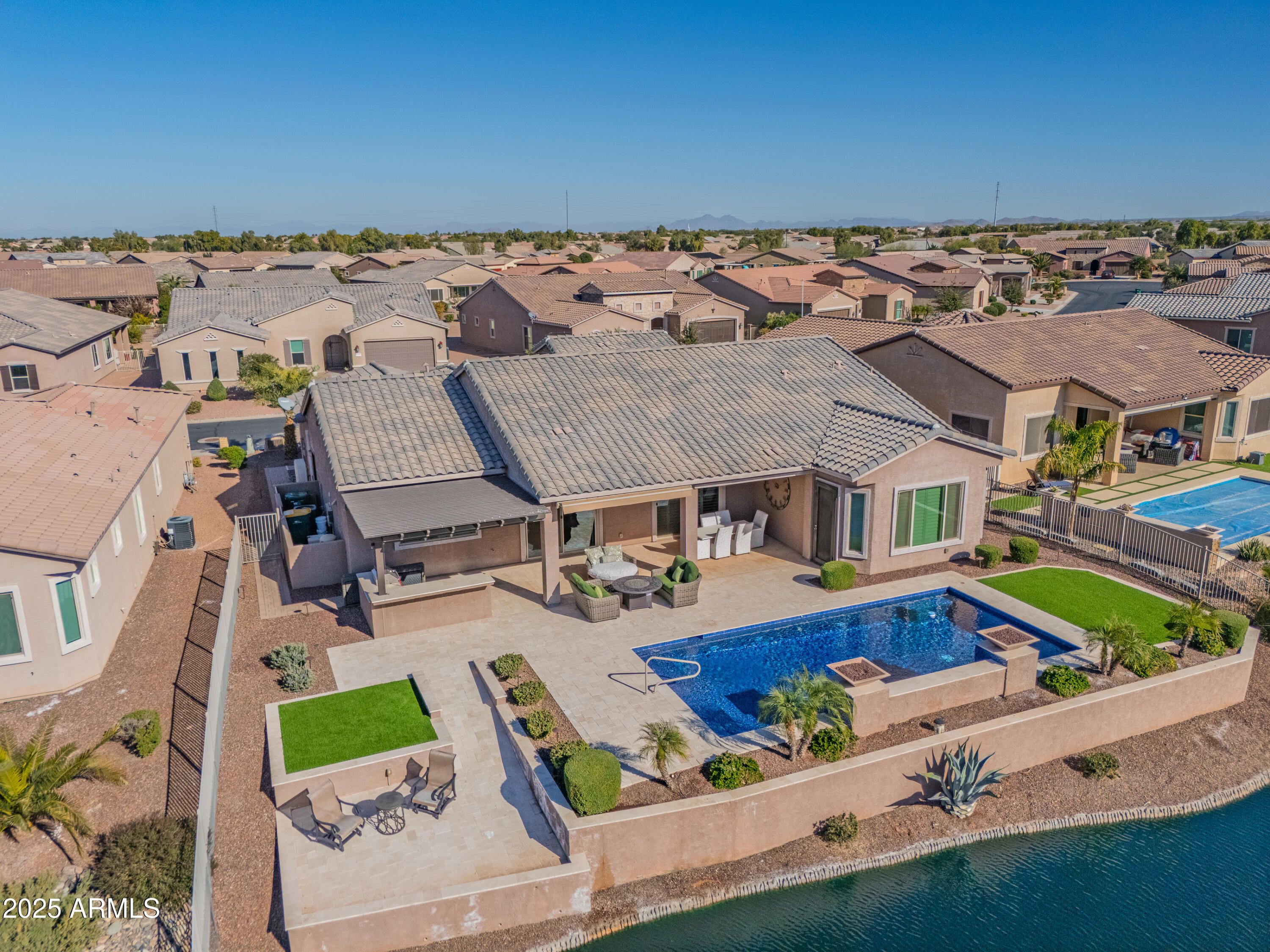 Highly upgraded waterfront home in award-winning Province! Step into the backyard oasis w/travertine, built-in BBQ, pergola, pool w/waterfall & fire bowls, & fenced yard to the water w/turf. Chef's kitchen w/granite countertops, undermount kitchen sink, built-in table, SS appliances, double ovens, walk-in pantry, upgraded cabinets, soft-close drawers, pull-out shelves, tile backsplash & remote shade. Owner's suite w/French door to patio, bay window & large ensuite w/large walk in CA Closet. XL insulated 3-car garage w/epoxy, mini-split, water softener, storage & custom cabinetry. Casita w/full bath, walk in closet & coffee niche. Enjoy resort style living in this community with lakes, walking paths, pickleball, pools, spa, library & clubhouse. Everything available for sale w/separate BOS
