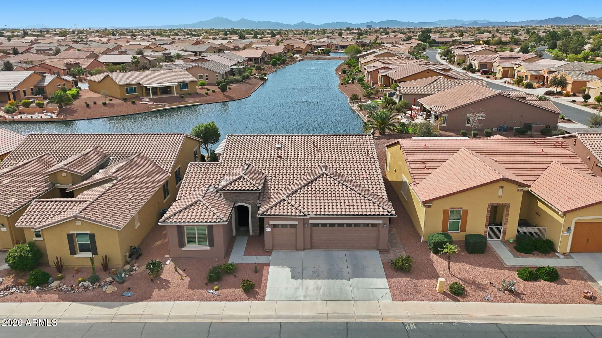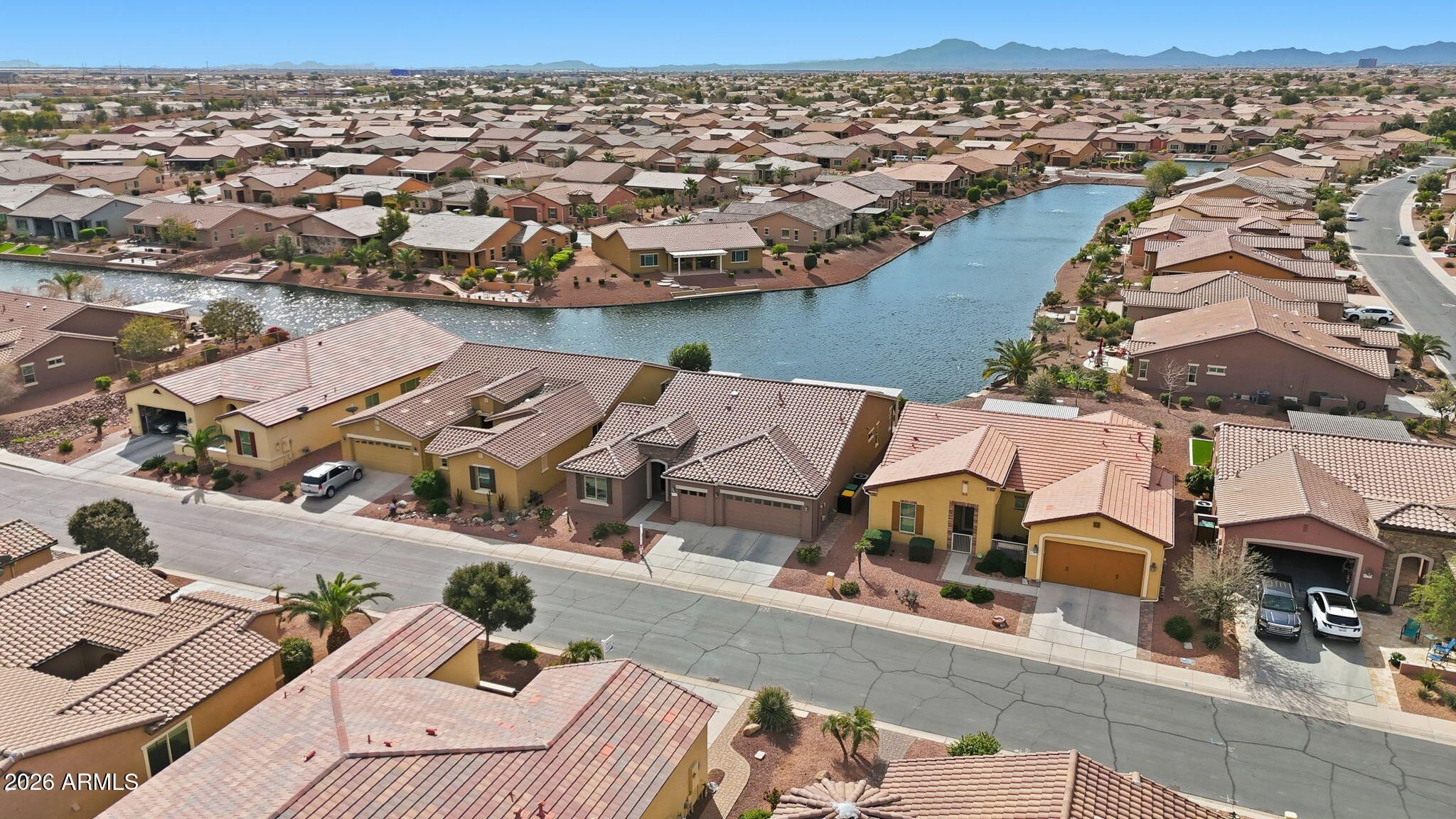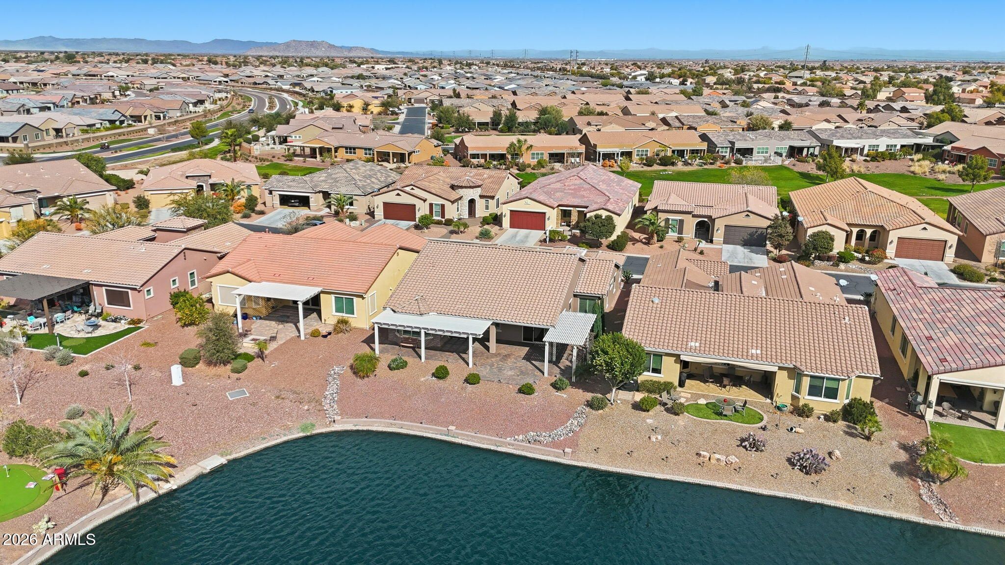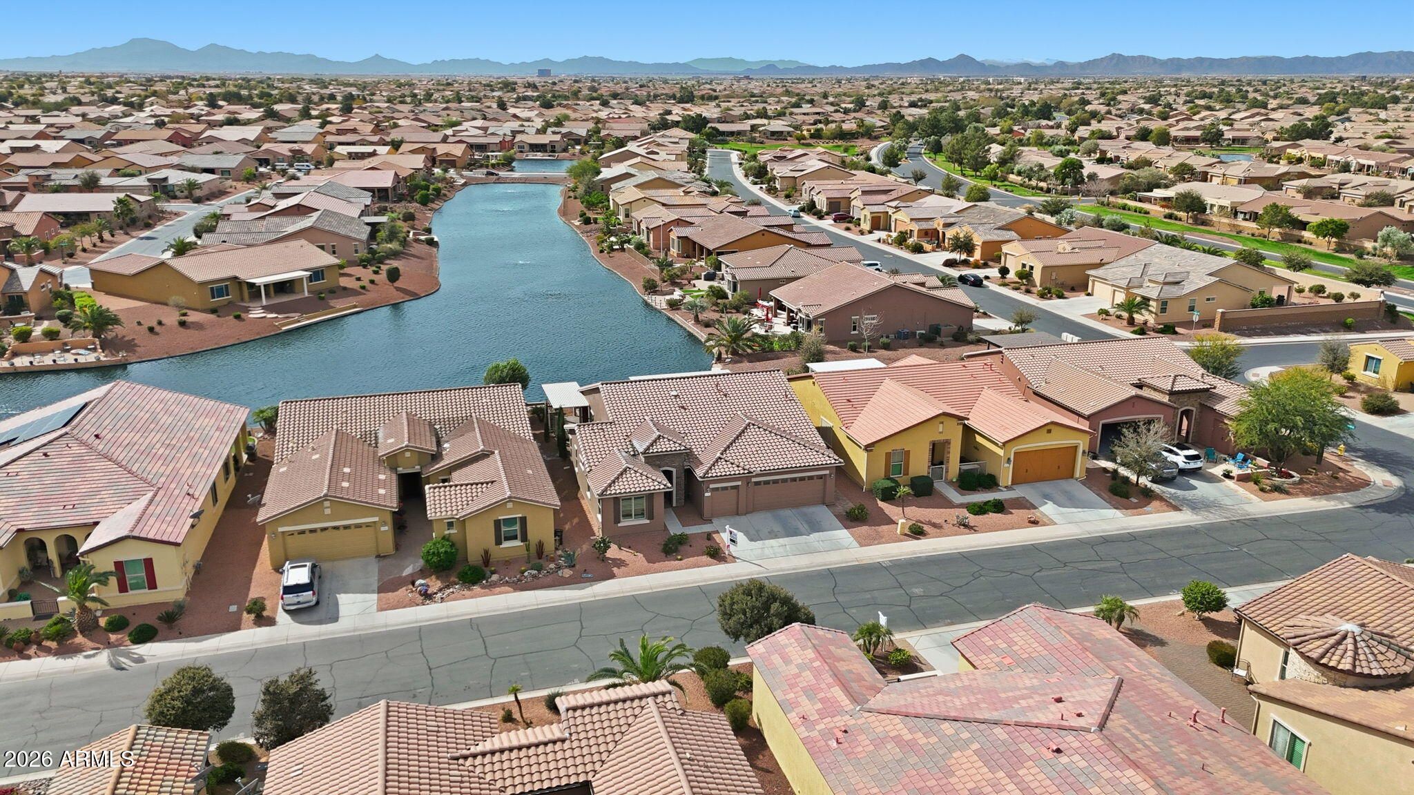 Welcome to resort-style living in this beautiful waterfront home located the Award Winning 55+ resort of Province. Beautiful curb appeal and a welcoming entry set the stage for something truly special. The moment you step inside, your eyes are instantly drawn straight through the home to a breathtaking water view—an unforgettable first impression that creates a sense of peace and luxury from the very start. This 2-bedroom + den residence offers an open-concept layout designed for comfort, flexibility, and effortless entertaining. The living spaces flow seamlessly into the heart of the home—an inviting kitchen perfectly connected to the dining and living areas, making gatherings feel natural and easy. The kitchen includes 42' staggered cabinets w/crown molding, pull-out drawers, beautiful granite countertops w/tile backsplash and SS appliances including a gas range. Shutters throughout. The primary bathroom has separate dual vanities giving each their own space. The 2nd bedroom is very spacious as well. The den provides ideal versatility for a home office or guest space. There is a 4 ft. extended 2 car garage with epoxy floors and also a golf cart garage. The true showstopper is the backyard. Step outside and take in expansive lake views in a serene waterfront setting, enhanced by an extended paved patio and two pergolas areas perfect for morning coffee, sunset dinners, or entertaining family and friends. With the shimmering water as your daily backdrop, this home offers the kind of lifestyle most people dream about. A rare waterfront opportunity combining curb appeal, comfort, and unforgettable views. This is Arizona 55+ living at its finest. Come home to Province!