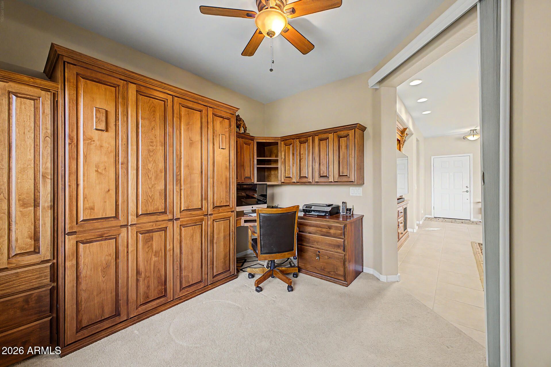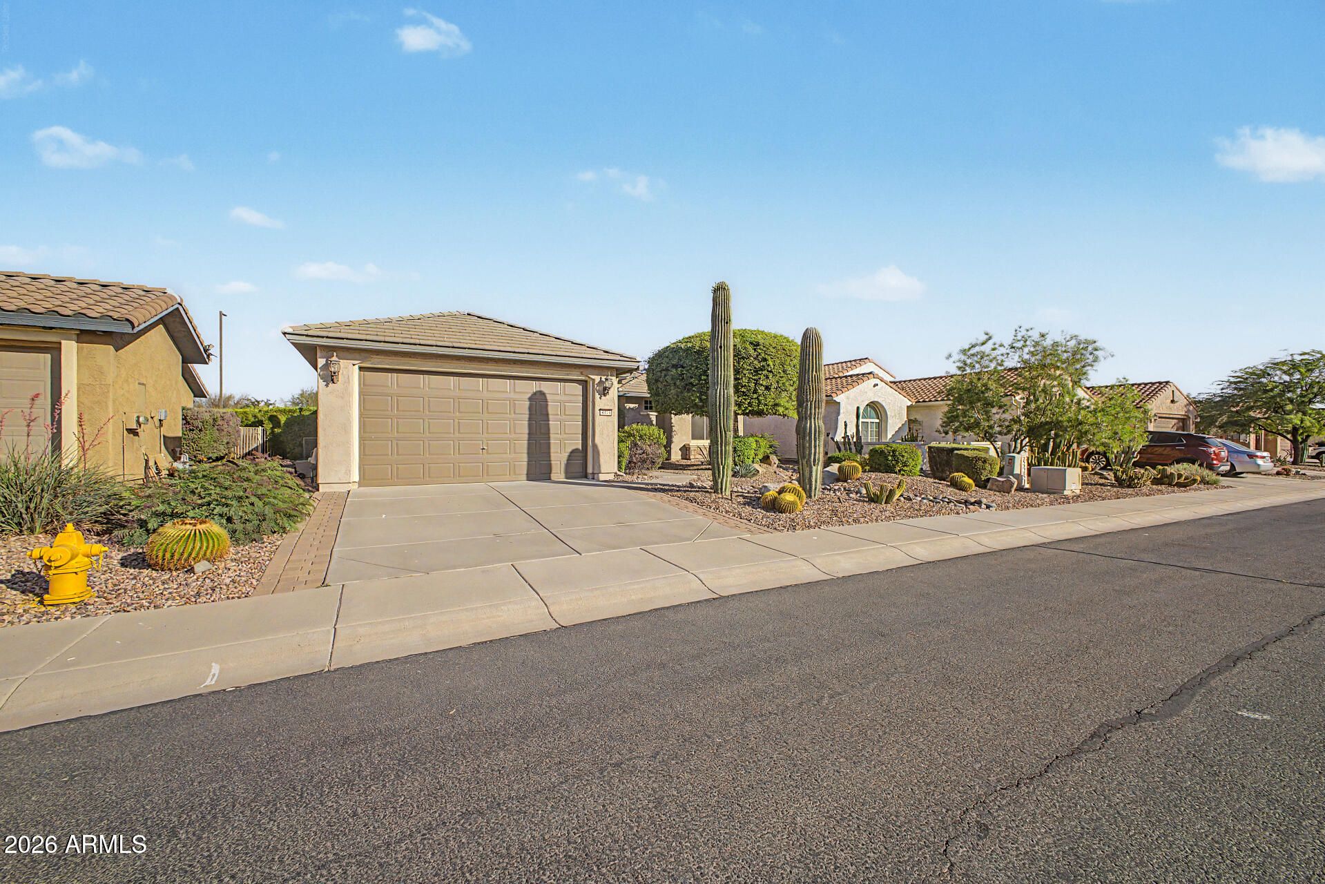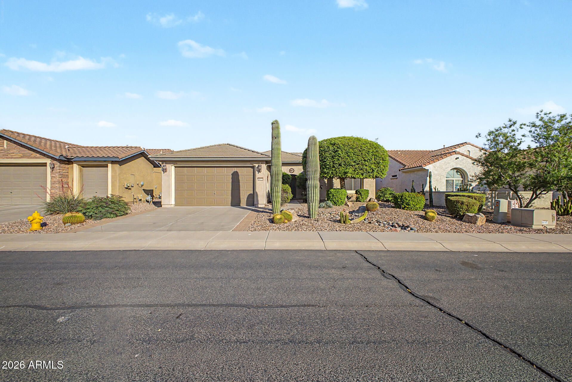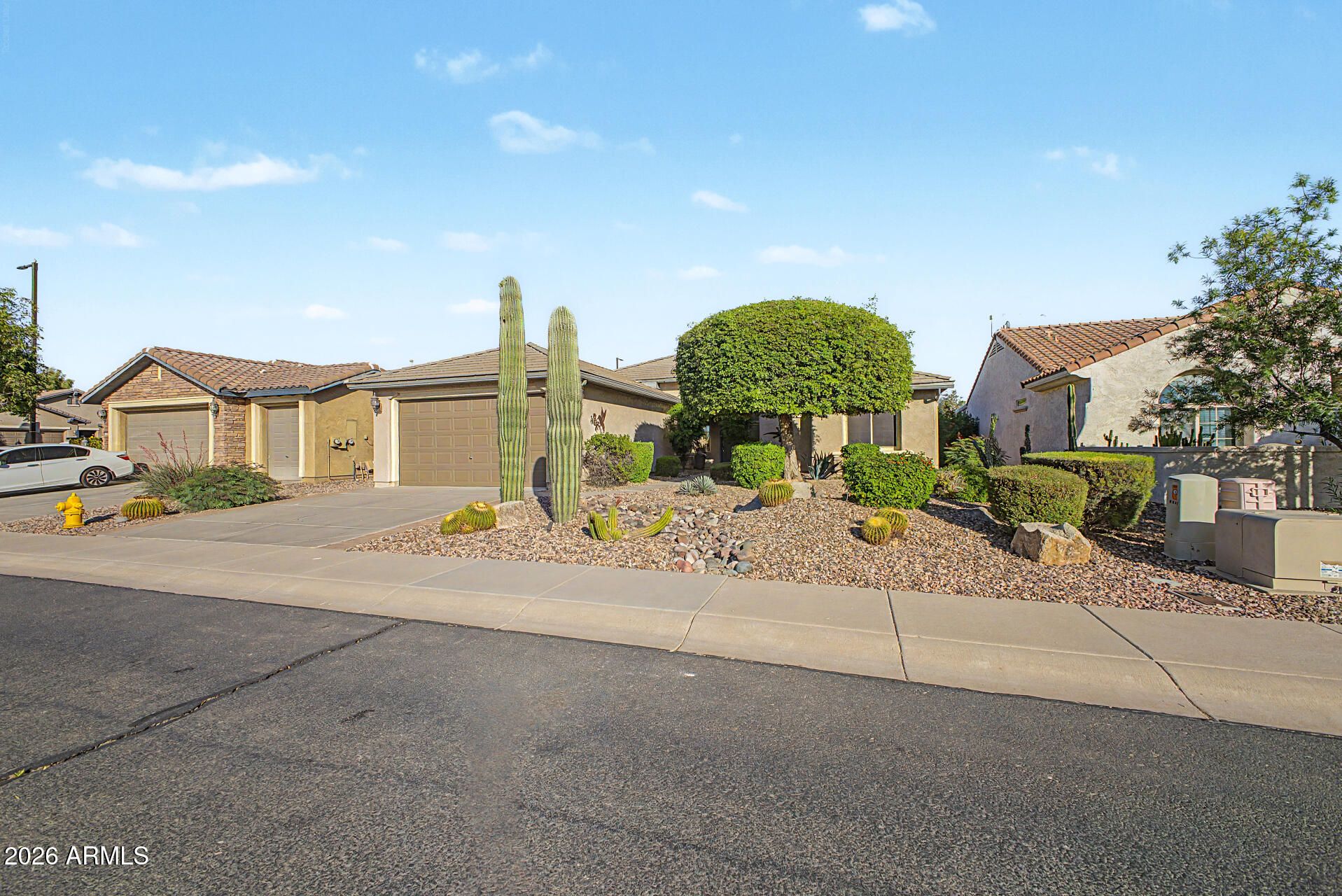 Home, sweet home! This 2-bedroom, 2-bath residence in the adult Community of Anthem at Merrill Ranch showcases a 2-car garage and a lovely desert landscape. Discover a captivating open layout with high ceilings, a neutral palette, blinds, and durable tile flooring. The kitchen features a breakfast nook, solid surface counters, ample wood cabinetry with crown moulding, recessed lighting, SS appliances, and a two-tier peninsula with a breakfast bar. You'll also find a cozy den ideal for an office or a quiet study. The primary bedroom boasts soft carpeting, a sitting nook, an ensuite with dual sinks, and a convenient walk-in closet. Imagine enchanting evenings in the charming backyard, complete with a covered patio, travertine pavers, and a built-in BBQ for weekend grills. Make it yours now!