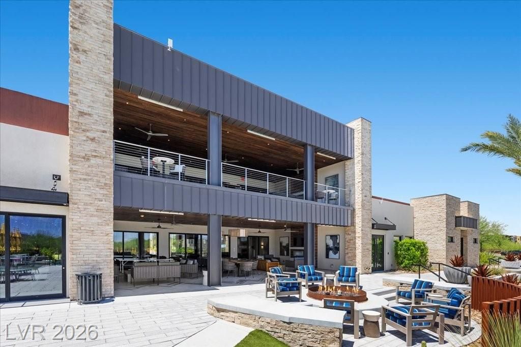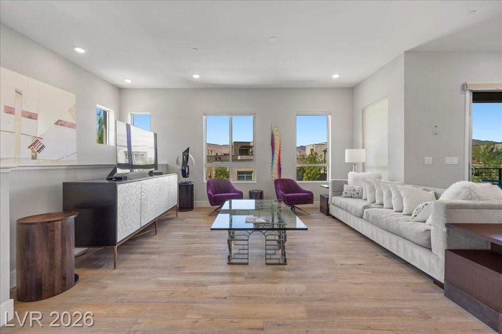 Welcome to this stunning home in the prestigious 55+ Trilogy Summerlin community. This 2-story, corner lot condo features a private in-home elevator. Upstairs offers a great room and a gourmet kitchen with GE Café appliances, William Sonoma lighting, gleaming quartz countertops, and an oversized island. Glazed porcelain plank tile flooring, a dining room statement chandelier, custom window treatments, and smart-home enhancements elevate the design. Spa-inspired primary suite includes a spacious walk-in California Closet. The downstairs office/den can be transformed into a third bedroom. Enjoy year-round outdoor living from the private balcony. Additional highlights include ADT security, and a reverse osmosis system with water softener. Experience resort-style amenities at the Outlook Club, including a game room, sparkling pool and spa, state-of-the-art fitness center, and pickleball courts. This Summerlin location is minutes from shopping, dining, and walking trails.