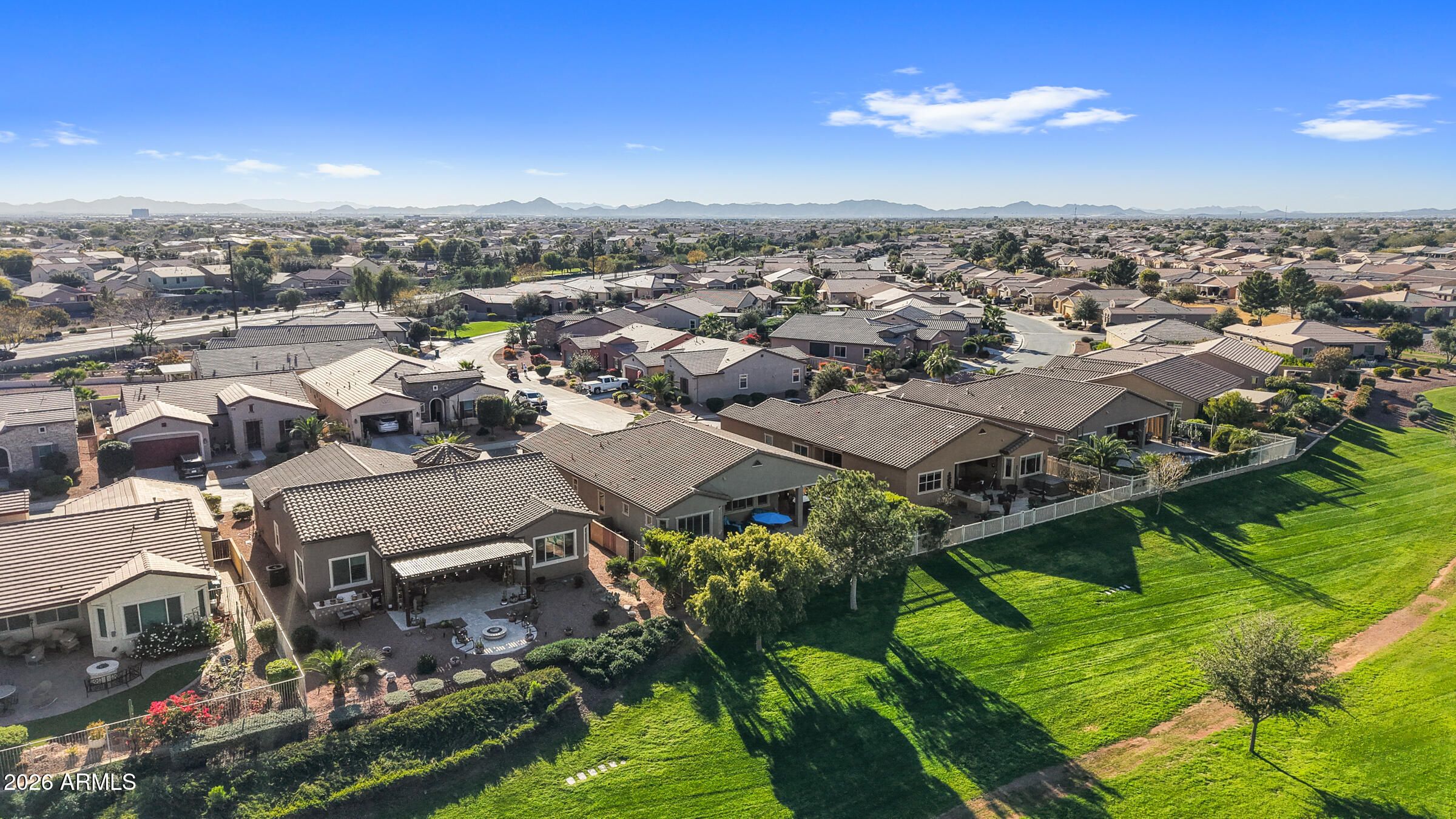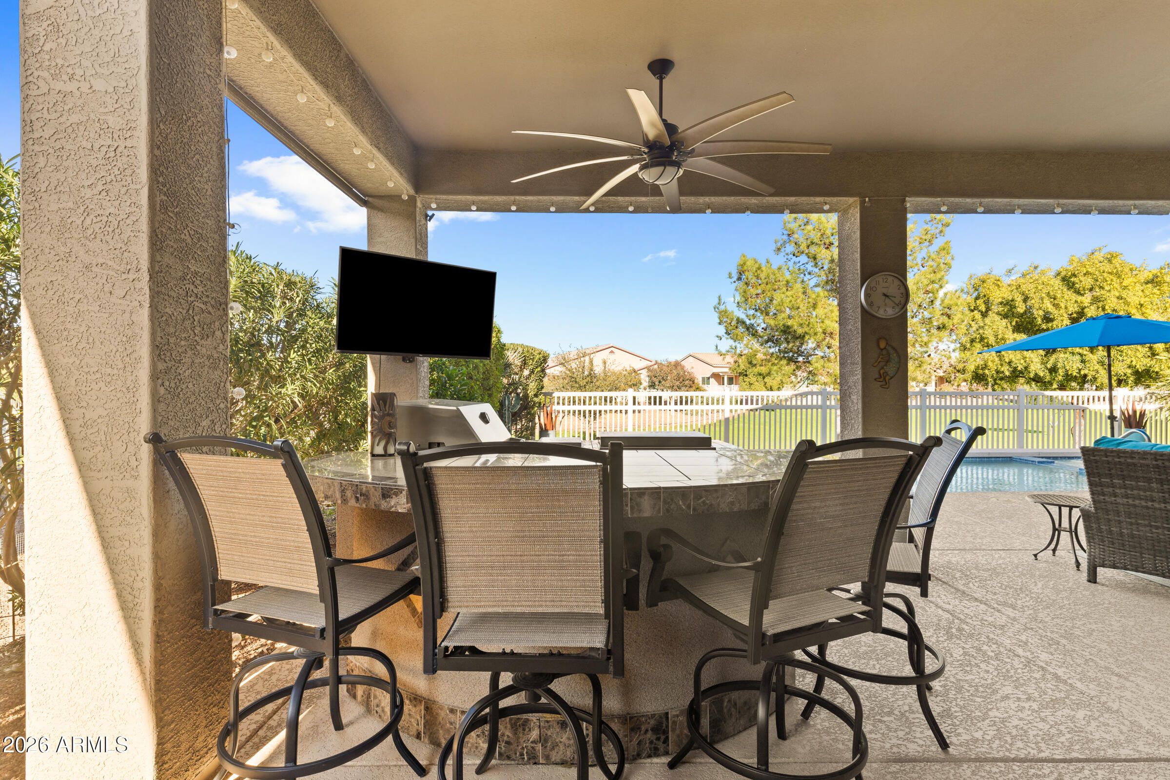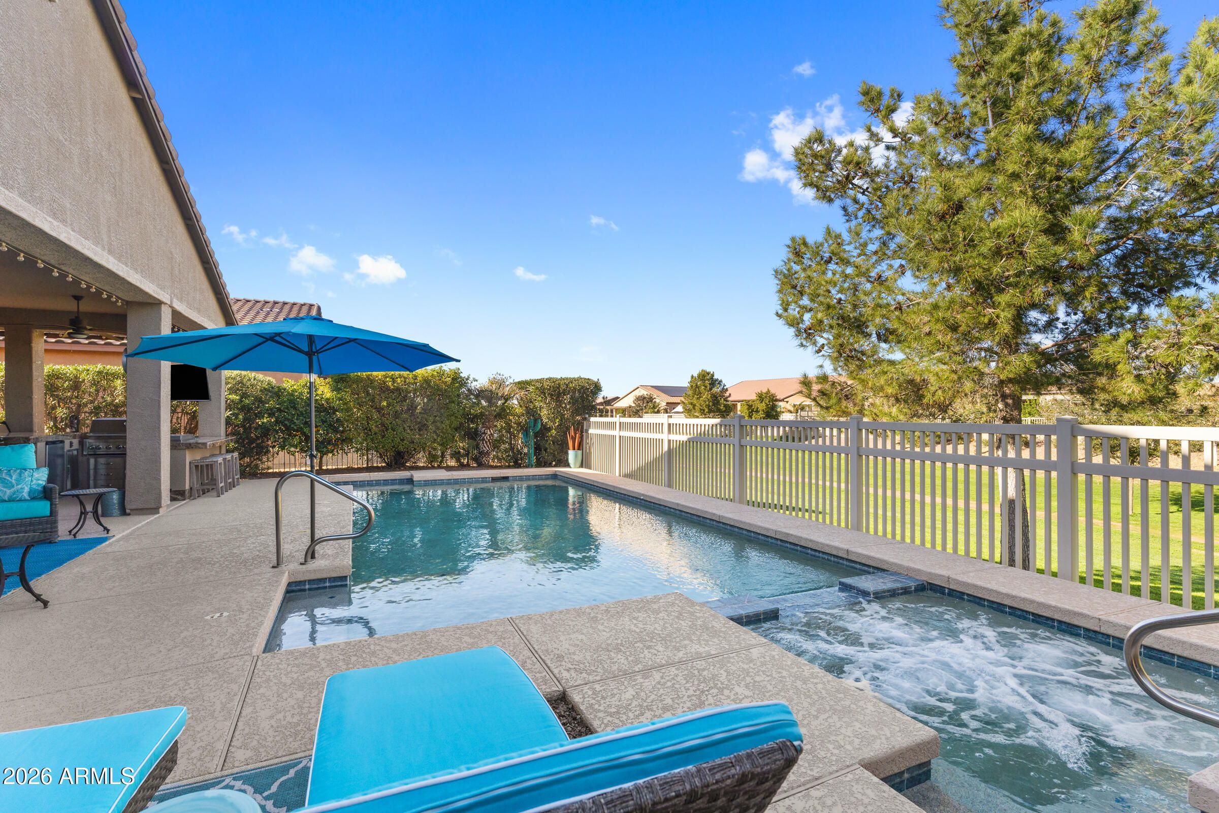 HONEY, STOP THE CAR! This stunning Redding floor plan with a pool and greenbelt views is located in the award-winning active adult community of Province. Truly model-perfect, this home must be seen in person to appreciate its beauty. A charming front courtyard welcomes you—ideal for morning coffee. Inside, enjoy a coffered entry ceiling, modern 12''x24'' tile throughout, and elegant plantation shutters. The gourmet kitchen shines with pristine white cabinetry, quartz countertops, a custom tile backsplash, and a massive island. KitchenAid stainless steel appliances include gas cooking and double ovens, plus a walk-in pantry. This great room split floor plan offers three full bedrooms, each with walk-in closets, plus a custom barn door providing privacy for guest rooms and bath. A versatile den serves as the perfect flex space. The backyard is a true oasis with a built-in outdoor kitchen featuring a grill, griddle, burners, fridge, granite-tile bar top, and ample storage. Enjoy a huge covered patio with three ceiling fans, a gas-heated pool (31' x 14') with Baja shelf and seating bench, and a relaxing hot tub with direct access from the primary suite. Mature landscaping, vinyl fencing with three gates, and extensive upgrades throughout complete this exceptional home. Additional highlights include a patio sun shade, gutters, bird prevention, and a paver sidewalk leading to the side trash enclosure. The home offers a security front door, keyless entry, and a lockbox at the garage. Plush carpeting enhances all bedrooms, while the primary suite features a bay window, dual vanities, and a walk-in closet with a custom organization system. The extended length garage is well equipped with six heavy-duty overhead storage racks and a shelving unit. Enjoy whole-house water filtration with soft water and RO systems, a privacy wall for pool equipment, and a backyard with an orange and lemon tree. Eight-foot doors, pendant island lighting, upgraded fixtures, a laundry room with cabinets, sink, and extra pantry, plus Wi-Fi thermostats, pool controls, garage door, and irrigation system add modern convenience. Conveying items include select bar seating, TVs, courtyard furniture, wrought iron art, outdoor pots, and protective covers for all included outdoor furnishings.