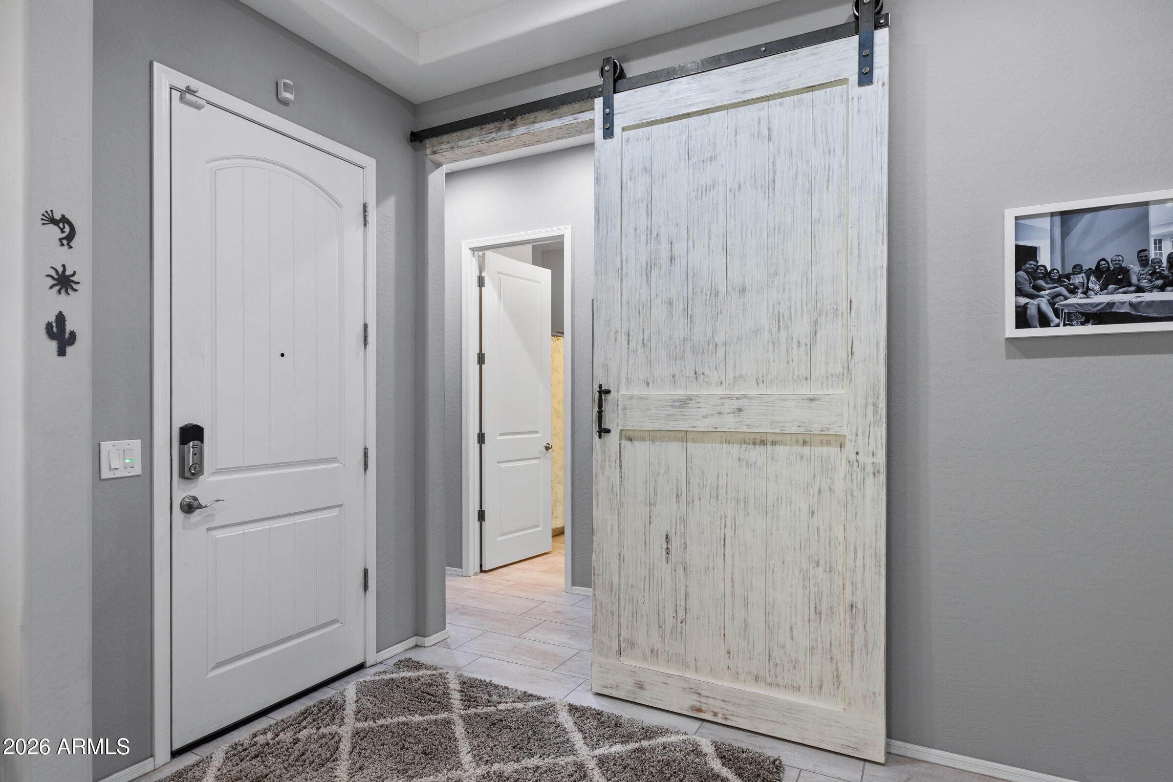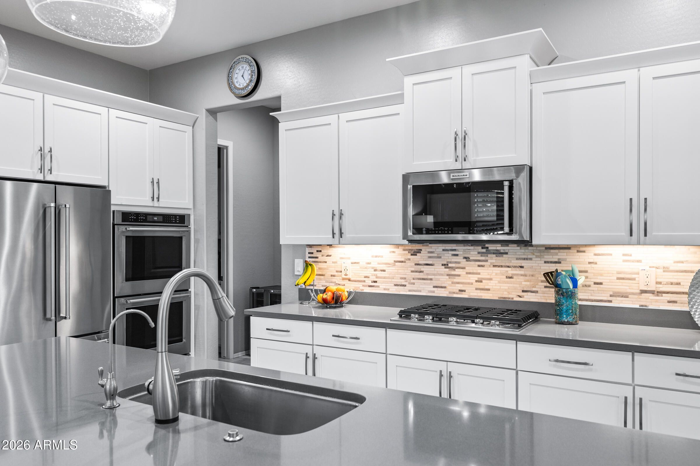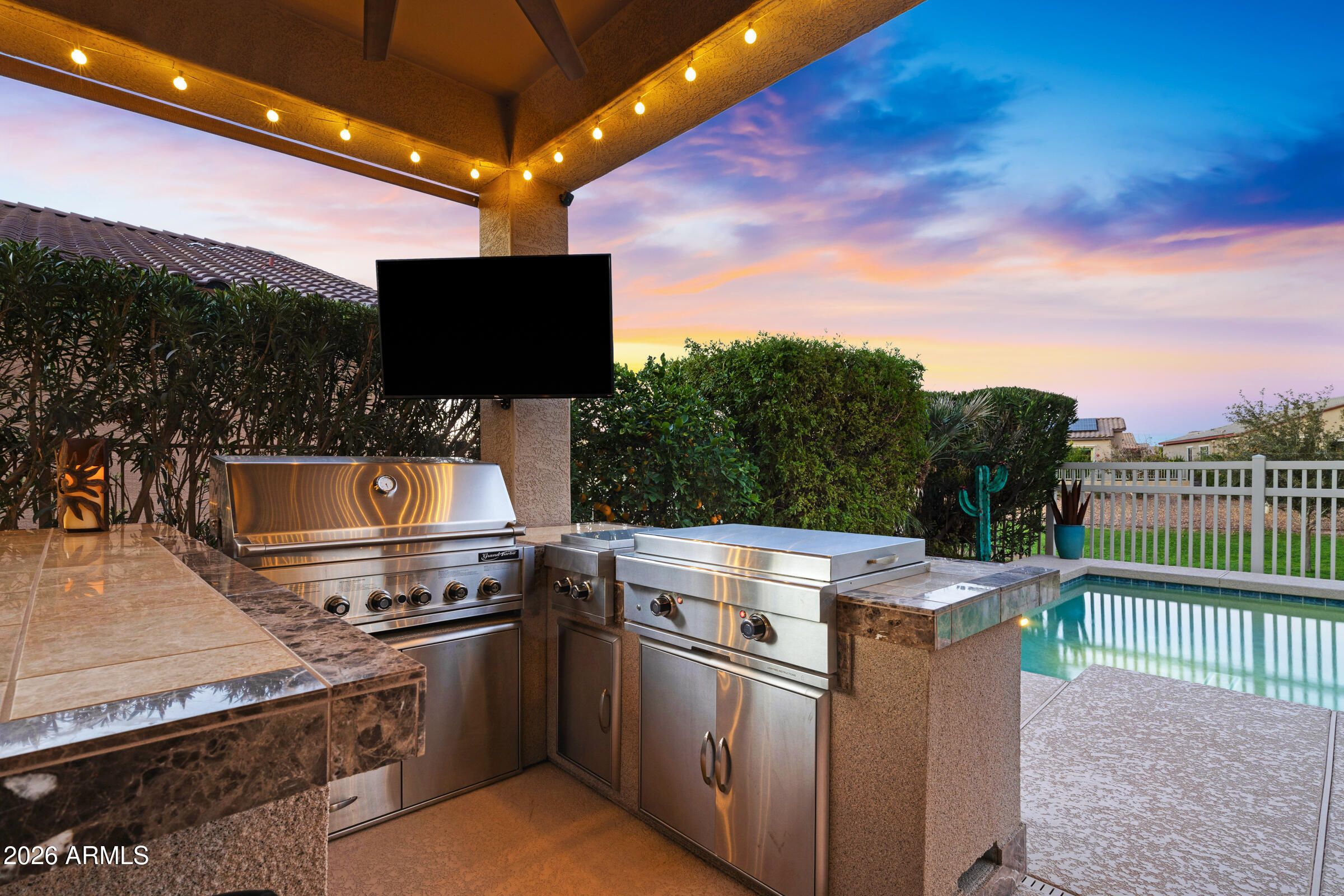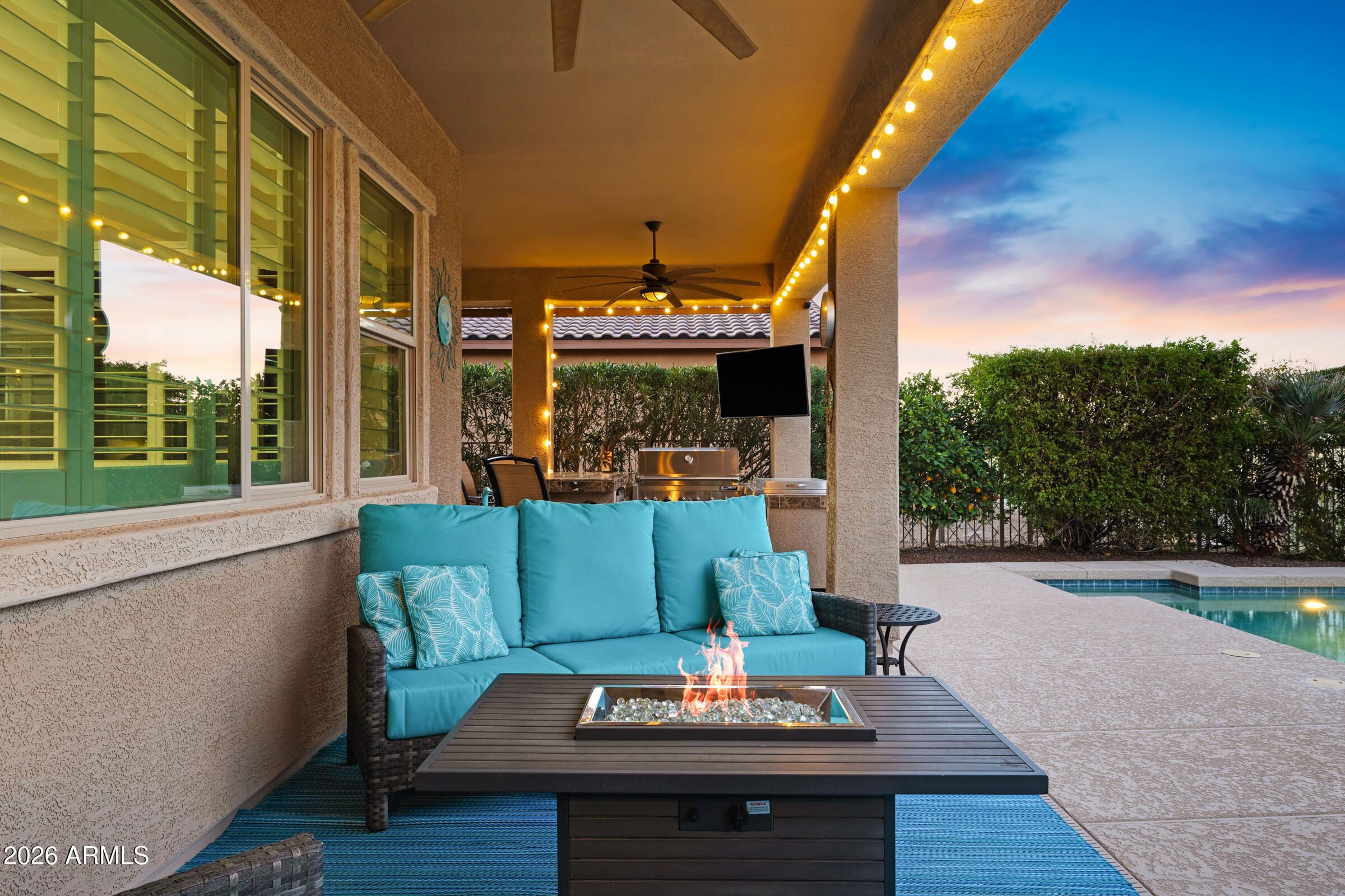 HONEY, STOP THE CAR! This stunning Redding floor plan with a pool and greenbelt views is located in the award-winning active adult community of Province. Truly model-perfect, this home must be seen in person to appreciate its beauty. A charming front courtyard welcomes you—ideal for morning coffee. Inside, enjoy a coffered entry ceiling, modern 12''x24'' tile throughout, and elegant plantation shutters. The gourmet kitchen shines with pristine white cabinetry, quartz countertops, a custom tile backsplash, and a massive island. KitchenAid stainless steel appliances include gas cooking and double ovens, plus a walk-in pantry. This great room split floor plan offers three full bedrooms, each with walk-in closets, plus a custom barn door providing privacy for guest rooms and bath. A versatile den serves as the perfect flex space. The backyard is a true oasis with a built-in outdoor kitchen featuring a grill, griddle, burners, fridge, granite-tile bar top, and ample storage. Enjoy a huge covered patio with three ceiling fans, a gas-heated pool (31' x 14') with Baja shelf and seating bench, and a relaxing hot tub with direct access from the primary suite. Mature landscaping, vinyl fencing with three gates, and extensive upgrades throughout complete this exceptional home. Additional highlights include a patio sun shade, gutters, bird prevention, and a paver sidewalk leading to the side trash enclosure. The home offers a security front door, keyless entry, and a lockbox at the garage. Plush carpeting enhances all bedrooms, while the primary suite features a bay window, dual vanities, and a walk-in closet with a custom organization system. The extended length garage is well equipped with six heavy-duty overhead storage racks and a shelving unit. Enjoy whole-house water filtration with soft water and RO systems, a privacy wall for pool equipment, and a backyard with an orange and lemon tree. Eight-foot doors, pendant island lighting, upgraded fixtures, a laundry room with cabinets, sink, and extra pantry, plus Wi-Fi thermostats, pool controls, garage door, and irrigation system add modern convenience. Conveying items include select bar seating, TVs, courtyard furniture, wrought iron art, outdoor pots, and protective covers for all included outdoor furnishings.