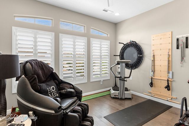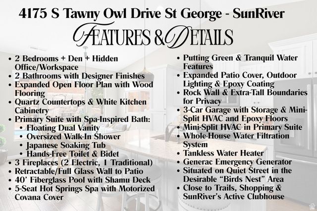 55+ living in SunRiver with a PRIVATE POOL and spa in one of the most desirable active adult communities in St George. This thoughtfully upgraded home offers 2 bedrooms plus a den and an additional small office or hidden room, providing flexibility or a dedicated workspace. The renovated primary bath features a luxury walk in shower and a Japanese soaking tub, creating a true spa experience at home. Mini split systems in the primary suite and garage provide customized climate control year round. Wood floors, quartz countertops, designer and artistic finishes, and a bright open layout deliver both comfort and refined style. A full glass wall opens to an expanded patio, creating seamless indoor outdoor living that takes full advantage of Southern Utah's climate. The 3 car garage offers generous space for vehicles, storage, or golf cart parking. The backyard is designed for both relaxation and entertaining with a private pool, spa, putting green, and low maintenance landscaping that delivers a resort style setting without the upkeep. Situated on a quiet street away from freeway and close to river walking trails, golf, clubhouse amenities, pickleball, indoor and outdoor pools, fitness center, dining, and year round social activities. Exceptionally maintained, this is a standout pool home in SunRiver for buyers seeking high-end 55+ living in St George.