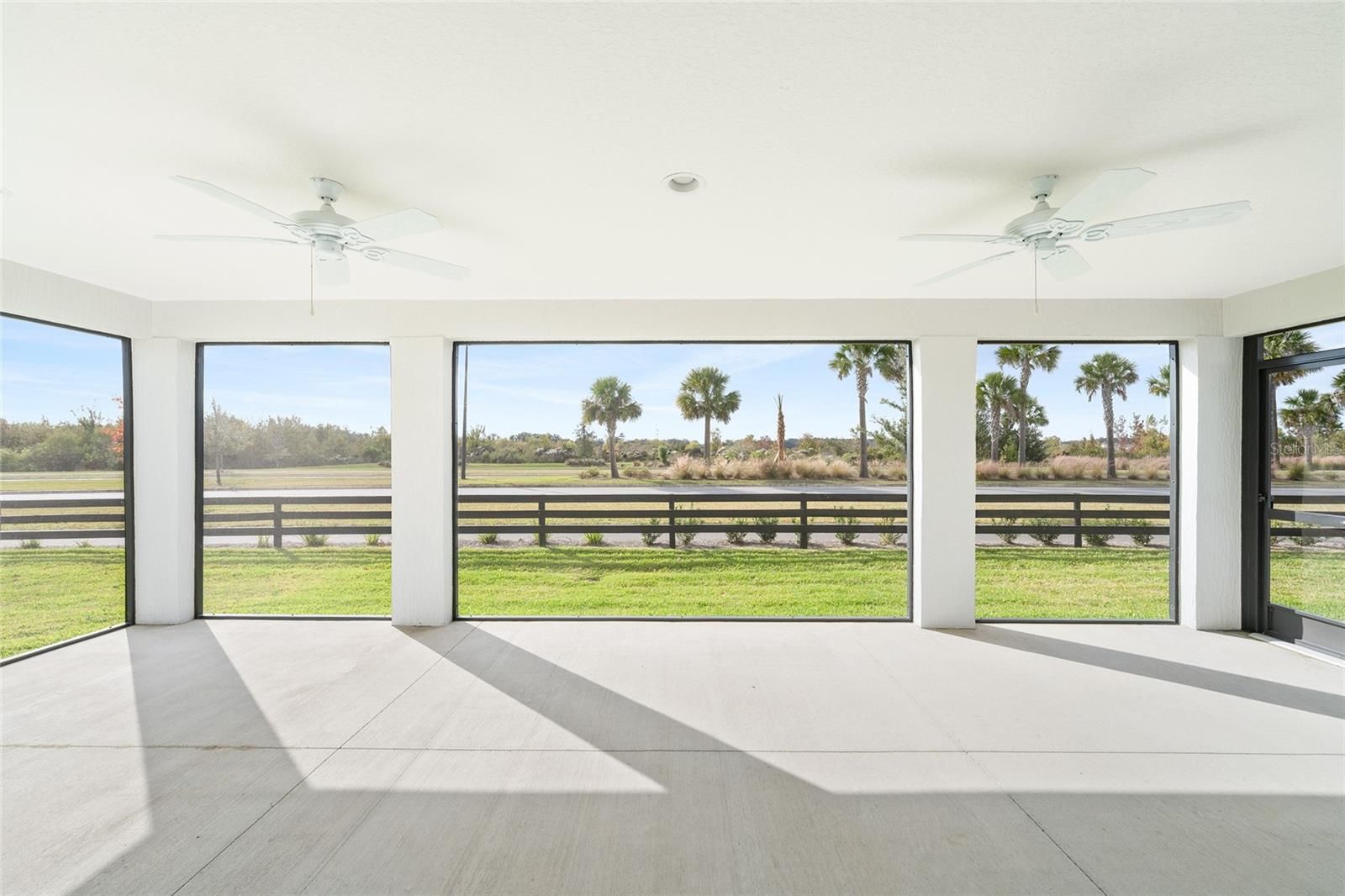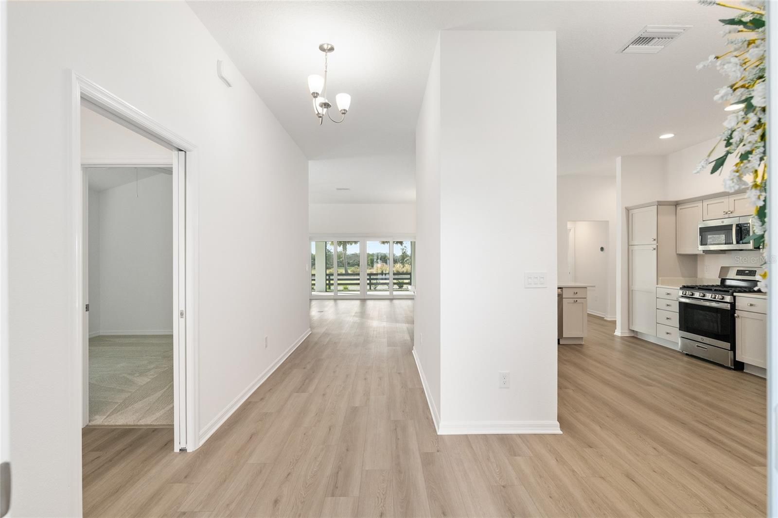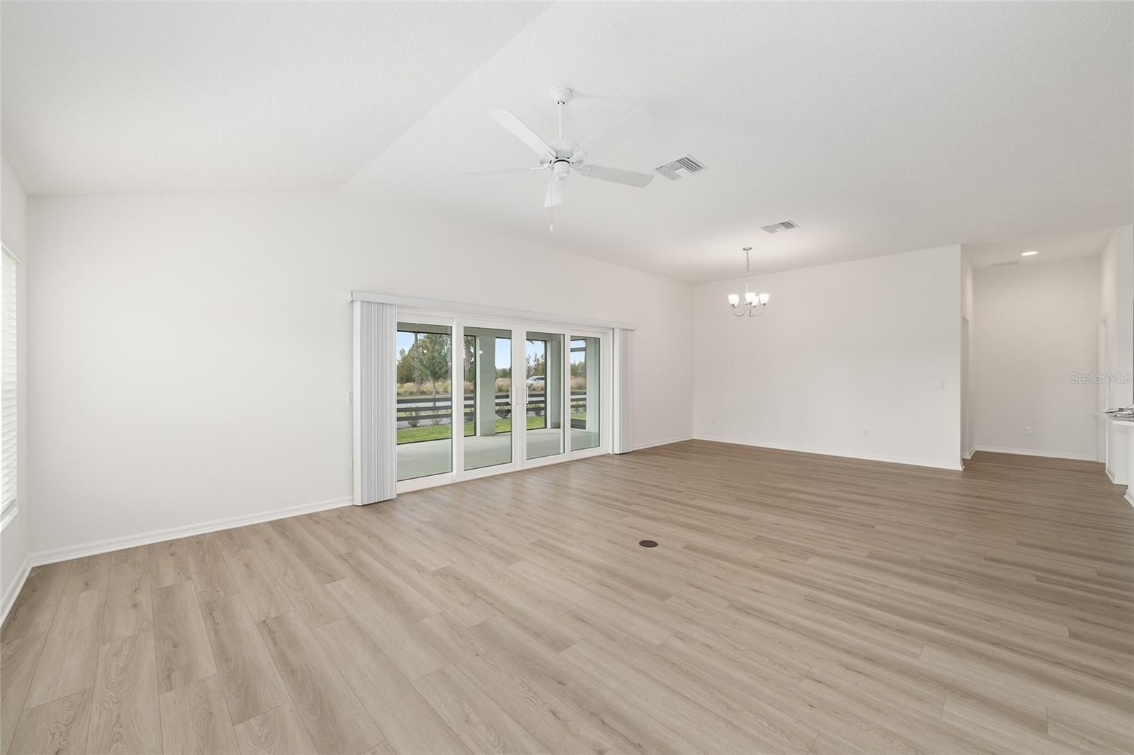 STUNNING BARELY LIVED IN MOCKINGBIRD MODEL WITH 2-CAR + GOLF CART GARAGE IN THE VILLAGE OF RICHMOND! This beautifully designed home offers the ideal blend of space, upgrades, and true Florida lifestyle living in one of The Villages’ most desirable areas. As soon as you arrive, you will appreciate the PROFESSIONALLY LANDSCAPED YARD. Inside, you’ll love the OPEN-CONCEPT FLOOR PLAN featuring LUXURY VINYL PLANK FLOORING throughout the main living areas, a spacious kitchen with QUARTZ COUNTERTOPS, STAINLESS STEEL GAS APPLIANCES, and LOTS OF CABINET SPACE—perfect for both everyday living and entertaining. The thoughtful SPLIT BEDROOM DESIGN provides privacy for guests, with CARPETED GUEST BEDROOMS and a guest bath offering a TILED TUB/SHOWER COMBINATION WITH LINEN CLOSET. The owner’s suite is a true retreat with TRAY CEILING, DUAL WALK-IN CLOSETS, DUAL SINKS, and a stunning ROMAN SHOWER. Additional interior features include a convenient INSIDE LAUNDRY ROOM, HIGH CEILINGS, and FANS IN EACH ROOM. Step outside to enjoy the oversized, large-screened lanai with an OPEN VIEW AND NO KISSING LANAIS, offering privacy and peaceful outdoor living. There is also PLENTY OF ROOM FOR A POOL OR ADDITION, making this home ideal for future expansion or creating your own outdoor oasis. The highly desirable 2-CAR + GOLF CART GARAGE provides ample space for vehicles, storage, and all your recreational toys. PRIME RICHMOND LOCATION! Located in the highly sought-after Village of Richmond, you are just minutes from Brownwood Paddock Square for shopping, dining, live entertainment, and movies, along with multiple championship and executive golf courses, state-of-the-art recreation centers, pools, fitness centers, and pickleball courts. Daily conveniences such as grocery stores, medical facilities, and banking are close by, with easy access to CR 466A and Florida’s Turnpike. This Mockingbird model is ideal as a full-time residence, seasonal retreat, or luxury retirement home in The Villages.