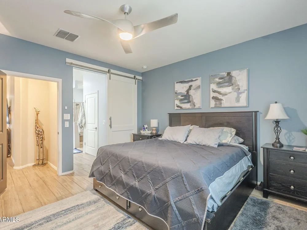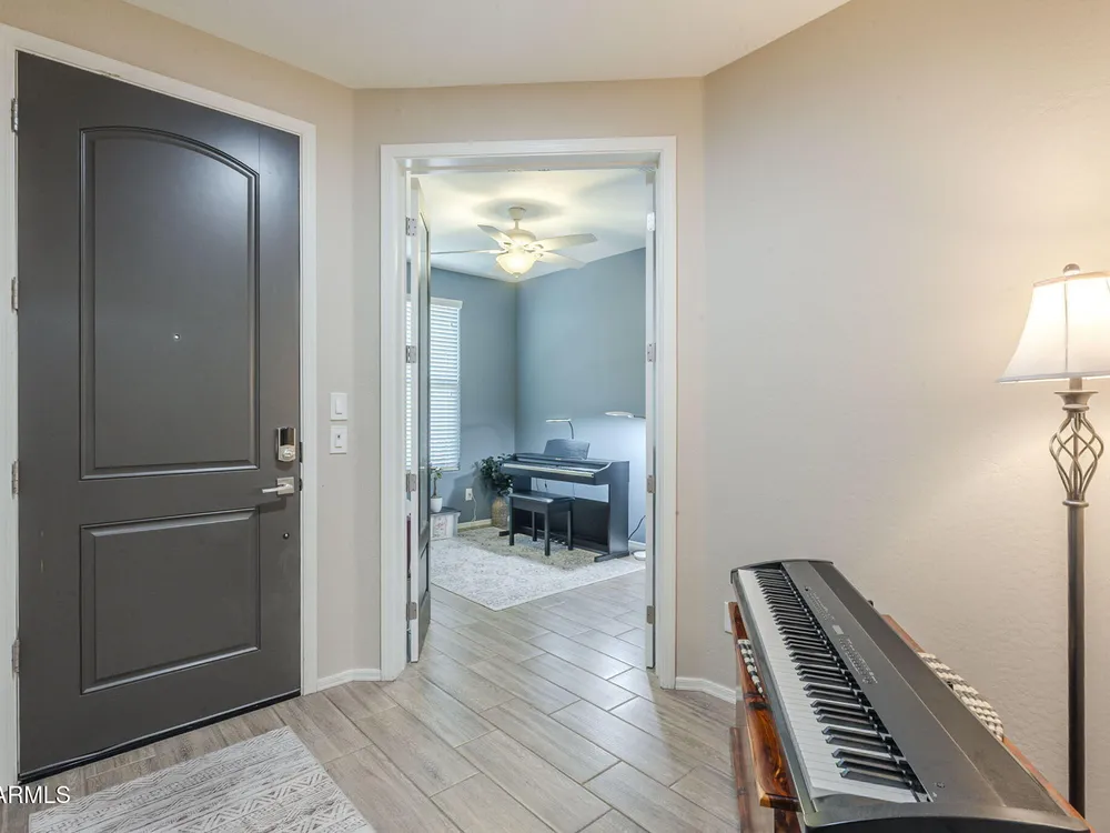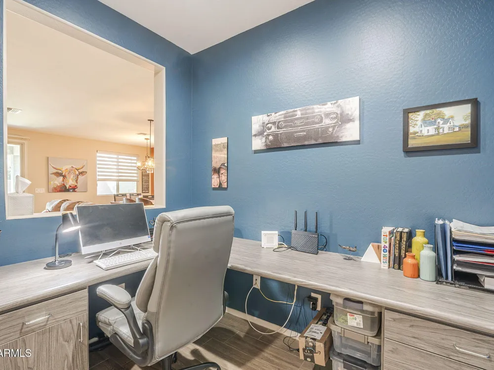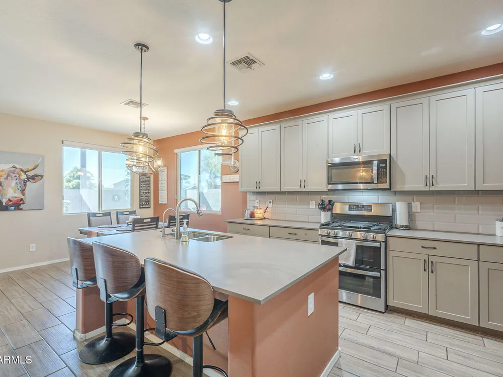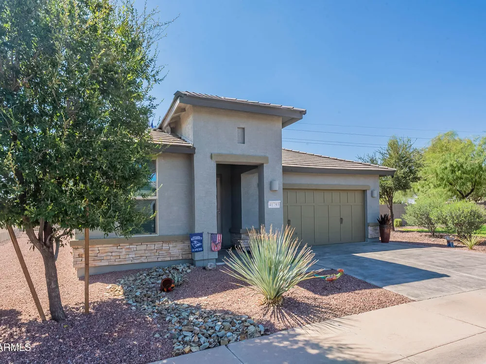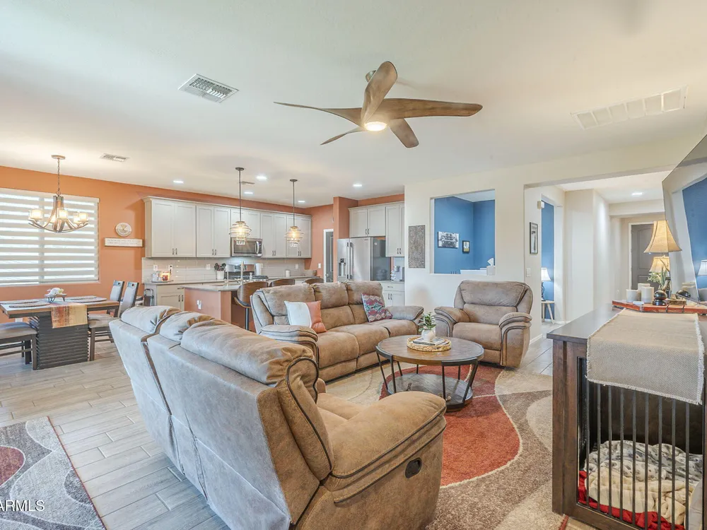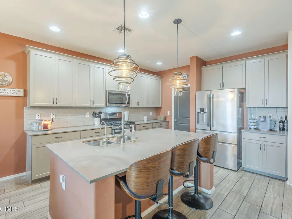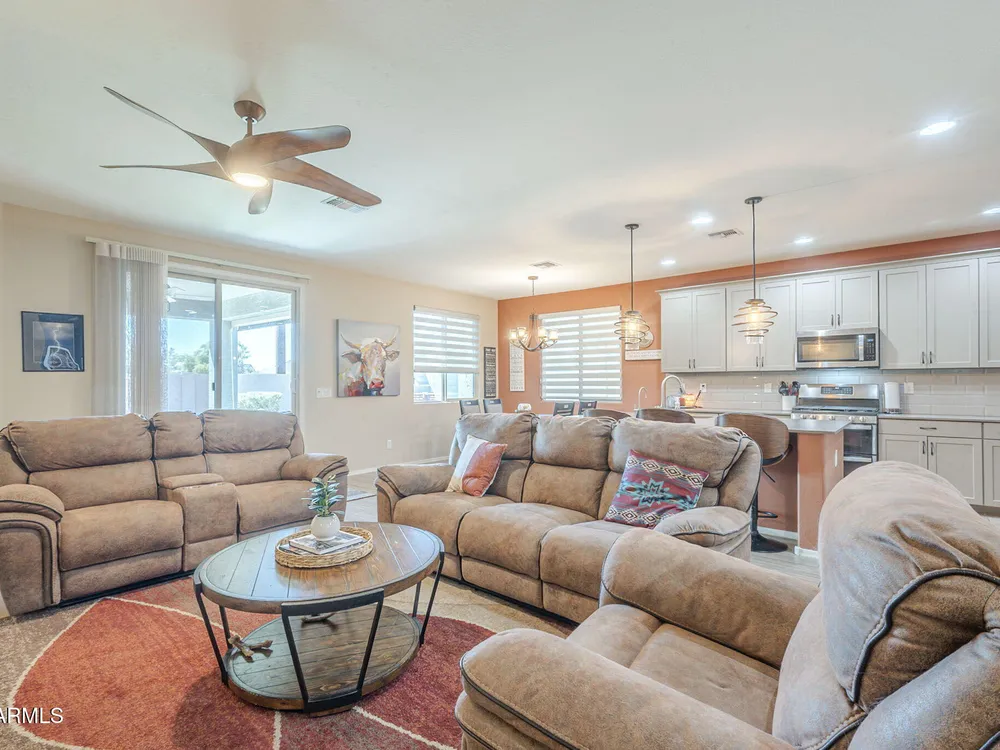 Welcome to the ever-popular Presley model, boasting beautiful curb appeal and ideally situated next to a greenbelt for added privacy and charm. Step through the inviting foyer into a versatile flex room—perfect for a guest suite, workout space, or additional sitting area. This unique floor plan also features a convenient office nook with a built-in desk, ideal for remote work or study. The open family room and remodeled kitchen blend warmth and style with sleek quartz countertops, 42'' cabinets, and designer finishes. Retreat to the primary suite with its oversized walk-in shower, custom closet, and blackout shades for ultimate comfort. Additional upgrades include a coated driveway, epoxy garage floors, updated lighting and ceiling fans, along with fresh interior and exterior paint. The oversized, low-maintenance backyard is an entertainer's dream with a built-in BBQ kitchen, perfect for hosting gatherings year-round. This Presley model offers the perfect mix of function, upgrades, and lifestyledon't miss your chance to call it home!