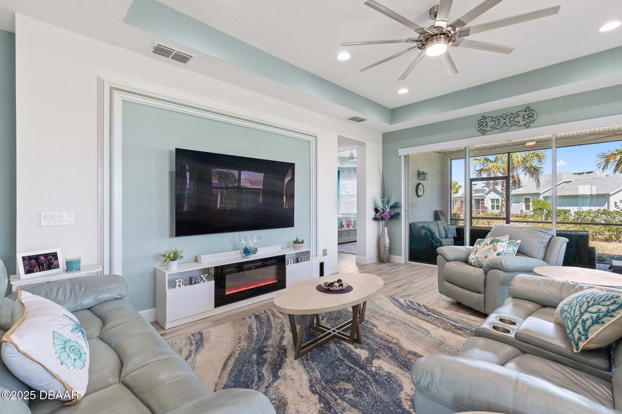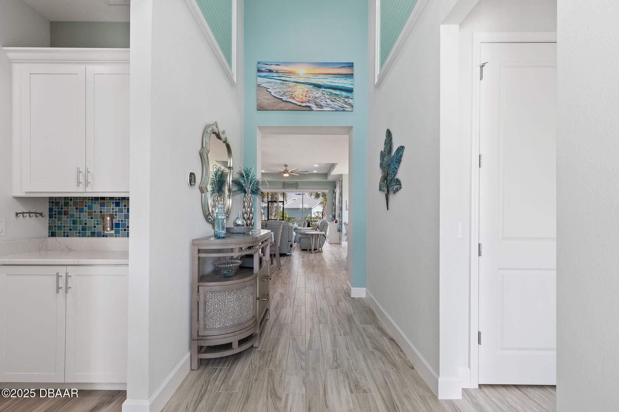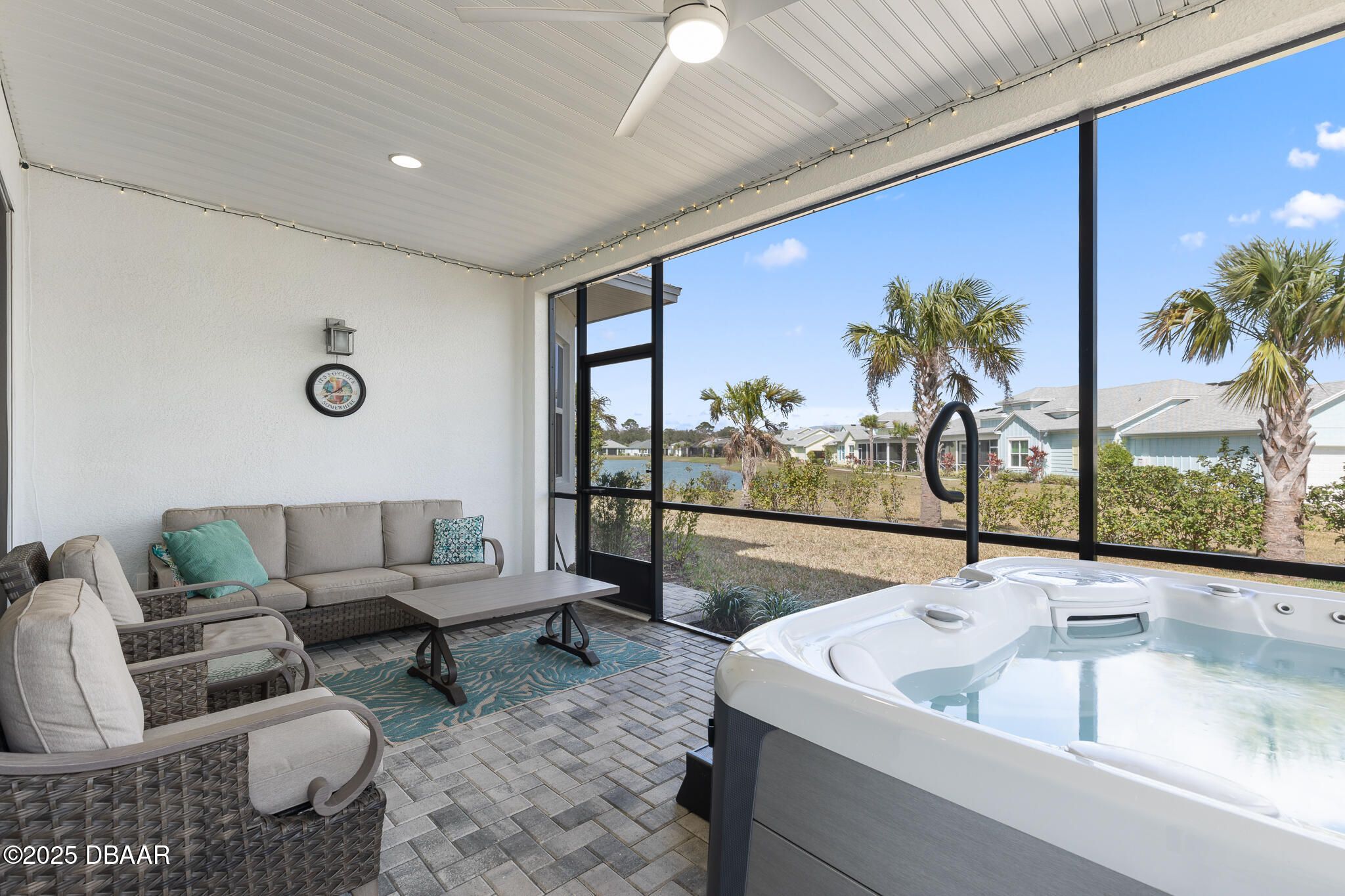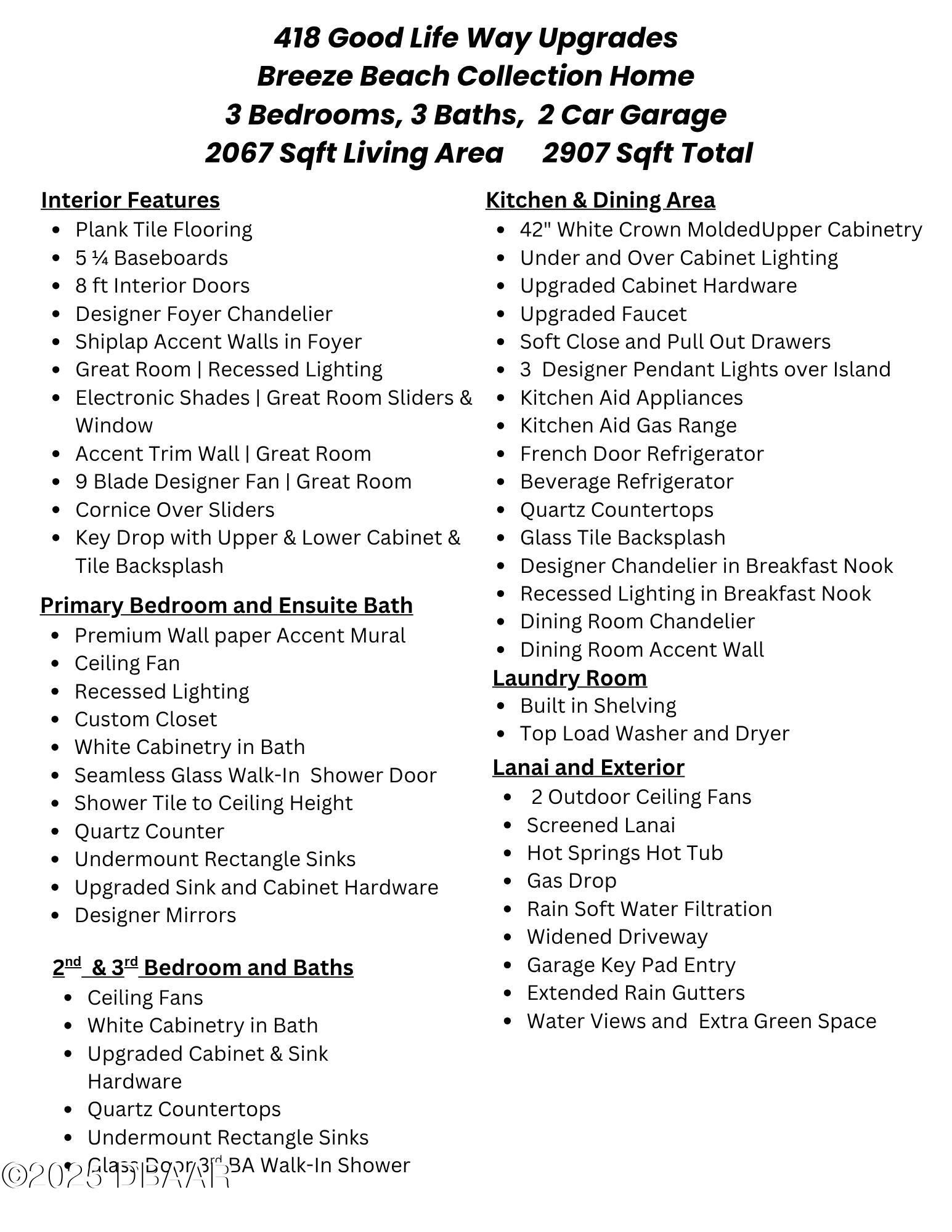 Unique location & expansive feel to the lot w/ green space. Escape to Paradise in this RARE 3 BD 3 BA BREEZE Model Home. Upgrades galore beginning with shiplap & paint accented foyer, key drop with upper and lower cabinets plus tile backsplash. Enter the beautifully upgraded kitchen,quartz countertops, glass tile backsplash, white cabinetry, KitchenAid S/S appliances, beverage fridge, large island w/ 3 designer pendants & breakfast nook. Inviting Great Room has accent trimmed wall, fireplace, recessed lighting, 9 blade fan, cornices & electronic controlled shades over sliders & windows. Beautiful primary bedroom, wave detail wall, custom walk-in closet & large ensuite spa like bathroom. Relax on your screened lanai in the Hot Springs hot tub viewing the pond! Rainsoft Water filtration, gas drop on lanai & widened driveway. 5 star amenities feature paradise pool, private beach club, restaurant & bar, fitness center, theatre, card rooms, woodworkshop, gated community & so much more
